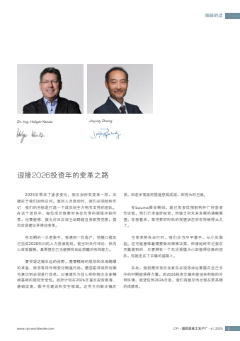 %u7f16%u8f91%u7684%u8bddDr.-Ing. Holger Karutz Jinying Zhang2025%u5e74%u5e26%u6765%u4e86%u8bf8%u591a%u53d8%u5316%uff0c%u800c%u6b63%u5982%u6240%u6709%u53d8%u9769%u4e00%u6837%uff0c%u5173%u952e%u5728%u4e8e%u6211%u4eec%u5982%u4f55%u5e94%u5bf9%u3002%u9762%u5bf9%u4eba%u5458%u53d8%u52a8%u65f6%uff0c%u6211%u4eec%u5fc5%u987b%u59cb%u7ec8%u7262%u8bb0%uff1a%u6211%u4eec%u7684%u76ee%u6807%u662f%u6253%u9020%u4e00%u4e2a%u6210%u5458%u95f4%u5168%u529b%u76f8%u4e92%u652f%u6301%u7684%u56e2%u961f%u3002%u5728%u8fd9%u4e2a%u56e2%u961f%u4e2d%uff0c%u6bcf%u4f4d%u6210%u5458%u65e2%u8981%u5bf9%u5404%u81ea%u8d1f%u8d23%u7684%u9886%u57df%u5c3d%u804c%u5c3d%u8d23%uff0c%u4e5f%u8981%u80fd%u591f%u3001%u88ab%u5141%u8bb8%u4e14%u5e94%u8be5%u4e3b%u52a8%u8de8%u8d8a%u81ea%u8eab%u804c%u8d23%u8303%u56f4%uff0c%u63d0%u51fa%u6539%u8fdb%u5efa%u8bae%u5e76%u63a8%u52a8%u53d8%u9769%u3002%u5728%u8fd1%u671f%u7684%u4e00%u6b21%u5dee%u65c5%u4e2d%uff0c%u6211%u9047%u5230%u4e00%u4f4d%u5ba2%u6237%uff0c%u4ed6%u968f%u53e3%u63d0%u53ca%u5df2%u5b8c%u62102028%u5e74(!)%u7684%u4eba%u529b%u8d44%u6e90%u89c4%u5212%u3002%u6211%u5f53%u65f6%u672a%u4f5c%u8bc4%u8bba%uff0c%u4f46%u5185%u5fc3%u6df1%u53d7%u9707%u64bc%uff0c%u771f%u5e0c%u671b%u81ea%u5df1%u4e5f%u80fd%u62e5%u6709%u5982%u6b64%u524d%u77bb%u7684%u5e03%u5c40%u80fd%u529b%u3002%u8981%u5b9e%u73b0%u8fd9%u822c%u957f%u8fdc%u7684%u89c6%u91ce%uff0c%u9700%u8981%u7cbe%u7ec6%u7684%u89c4%u5212%u548c%u672a%u96e8%u7ef8%u7f2a%u7684%u51c6%u5907%uff0c%u800c%u975e%u7b49%u5f85%u5916%u90e8%u53d8%u5316%u5012%u903c%u884c%u52a8%u3002%u5fb7%u56fd%u8054%u90a6%u653f%u5e9c%u8fd1%u671f%u4e5f%u610f%u8bc6%u5230%u5fc5%u987b%u8fdb%u884c%u6539%u9769%uff0c%u4ee5%u91cd%u5efa%u4f5c%u4e3a%u4fe1%u5fc3%u548c%u79ef%u6781%u4f01%u4e1a%u5bb6%u7cbe%u795e%u57fa%u7840%u7684%u89c4%u5212%u5b89%u5168%u6027%u3002%u653f%u5e9c%u8ba1%u5212%u57282026%u5e74%u91cd%u70b9%u6295%u8d44%u6559%u80b2%u3001%u57fa%u7840%u8bbe%u65bd%u3001%u6570%u5b57%u5316%u5efa%u8bbe%u548c%u5b89%u5168%u9886%u57df%u3002%u8fd9%u4e9b%u65b9%u5411%u90fd%u6b63%u786e%u65e0%u8bef%uff0c%u4f46%u82e5%u5750%u7b49%u653f%u5e9c%u63aa%u65bd%u663e%u73b0%u6210%u6548%uff0c%u5219%u5c06%u4e3a%u65f6%u5df2%u665a%u3002%u5728bauma%u5c55%u4f1a%u671f%u95f4%uff0c%u5c31%u5df2%u6709%u591a%u4f4d%u9884%u5236%u6784%u4ef6%u5382%u7ecf%u8425%u8005%u544a%u8bc9%u6211%uff0c%u4ed6%u4eec%u5df2%u51c6%u5907%u597d%u6295%u8d44%uff0c%u4f46%u7f3a%u4e4f%u5bf9%u672a%u6765%u53d1%u5c55%u7684%u6e05%u6670%u5c55%u671b%u3002%u5728%u6211%u770b%u6765%uff0c%u7b49%u5f85%u66f4%u597d%u65f6%u673a%u7684%u89c2%u671b%u72b6%u6001%u5b9e%u5728%u6301%u7eed%u5f97%u592a%u4e45%u4e86%u3002%u5f53%u53d8%u9769%u52bf%u5728%u5fc5%u884c%u65f6%uff0c%u6211%u4eec%u5e94%u5f53%u5c3d%u65e9%u7740%u624b%uff0c%u4ece%u5c0f%u5904%u505a%u8d77%u3002%u8fd9%u53ef%u80fd%u610f%u5473%u7740%u9700%u8981%u505a%u51fa%u8270%u96be%u51b3%u7b56%uff0c%u4f46%u8bf7%u59cb%u7ec8%u7262%u8bb0%u6211%u5728%u5f00%u7bc7%u63d0%u5230%u7684%uff1a%u53ea%u8981%u62e5%u6709%u4e00%u4e2a%u65e0%u8bba%u89c4%u6a21%u5927%u5c0f%u5374%u503c%u5f97%u4fe1%u8d56%u7684%u56e2%u961f%uff0c%u4f60%u5c31%u8d70%u5728%u4e86%u6b63%u786e%u7684%u9053%u8def%u4e0a%u3002%u5728%u6b64%uff0c%u6211%u795d%u613f%u6240%u6709%u4f01%u4e1a%u5bb6%u5728%u5fc5%u987b%u5c06%u547d%u8fd0%u638c%u63e1%u5728%u81ea%u5df1%u624b%u4e2d%u7684%u65f6%u671f%u80fd%u83b7%u5f97%u529b%u91cf%u3002%u82e52026%u6295%u8d44%u5e74%u786e%u5b9e%u80fd%u8fce%u6765%u79ef%u6781%u7684%u5916%u90e8%u73af%u5883%uff0c%u6211%u575a%u4fe1%u52302026%u5e74%u5e95%uff0c%u6211%u4eec%u5c06%u80fd%u4ea4%u51fa%u6bd4%u73b0%u5728%u66f4%u4eae%u773c%u7684%u6210%u7ee9%u5355%u3002%u8fce%u63a52026%u6295%u8d44%u5e74%u7684%u53d8%u9769%u4e4b%u8defwww.cpi-worldwide.com CPI %u2013 %u56fd%u9645%u6df7%u51dd%u571f%u751f%u4ea7%u5382 %u2013 6 | 2025 3