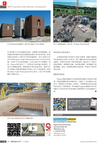 Progress 3D Concrete PrintingJulius-Durst-Stra%u00dfe 10039042 Brixen, ItalyT +39 0472 9791003d@progress-m.com%u62a5%u544a%u89c6%u9891 www.progress-3d.com30 CPI %u2013 %u56fd%u9645%u6df7%u51dd%u571f%u751f%u4ea7%u5382 %u2013 6 | 2025 www.cpi-worldwide.com%u5904%u4e8e%u6bdb%u576f%u72b6%u6001%u7684%u5ea6%u5047%u5c4b%uff0c%u914d%u6709 3D %u6df7%u51dd%u571f%u6253%u5370%u7acb%u9762%u6784%u4ef6%u7528%u4e8e Pareus %u5ea6%u5047%u6751%u7684 3D %u6253%u5370%u5899%u4f53%u6784%u4ef6%u4f4d%u4e8e%u5361%u5965%u52d2%u5ea6%u5047%u5730%uff08%u610f%u5927%u5229%uff09%u7684 Pareus %u9879%u76ee%u4e3b%u4f53%u7ed3%u6784%u7ea6 28,000 %u5e73%u65b9%u7c73%u7684%u5efa%u7b51%u533a%u57df%u5185%uff0c%u5c06%u5efa%u9020 28 %u680b%u5ea6%u5047%u5c4b%uff0c%u5176%u627f%u91cd%u7ed3%u6784%u548c%u56f4%u62a4%u7ed3%u6784%u4e3b%u8981%u501f%u52a9%u521b%u65b0%u7684 SPI %u6280%u672f%u5b9e%u73b0%u3002%u4f9b%u8d27%u8303%u56f4%u603b%u5171%u5305%u62ec 11,000 %u5e73%u65b9%u7c73%u7684%u5916%u5899%u6784%u4ef6%uff0c%u5176%u4e2d 4,000 %u5e73%u65b9%u7c73%u4e3a%u91c7%u7528 Green Code Thermowand Plus%u00ae %u7684 3D %u6253%u5370%u5916%u5899%uff0c4,300 %u5e73%u65b9%u7c73%u53cc%u5c42%u5899%u677f%uff0c%u4ee5%u53ca 5,500 %u5e73%u65b9%u7c73%u697c%u677f%u3002%u56e0%u6b64%uff0cPareus %u9879%u76ee%u6210%u4e3a%u4e86%u4e00%u4e2a%u5177%u6709%u975e%u51e1%u6280%u672f%u610f%u4e49%u7684%u5178%u8303%u3002%u5b83%u9996%u6b21%u5927%u89c4%u6a21%u5730%u8868%u660e%uff0c%u589e%u6750%u5236%u9020%u4e0d%u518d%u4ec5%u4ec5%u662f%u8865%u5145%uff0c%u800c%u662f%u53ef%u4ee5%u4f5c%u4e3a%u6df7%u51dd%u571f%u9884%u5236%u6784%u4ef6%u5efa%u7b51%u4e2d%u7684%u6838%u5fc3%u751f%u4ea7%u65b9%u6cd5%u6765%u4f7f%u7528%u3002%u7279%u522b%u662f Green Code Thermowand Plus %u6280%u672f%uff0c%u51f8%u663e%u4e86%u5bf9%u53ef%u6301%u7eed%u89e3%u51b3%u65b9%u6848%u7684%u5173%u6ce8%u3002%u65f6%u95f4%u5b89%u6392%u4e0e%u7ecf%u6d4e%u610f%u4e49%u4e3b%u4f53%u7ed3%u6784%u7684%u7ae3%u5de5%u65f6%u95f4%u5b9a%u4e8e 2026 %u5e74%u590f%u5b63%u3002%u800c%u6574%u4e2a%u5ea6%u5047%u6751%u7684%u5f00%u653e%u5219%u5b9a%u5728 2027 %u5e74 05 %u6708%u3002%u9664%u4e86%u5efa%u7b51%u8bbe%u8ba1%u7684%u81ea%u7531%u5ea6%u548c%u9ad8%u54c1%u8d28%u5916%uff0c%u8be5%u9879%u76ee%u4e5f%u8bc1%u660e%u4e86%u5176%u7ecf%u6d4e%u9ad8%u6548%u6027%u3002%u901a%u8fc7%u5728%u5de5%u5382%u5185%u8fdb%u884c%u53d7%u63a7%u7684%u5236%u9020%uff0c%u6d41%u7a0b%u5f97%u4ee5%u52a0%u901f%uff0c%u6210%u672c%u5f97%u4ee5%u964d%u4f4e%uff0c%u540c%u65f6%u786e%u4fdd%u4e86%u6781%u9ad8%u7684%u7cbe%u5ea6%u3002%u56e0%u6b64%uff0c%u8d44%u6e90%u5f97%u4ee5%u66f4%u4f18%u5316%u5730%u5229%u7528%uff0c%u5e76%u4fdd%u8bc1%u4e86%u9879%u76ee%u7684%u6309%u65f6%u5b8c%u6210%u3002%u56fd%u9645%u4fe1%u53f7%u6548%u5e94Pareus %u5ea6%u5047%u6751%u88ab%u89c6%u4e3a%u672a%u6765%u9884%u5236%u6784%u4ef6%u5efa%u7b51%u5927%u578b%u9879%u76ee%u7684%u57fa%u51c6%u3002%u51ed%u501f%u5176%u89c4%u6a21%u548c%u6280%u672f%u7684%u590d%u6742%u6027%uff0c%u5b83%u786e%u7acb%u4e86 3D %u6df7%u51dd%u571f%u6253%u5370%u4f5c%u4e3a%u4e00%u9879%u6210%u719f%u5de5%u827a%u7684%u5730%u4f4d%u3002%u7ecf%u6d4e%u6027%u3001%u53ef%u6301%u7eed%u6027%u548c%u8bbe%u8ba1%u81ea%u7531%u5ea6%u7684%u7ed3%u5408%u8bbe%u7acb%u4e86%u65b0%u7684%u6807%u51c6%uff0c%u5e76%u53ef%u80fd%u4f7f Progress %u96c6%u56e2%u7684 SPI 3D%u6df7%u51dd%u571f%u6253%u5370%u6280%u672f%u6210%u4e3a%u5168%u7403%u6df7%u51dd%u571f%u9884%u5236%u6784%u4ef6%u884c%u4e1a%u7684%u6218%u7565%u6027%u5de5%u5177%u3002 %u25a0%u8be6%u60c5%u8bf7%u54a8%u8be2PROGRESS GROUP %u4e3a cpi %u7684%u6709%u8bfb%u8005%u63d0%u4f9b%u4e86%u514d%u8d39%u4e0b%u8f7d%u672c%u6587 pdf %u6587%u4ef6%u7684%u53ef%u80fd%u6027%u3002%u8bf7%u767b%u5f55%u7f51%u7ad9 www.cpi-worldwide.com/channels/progress-group %u6216 %u7528%u667a%u80fd%u624b%u673a%u626b%u63cf%u4e8c%u7ef4%u7801%uff0c%u4ee5%u4fbf%u76f4%u63a5%u767b%u5165%u672c%u7f51%u7ad9%u3002