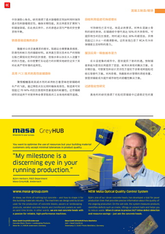 Masa GmbH GreyHUB Andernach Concrete Block, Pavers + Landscaping ProductsMasa-Str. 2 | 56626 Andernach | GermanyMasa GmbH WhiteHUB Porta WestfalicaAAC + Sand-lime BrickOsterkamp 2 | 32457 Porta Westfalica | GermanyAt Masa, we think of nothing but concrete %u2013 and how to shape it for the building materials industry. The machines we design and build are used for the production of concrete blocks, pavers or landscaping products, aerated concrete blocks and (reinforced) panels as well as sand-lime bricks. In other words, we are real concrete heads with a passion for reliable, high-performance machines.Bj%u00f6rn, one of our clever concrete heads, has developed a tool for paver production lines that provides precise information about the quality of the ongoing production. On the wet side, the system measures products, identifi es defects such as cracks, liftings or cement balls and helps you to reduce waste. When it comes to precise 24/7 inline defect detection and resource savings %u2013 just ask the concrete heads.You want to optimise the use of resources but your building material customers only accept minimal tolerances in product quality.%u201cMy milestone is a discerning eye in your running production.%u201dBj%u00f6rn Herborn, R%u2009&%u2009D DepartmentMasa GreyHUB, Andernachwww.masa-group.com NEW Masa Optical Quality Control Systemma-0000805%u6df7%u51dd%u571f%u5236%u54c1/%u780c%u5757%u4e2d%u626e%u6f14%u6838%u5fc3%u89d2%u8272%u3002%u7814%u7a76%u5f3a%u8c03%u4e86%u900f%u6c34%u63a5%u7f1d%u7a33%u5b9a%u5242%u5982%u4f55%u540c%u65f6%u4fdd%u6301%u900f%u6c34%u6027%u548c%u63a5%u7f1d%u7a33%u5b9a%u6027%uff0c%u786e%u4fdd%u957f%u671f%u6027%u80fd%u3002%u5176%u5e94%u7528%u751a%u81f3%u6269%u5c55%u5230%u98de%u673a%u94fa%u9762%u9886%u57df%uff0c%u5728%u6b64%u7c7b%u5e94%u7528%u4e2d%uff0c%u6c34%u7684%u6e17%u900f%u5fc5%u987b%u4e0e%u4e25%u683c%u7684%u5b89%u5168%u8981%u6c42%u76f8%u5e73%u8861%u3002%u94c1%u8def%u57fa%u7840%u8bbe%u65bd%u7684%u8fdb%u6b65%u968f%u7740%u5bf9%u516c%u5171%u4ea4%u901a%u9700%u6c42%u7684%u589e%u957f%uff0c%u94c1%u8def%u7ad9%u53f0%u9700%u8981%u517c%u5177%u5f3a%u5ea6%u3001%u9632%u6ed1%u6027%u548c%u8010%u4e45%u6027%u7684%u94fa%u88c5%u6750%u6599%u3002%u91c7%u7528%u771f%u7a7a%u6e7f%u538b%u6280%u672f%u751f%u4ea7%u7684%u9884%u5236%u77f3%u677f%u5df2%u5c55%u73b0%u51fa%u4f18%u5f02%u7684%u6297%u6298%u5f3a%u5ea6%u3001%u4f4e%u5438%u6c34%u7387%u4ee5%u53ca%u5728%u5927%u4eba%u6d41%u91cf%u4e0b%u7684%u6301%u4e45%u6027%u80fd%u3002%u5728%u5370%u5ea6%u7e41%u5fd9%u8f66%u7ad9%u8fdb%u884c%u7684%u957f%u671f%u5b9e%u5730%u7814%u7a76%u8bc1%u5b9e%u4e86%u5176%u5bf9%u6b64%u7c7b%u4e25%u82db%u73af%u5883%u7684%u9002%u7528%u6027%u3002%u91c7%u7528 PCE %u6280%u672f%u7684%u9ad8%u6027%u80fd%u94fa%u8def%u7816%u805a%u7fa7%u9178%u919a%u57fa%u9ad8%u6548%u51cf%u6c34%u5242%u7684%u91c7%u7528%u6807%u5fd7%u7740%u6e7f%u94f8%u8fde%u9501%u94fa%u8def%u7816%u751f%u4ea7%u7684%u98de%u8dc3%u3002%u901a%u8fc7%u964d%u4f4e%u6c34%u7070%u6bd4%u540c%u65f6%u786e%u4fdd%u9ad8%u6613%u6027%uff0c%u5236%u9020%u5546%u53ef%u5b9e%u73b0%u8d85%u8fc7 70 MPa %u7684%u6297%u538b%u5f3a%u5ea6%u548c%u663e%u8457%u63d0%u9ad8%u7684%u8010%u78e8%u6027%u3002%u8fd9%u4e9b%u94fa%u8def%u7816%u7279%u522b%u9002%u7528%u4e8e%u5bf9%u4f7f%u7528%u5bff%u547d%u8981%u6c42%u6781%u9ad8%u7684%u5de5%u4e1a%u573a%u5730%u548c%u57ce%u5e02%u9053%u8def%u3002%u56de%u6536%u5229%u7528%u4fc3%u8fdb%u53ef%u6301%u7eed%u589e%u957f%u53ef%u6301%u7eed%u6027%u5df2%u975e%u53ef%u9009%uff0c%u800c%u662f%u5fc5%u7136%u8981%u6c42%u3002%u5bf9%u518d%u751f%u6df7%u51dd%u571f%u9aa8%u6599%u7684%u7814%u7a76%u8868%u660e%uff0c%u5728%u94fa%u8def%u7816%u4e2d%u66ff%u4ee3%u9ad8%u8fbe 50% %u7684%u5929%u7136%u9aa8%u6599%uff0c%u53ef%u63d0%u4f9b%u76f8%u5f53%u7684%u6297%u538b%u5f3a%u5ea6%uff0c%u540c%u65f6%u51cf%u5c11%u9ad8%u8fbe 30% %u7684%u78b3%u6392%u653e%uff0c%u5e76%u964d%u4f4e%u8d85%u8fc7%u4e09%u5206%u4e4b%u4e00%u7684%u586b%u57cb%u5f71%u54cd%u3002%u8fd9%u4e9b%u53d1%u73b0%u51f8%u663e%u4e86 RCA %u4f5c%u4e3a%u73af%u4fdd%u94fa%u88c5%u4e3b%u6d41%u6750%u6599%u7684%u6f5c%u529b%u3002%u5c4b%u9876%u5e94%u7528%u2014%u91ca%u653e%u57ce%u5e02%u6f5c%u529b%u5728%u65e5%u76ca%u5bc6%u96c6%u7684%u57ce%u5e02%u4e2d%uff0c%u5c4b%u9876%u63d0%u4f9b%u4e86%u65b0%u7684%u673a%u9047%u3002%u9884%u5236%u94fa%u88c5%u7cfb%u7edf%u4e3a%u5c4b%u9876%u5e94%u7528%u63d0%u4f9b%u4e86%u575a%u56fa%u3001%u8010%u7528%u4e14%u7f8e%u89c2%u7684%u89e3%u51b3%u65b9%u6848%uff0c%u5728%u957f%u671f%u4ef7%u503c%u3001%u53ef%u4fee%u590d%u6027%u548c%u8bbe%u8ba1%u7075%u6d3b%u6027%u65b9%u9762%u4f18%u4e8e%u6ca5%u9752%u6216%u6811%u8102%u7c98%u7ed3%u783e%u77f3%u7b49%u66ff%u4ee3%u65b9%u6848%u3002%u5bf9%u98ce%u8377%u8f7d%u3001%u70ed%u81a8%u80c0%u548c%u6c34%u7ba1%u7406%u7684%u5468%u5bc6%u8003%u91cf%uff0c%u4f7f%u5c4b%u9876%u94fa%u88c5%u6210%u4e3a%u63d0%u5347%u57ce%u5e02%u97e7%u6027%u7684%u524d%u77bb%u6027%u89e3%u51b3%u65b9%u6848%u3002%u8fc7%u6ee4%u7a33%u5b9a%u6027%u7814%u7a76%u5965%u5730%u5229%u7684%u7814%u7a76%u5f3a%u8c03%u4e86%u65e0%u7c98%u7ed3%u5c42%u94fa%u88c5%u4e2d%u8fc7%u6ee4%u7a33%u5b9a%u6027%u7684%u91cd