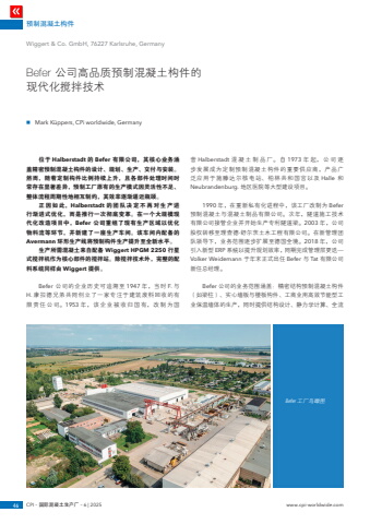n Mark K%u00fcppers, CPi worldwide, Germany%u9884%u5236%u6df7%u51dd%u571f%u6784%u4ef646 CPI %u2013 %u56fd%u9645%u6df7%u51dd%u571f%u751f%u4ea7%u5382 %u2013 6 | 2025 www.cpi-worldwide.comWiggert & Co. GmbH, 76227 Karlsruhe, GermanyBefer %u516c%u53f8%u9ad8%u54c1%u8d28%u9884%u5236%u6df7%u51dd%u571f%u6784%u4ef6%u7684%u73b0%u4ee3%u5316%u6405%u62cc%u6280%u672fBefer %u5de5%u5382%u9e1f%u77b0%u56fe%u4f4d%u4e8e Halberstadt %u7684 Befer %u6709%u9650%u516c%u53f8%uff0c%u5176%u6838%u5fc3%u4e1a%u52a1%u6db5%u76d6%u7cbe%u5bc6%u9884%u5236%u6df7%u51dd%u571f%u6784%u4ef6%u7684%u8bbe%u8ba1%u3001%u89c4%u5212%u3001%u751f%u4ea7%u3001%u4ea4%u4ed8%u4e0e%u5b89%u88c5%u3002%u7136%u800c%uff0c%u968f%u7740%u5b9a%u5236%u6784%u4ef6%u6bd4%u4f8b%u6301%u7eed%u4e0a%u5347%uff0c%u4e14%u5404%u90e8%u4ef6%u5904%u7406%u65f6%u95f4%u65f6%u5e38%u5b58%u5728%u663e%u8457%u5dee%u5f02%uff0c%u9884%u5236%u5de5%u5382%u539f%u6709%u7684%u751f%u4ea7%u6a21%u5f0f%u56e0%u7075%u6d3b%u6027%u4e0d%u8db3%u3001%u6574%u4f53%u6d41%u7a0b%u5468%u671f%u6027%u5730%u76f8%u4e92%u5236%u7ea6%uff0c%u5176%u6548%u7387%u9010%u6e10%u903c%u8fd1%u74f6%u9888%u3002%u6b63%u56e0%u5982%u6b64%uff0cHalberstadt %u7684%u56e2%u961f%u51b3%u5b9a%u4e0d%u518d%u5bf9%u751f%u4ea7%u8fdb%u884c%u6e10%u8fdb%u5f0f%u4f18%u5316%uff0c%u800c%u662f%u63a8%u884c%u4e00%u6b21%u5f7b%u5e95%u53d8%u9769%u3002%u5728%u4e00%u4e2a%u5927%u89c4%u6a21%u73b0%u4ee3%u5316%u6539%u9020%u9879%u76ee%u4e2d%uff0cBefer %u516c%u53f8%u91cd%u7ec4%u4e86%u73b0%u6709%u751f%u4ea7%u533a%u57df%u4ee5%u4f18%u5316%u7269%u6599%u6d41%u7b49%u73af%u8282%uff0c%u5e76%u65b0%u5efa%u4e86%u4e00%u5ea7%u751f%u4ea7%u8f66%u95f4%u3002%u8be5%u8f66%u95f4%u5185%u914d%u5907%u7684Avermann %u73af%u5f62%u751f%u4ea7%u7ebf%u5c06%u9884%u5236%u6784%u4ef6%u751f%u4ea7%u63d0%u5347%u81f3%u5168%u65b0%u6c34%u5e73%u3002%u751f%u4ea7%u6240%u9700%u6df7%u51dd%u571f%u6765%u81ea%u914d%u5907 Wiggert HPGM 2250 %u884c%u661f%u5f0f%u6405%u62cc%u673a%u4f5c%u4e3a%u6838%u5fc3%u90e8%u4ef6%u7684%u6405%u62cc%u7ad9%u3002%u9664%u6405%u62cc%u6280%u672f%u5916%uff0c%u5b8c%u6574%u7684%u914d%u6599%u7cfb%u7edf%u540c%u6837%u7531 Wiggert %u63d0%u4f9b%u3002Befer %u516c%u53f8%u7684%u4f01%u4e1a%u5386%u53f2%u53ef%u8ffd%u6eaf%u81f3 1947 %u5e74%uff0c%u5f53%u65f6 F. %u4e0eH. %u5eb7%u62c9%u5fb7%u5144%u5f1f%u5171%u540c%u521b%u7acb%u4e86%u4e00%u5bb6%u4e13%u6ce8%u4e8e%u5efa%u7b51%u5e9f%u6599%u56de%u6536%u7684%u6709%u9650%u8d23%u4efb%u516c%u53f8%u30021953 %u5e74%uff0c%u8be5%u4f01%u4e1a%u88ab%u6536%u5f52%u56fd%u6709%uff0c%u6539%u5236%u4e3a%u56fd%u8425 Halberstadt %u6df7 %u51dd %u571f %u5236 %u54c1 %u5382%u3002 %u81ea 1973 %u5e74 %u8d77%uff0c %u516c %u53f8 %u9010%u6b65%u53d1%u5c55%u6210%u4e3a%u5b9a%u5236%u9884%u5236%u6df7%u51dd%u571f%u6784%u4ef6%u7684%u91cd%u8981%u4f9b%u5e94%u5546%uff0c%u4ea7%u54c1%u5e7f%u6cdb%u5e94%u7528%u4e8e%u65bd%u6ed5%u8fbe%u5c14%u6838%u7535%u7ad9%u3001%u67cf%u6797%u5171%u548c%u56fd%u5bab%u4ee5%u53ca Halle %u548cNeubrandenburg. %u5730%u533a%u533b%u9662%u7b49%u5927%u578b%u5efa%u8bbe%u9879%u76ee%u30021990 %u5e74%uff0c%u5728%u91cd%u65b0%u79c1%u6709%u5316%u8fdb%u7a0b%u4e2d%uff0c%u8be5%u5de5%u5382%u6539%u5236%u4e3a Befer%u9884%u5236%u6df7%u51dd%u571f%u4e0e%u6df7%u51dd%u571f%u5236%u54c1%u6709%u9650%u516c%u53f8%u3002%u6b21%u5e74%uff0c%u96a7%u9053%u65bd%u5de5%u6280%u672f%u6709%u9650%u516c%u53f8%u63a5%u7ba1%u4f01%u4e1a%u5e76%u5f00%u59cb%u751f%u4ea7%u4e13%u5229%u96a7%u9053%u6881%u30022003 %u5e74%uff0c%u516c%u53f8%u80a1%u6743%u8f6c%u79fb%u81f3%u7406%u67e5%u5fb7%u00b7%u8212%u5c14%u8328%u571f%u6728%u5de5%u7a0b%u6709%u9650%u516c%u53f8%u3002%u5728%u65b0%u7ba1%u7406%u56e2%u961f%u9886%u5bfc%u4e0b%uff0c%u4e1a%u52a1%u8303%u56f4%u9010%u6b65%u6269%u5c55%u81f3%u5fb7%u56fd%u5168%u5883%u30022018 %u5e74%uff0c%u516c%u53f8%u5f15%u5165%u65b0%u578b ERP %u7cfb%u7edf%u4ee5%u63d0%u5347%u89c4%u5212%u6548%u7387%uff0c%u540c%u671f%u5b8c%u6210%u7ba1%u7406%u5c42%u66f4%u8fed%u2014Volker Weidemann %u4e8e%u5e74%u672b%u6b63%u5f0f%u51fa%u4efb Befer %u4e0e Tat %u6709%u9650%u516c%u53f8%u65b0%u4efb%u603b%u7ecf%u7406%u3002Befer %u516c%u53f8%u7684%u4e1a%u52a1%u8303%u56f4%u6db5%u76d6%uff1a%u7cbe%u5bc6%u7ed3%u6784%u9884%u5236%u6df7%u51dd%u571f%u6784%u4ef6%uff08%u5982%u6881%u67f1%uff09%u3001%u5b9e%u5fc3%u5899%u677f%u4e0e%u697c%u677f%u6784%u4ef6%u3001%u5de5%u5546%u4e1a%u7528%u9ad8%u6548%u8282%u80fd%u578b%u5de5%u4e1a%u4fdd%u6e29%u5899%u4f53%u7684%u751f%u4ea7%uff0c%u540c%u65f6%u63d0%u4f9b%u7ed3%u6784%u8bbe%u8ba1%u3001%u9759%u529b%u5b66%u8ba1%u7b97%u3001%u5168%u6d41