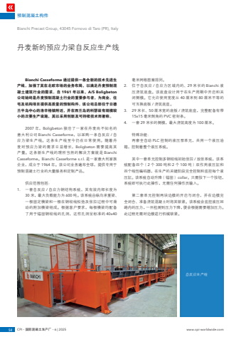 %u9884%u5236%u6df7%u51dd%u571f%u6784%u4ef654 CPI %u2013 %u56fd%u9645%u6df7%u51dd%u571f%u751f%u4ea7%u5382 %u2013 6 | 2025 www.cpi-worldwide.comBianchi Precast Group, 43045 Fornovo di Taro (PR), Italy%u4e39%u9ea6%u65b0%u7684%u9884%u5e94%u529b%u6881%u81ea%u53cd%u5e94%u751f%u4ea7%u7ebf%u81ea%u53cd%u5e94%u751f%u4ea7%u7ebfBianchi Casseforme %u901a%u8fc7%u63d0%u4f9b%u4e00%u6761%u5168%u65b0%u7684%u6280%u672f%u5148%u8fdb%u751f%u4ea7%u7ebf%uff0c%u52a0%u5f3a%u4e86%u5176%u5728%u5317%u6b27%u5e02%u573a%u7684%u4e1a%u52a1%u5e03%u5c40%uff0c%u4ee5%u6ee1%u8db3%u4e39%u9ea6%u9884%u5236%u6df7%u51dd%u571f%u5efa%u7b51%u884c%u4e1a%u7684%u9700%u6c42%u3002%u81ea 1961 %u5e74%u4ee5%u6765%uff0cA/S Boligbeton%u516c%u53f8%u59cb%u7ec8%u662f%u4e39%u9ea6%u9884%u5236%u6df7%u51dd%u571f%u884c%u4e1a%u7684%u91cd%u8981%u53c2%u4e0e%u8005%uff0c%u4e3a%u5546%u4e1a%u3001%u4f4f%u5b85%u53ca%u673a%u6784%u9879%u76ee%u63d0%u4f9b%u9ad8%u8d28%u91cf%u7684%u9884%u5236%u6784%u4ef6%u3002%u8be5%u516c%u53f8%u603b%u90e8%u4f4d%u4e8e%u65e5%u5fb7%u5170%u534a%u5c9b%u4e2d%u5fc3%u7684%u6d1b%u8f9b%u683c%u9547%u9644%u8fd1%uff0c%u5e76%u5728%u897f%u5170%u5c9b%u7684%u79d1%u745f%u8bbe%u6709%u89c4%u6a21%u8f83%u5c0f%u7684%u6b21%u8981%u751f%u4ea7%u8bbe%u65bd%uff0c%u5176%u4ee5%u91c7%u7528%u521b%u65b0%u53ca%u53ef%u6301%u7eed%u6280%u672f%u800c%u8457%u79f0%u30022007 %u5e74%uff0cBoligbeton %u63a5%u6d3d%u4e86%u4e00%u5bb6%u5728%u4e39%u9ea6%u5c1a%u4e0d%u77e5%u540d%u7684%u610f%u5927%u5229%u516c%u53f8 Bianchi Casseforme%uff0c%u4ee5%u91c7%u8d2d%u4e00%u6761%u81ea%u53cd%u5e94 / %u81ea%u5e94%u529b%u6881%u751f%u4ea7%u7ebf%u3002%u8fd9%u6761%u751f%u4ea7%u7ebf%u81f3%u4eca%u4ecd%u5728%u65e5%u5e38%u4f7f%u7528%u3002%u968f%u7740%u4e39%u9ea6%u5bf9%u9884%u5e94%u529b%u6881%u7684%u9700%u6c42%u65e5%u76ca%u589e%u957f%uff0cBoligbeton %u9700%u8981%u63d0%u9ad8%u5176%u4ea7%u91cf%u3002%u8fd9%u6761%u65b0%u751f%u4ea7%u7ebf%u7684%u7406%u6240%u5f53%u7136%u7684%u89e3%u51b3%u65b9%u6848%u5c31%u662f Bianchi Casseforme%u3002Bianchi Casseforme s.r.l. %u662f%u4e00%u5bb6%u610f%u5927%u5229%u5bb6%u65cf%u4f01%u4e1a%uff0c%u6210%u7acb%u4e8e 1964 %u5e74%u3002%u8be5%u516c%u53f8%u4e1a%u52a1%u904d%u5e03%u5168%u7403%uff0c%u63d0%u4f9b%u4e13%u7528%u4e8e%u9884%u5236%u6df7%u51dd%u571f%u884c%u4e1a%u7684%u5927%u91cf%u670d%u52a1%u548c%u5b9a%u5236%u4ea7%u54c1%u3002%u4f9b%u5e94%u8303%u56f4%u5305%u62ec%uff1a1. %u4e00%u5957%u81ea%u53cd%u5e94 / %u81ea%u5e94%u529b%u94a2%u7ed3%u6784%u7cfb%u7edf%uff0c%u5176%u6709%u6548%u5185%u90e8%u957f%u5ea6%u4e3a30 %u7c73%uff0c%u6700%u5927%u8d1f%u8f7d%u80fd%u529b%u4e3a 600 %u5428%u3002%u8be5%u7cfb%u7edf%u7531%u7eb5%u5411%u627f%u91cd%u6881%u3001%u4e00%u6839%u56fa%u5b9a%u6a2a%u6881%u548c%u4e00%u6839%u5728%u94a2%u7ede%u7ebf%u677e%u5f1b%u53ca%u5f20%u62c9%u8fc7%u7a0b%u4e2d%u53ef%u6ed1%u52a8%u7684%u9644%u52a0%u6a2a%u6881%u7ec4%u6210%u3002%u6839%u636e%u5ba2%u6237%u8981%u6c42%uff0c%u6bcf%u6839%u6a2a%u6881%u5747%u914d%u5907%u4e86%u7528%u4e8e%u951a%u56fa%u94a2%u7ede%u7ebf%u7684%u5b54%u6d1e%uff0c%u8fd9%u4e9b%u5b54%u6d1e%u5448%u6807%u51c6%u7684 40x40%u6beb%u7c73%u7f51%u683c%u56fe%u6848%u6392%u5217%u30022. %u4f4d%u4e8e%u81ea%u53cd%u5e94 / %u81ea%u5e94%u529b%u533a%u57df%u5185%u7684%u300129 %u7c73%u957f%u7684 Bianchi %u6db2%u538b%u6d47%u7b51%u5e95%u76d8%u3002%u8be5%u5e95%u76d8%u8bbe%u8ba1%u7528%u4e8e%u5728%u751f%u4ea7%u5468%u671f%u4e2d%u5f00%u542f%u548c%u5173%u95ed%u4fa7%u6a21%u3002%u5b83%u5141%u8bb8%u4f7f%u7528%u5bbd%u5ea6%u4ece 40 %u5398%u7c73%u5230 80 %u5398%u7c73%u4e0d%u7b49%u7684%u53ef%u4e92%u6362%u5e95%u677f / %u6d47%u7b51%u5e95%u5ea7%u30023. 29 %u7c73%u957f%u300150 %u5398%u7c73%u5bbd%u7684%u5e95%u677f / %u6d47%u7b51%u5e95%u5ea7%uff0c%u5b8c%u6574%u914d%u5907%u6709%u5e2615x15 %u6beb%u7c73%u5012%u89d2%u7684 PVC %u5bc6%u5c01%u6761%u30024. %u4e00%u5957 29 %u7c73%u957f%u7684%u4fa7%u6a21%uff0c%u6700%u5927%u6d47%u7b51%u9ad8%u5ea6%u4e3a 100 %u5398%u7c73%u3002%u7279%u6b8a%u529f%u80fd%uff1a%u4e24%u5957%u5168%u81ea%u52a8 PLC %u63a7%u5236%u7684%u6db2%u538b%u6cf5%u5355%u5143%uff0c%u5171%u7528%u4e00%u4e2a%u6db2%u538b%u6cb9%u7bb1%uff0c%u63a7%u5236%u7740%u6574%u4e2a%u6db2%u538b%u7cfb%u7edf%u3002%u5176%u4e2d%u4e00%u5957%u5355%u5143%u63a7%u5236%u591a%u94a2%u7ede%u7ebf%u521d%u59cb%u5f20%u62c9 / %u653e%u5f20%u7cfb%u7edf%uff0c%u8be5%u7cfb%u7edf%u914d%u5907%u56db%u4e2a%uff082 %u4e2a 300 %u5428%u548c 2 %u4e2a 100 %u5428%uff09%u53cc%u4f5c%u7528%u6db2%u538b%u7f38%u548c%u56db%u4e2a%u7ebf%u6027%u7f16%u7801%u5668%uff0c%u5728%u751f%u4ea7%u7684%u5173%u952e%u9636%u6bb5%u5b8c%u5168%u63a7%u5236%u548c%u76d1%u63a7%u6bcf%u4e2a%u6db2%u538b%u7f38%u3002%u8be5%u7cfb%u7edf%u81ea%u52a8%u5347%u964d%uff08%u951a%u56fa%uff09 collar%u3002%u53ea%u9700%u6309%u4e0b%u4e00%u4e2a%u6309%u94ae%uff0c%u7cfb%u7edf%u5373%u53ef%u6267%u884c%u6b64%u64cd%u4f5c%uff0c%u65e0%u9700%u4efb%u4f55%u64cd%u4f5c%u5458%u8f93%u5165%u3002%u7b2c%u4e8c%u5957%u5355%u5143%u63a7%u5236%u4e24%u5757%u8fb9%u6a21%u7684%u5f00%u542f%u4e0e%u95ed%u5408%uff0c%u5e76%u5728%u8fb9%u6a21%u5b8c%u5168%u95ed%u5408%u3001%u51c6%u5907%u6d47%u7b51%u6df7%u51dd%u571f%u65f6%u5c06%u5176%u9501%u7d27%u3002%u8be5%u7cfb%u7edf%u4f1a%u76d1%u63a7%u6db2%u538b%u56de%u8def%u5185%u7684%u538b%u529b%uff0c%u4e00%u65e6%u68c0%u6d4b%u5230%u538b%u529b%u4e0b%u964d%uff0c%u4fbf%u4f1a%u6839%u636e%u9700%u8981%u589e%u52a0%u538b%u529b%u3002%u6b64%u8fc7%u7a0b%u65e0%u9700%u5bf9%u8fb9%u6a21%u8fdb%u884c%u673a%u68b0%u9501%u7d27%u3002