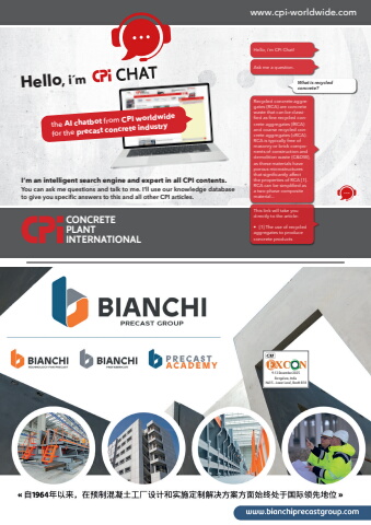 9-13 December 2025Bengaluru, IndiaHall 5 %u2013 Lower Level, Booth B18www.cpi-worldwide.comHello, i%u00b4mI%u2018m an intelligent search engine and expert in all CPI contents.You can ask me questions and talk to me. I%u2018ll use our knowledge database to give you specific answers to this and all other CPI articles. the AI chatbot from CPI worldwide for the precast concrete industryWhat is recycled concrete?Ask me a question.Hello, i%u00b4m CPi Chat!Recycled concrete aggregates (RCA) are concrete waste that can be classified as fine recycled concrete aggregates (fRCA) and coarse recycled concrete aggregates (cRCA). RCA is typically free of masonry or brick components of construction and demolition waste (C&DW), as these materials have porous microstructures that significantly affect the properties of RCA [1]. RCA can be simplified as a two-phase composite material...This link will take you directly to the article:%u2022 [1] The use of recycled aggregates to produce concrete productsCONCRETE PLANTINTERNATIONALTRADE JOURNALS FOR THE CONCRETE INDUSTRY