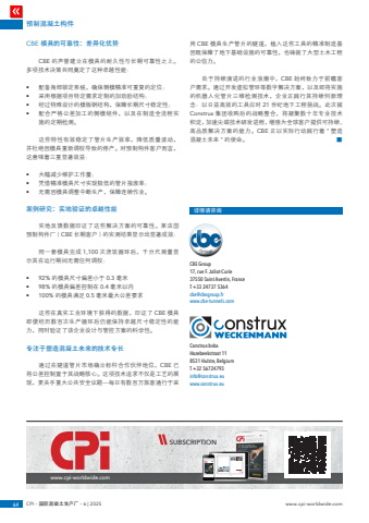 CBE Group 17, rue F. Joliot-Curie 37550 Saint Avertin, France T +33 24737 5364 cbe@cbegroup.fr www.cbe-tunnels.comConstrux bvba Hazebeekstraat 11 8531 Hulste, BelgiumT +32 56724793 info@construx.eu www.construx.euwww.cpi-worldwide.comCONCRETE TECHNOLOGY CONCRETE TECHNOLOGY96 CPI %u2013 Concrete Plant International %u2013 2 | 2025 www.cpi-worldwide.com www.cpi-worldwide.com CPI %u2013 Concrete Plant International %u2013 2 | 2025 97Kraft Curing Systems is proud to be a technology leader in concrete curing. As a team dedicated to innovation, they are excited to share their latest advancements, including the Match-Cure System with Predictive Maturity, the E-Cure System, and the CO2 TestCube. Additionally, as Kraft Curing Systems prepares for bauma 2025, they look forward to showcasing their cutting-edge solutions, alongside the expansion of their operations with the new Logistics and Competence Center at the headquarters in Lindern, Ger- many, set to break ground in summer 2025.Expanding for the Future Beyond product innovations, Kraft Curing Systems is making a significant investment in their future with the construction of a new Logistics and Competence Center, set to start in summer 2025. This facility will serve as a central hub for logistics, production, and technical innovation, allowing for expanded capabilities and the development of curing solutions such as the patented and one-of-a-kind Kraft%u00ae Racks. The new Competence Center will also provide hands-on technical training and workshops, reinforcing the dedication to knowledge-sharing and industry education. This expansion will enable Kraft Curing Systems to not only increase their production capacity but also strengthen their ability to sup- port customers worldwide with advanced solutions and ex- pert guidance.Concrete Curing Innovations One of the most exciting recent breakthroughs is the Match- Cure System with Predictive Maturity Control, designed to provide real-time data on concrete strength development. This system allows manufacturers to optimize their production processes, reduce curing times, and improve overall efficiency by predicting the maturity and performance of concrete with unparalleled accuracy. Predictive maturity control enables users to set necessary strength and allotted time, automatically allowing the system to determine the best curing process.Match-Cure with Predictive Maturity Control provides real-time curing monitoring, allowing users to track concrete strength gain as it occurs. It enhances precise production planning by forecasting the exact time for detensioning or demolding, eliminating guesswork, and reducing errors. The system automatically adjusts the curing profile based on the required maturity and strength, ensuring consistent results. By implementing Predictive Maturity, manufacturers can benefit from quick reaction alerts if curing is delayed, allowing them to make immediate adjustments. This system also helps save time and personnel costs by enabling production teams to plan more efficiently, ensuring workers are availa- ble precisely when needed. Additionally, energy savings are Pioneering Innovation in Concrete Curing Kraft Curing Systems GmbH, 49699 Lindern, Germanyachieved by avoiding unnecessary heating and curing durations, significantly lowering operational expenses.Another significant advancement is the E-Cure System. This electric-powered curing system provides consistent and controlled heating, accelerating the curing process while reducing energy costs. With radiant heating units placed under- neath molds, beds, or forms, E-Cure ensures uniform curing without the need for fossil fuels, making it both an effective and sustainable solution for concrete production.In line with the commitment to sustainability, Kraft Curing Systems introduced the CO2 TestCube, a test chamber that eval- uates the sequestration potential of CO2 in concrete prod- ucts. The TestCube also enables users to test with heat and humidity, paving the way for a more sustainable future in the industry. This innovative tool allows manufacturers to assess how CO2 can enhance strength and quality, reduce carbon footprints, and contribute to more environmentally friendly building practices.The Pulse of Innovation on Display at bauma 2025 The Kraft team is looking forward to connecting with custom- ers, partners, and industry professionals at bauma, showcasing a range of solutions. One of the key highlights at booth 12.9 will be the aforementioned Match-Cure with Predictive Maturity, an advanced system that takes quality control to the next level by automatically determining the optimal curing process for the earliest possible detensioning and demolding. Visitors will also be able to see the Retractable Enclosures with Vapor Curing, which provide an economical and weath- erproof solution while integrating vapor curing and air circulation systems to ensure optimal curing conditions.Another highlight is the Containerized ThermalCure%u00ae, a pre-plumbed and pre-wired system that accelerates curing through radiant heat emitted from fin-tube pipes For those looking to experience an optimized curing climate firsthand, the operational Kraft%u00ae Racks Curing Chamber will be available at booth b12.2, allowing visitors to step inside and witness the patented curing system in action. Kraft Curing Systems will also showcase real-world applications of their curing technologies through a series of %u201cCuring Systems in Action%u201d videos, illustrating how their solutions fit into differ- ent concrete production processes at booth b2.150 between halls b1 and b2.Beyond these technological advancements, Kraft Curing Systems will highlight their commitment to sustainability with CO2 curing. Additionally, the renewable energy solutions will be on display, featuring high-efficiency stainless steel heat exchangers that recycle warm air, cut heating costs by up to 75%, and provide enhanced humidity control.A Commitment to Excell