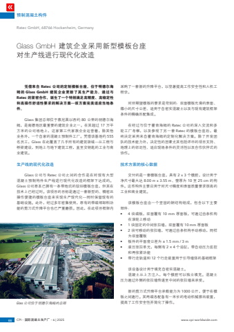 %u9884%u5236%u6df7%u51dd%u571f%u6784%u4ef666 CPI %u2013 %u56fd%u9645%u6df7%u51dd%u571f%u751f%u4ea7%u5382 %u2013 6 | 2025 www.cpi-worldwide.comRatec GmbH, 68766 Hockenheim, GermanyGlass GmbH %u5efa%u7b51%u4f01%u4e1a%u91c7%u7528%u65b0%u578b%u6a21%u677f%u53f0%u5ea7%u5bf9%u751f%u4ea7%u7ebf%u8fdb%u884c%u73b0%u4ee3%u5316%u6539%u9020Glass %u516c%u53f8%u4f4d%u4e8e%u660e%u5fb7%u5c14%u6d77%u59c6%u7684%u603b%u90e8%u51ed%u501f%u6765%u81ea Ratec %u516c%u53f8%u7684%u5b9a%u5236%u6a21%u677f%u53f0%u5ea7%uff0c%u4f4d%u4e8e%u660e%u5fb7%u5c14%u6d77%u59c6%u7684 Glass GmbH %u5efa%u7b51%u4f01%u4e1a%u66f4%u65b0%u4e86%u5176%u751f%u4ea7%u80fd%u529b%u3002%u901a%u8fc7%u4e0eRatec %u7684%u7d27%u5bc6%u5408%u4f5c%uff0c%u8bde%u751f%u4e86%u4e00%u4e2a%u7279%u522b%u6ee1%u8db3%u9ad8%u7cbe%u5ea6%u3001%u9ad8%u7a33%u5b9a%u6027%u548c%u9ad8%u64cd%u4f5c%u8212%u9002%u6027%u8981%u6c42%u7684%u89e3%u51b3%u65b9%u6848%u2014%u8be5%u65b9%u6848%u5b8c%u7f8e%u9002%u5e94%u5f53%u5730%u6761%u4ef6%u3002Glass %u96c6%u56e2%u603b%u90e8%u4f4d%u4e8e%u6155%u5c3c%u9ed1%u4ee5%u897f%u7ea6 80 %u516c%u91cc%u7684%u660e%u5fb7%u5c14%u6d77%u59c6%uff0c%u662f%u5357%u5fb7%u5730%u533a%u6700%u91cd%u8981%u7684%u5efa%u7b51%u4f01%u4e1a%u4e4b%u4e00%u3002%u5728%u5176%u8d85%u8fc7 17 %u4e07%u5e73%u65b9%u7c73%u7684%u516c%u53f8%u573a%u5730%u4e0a%uff0c%u8fd9%u5bb6%u7b2c%u4e09%u4ee3%u5bb6%u65cf%u4f01%u4e1a%u8fd0%u8425%u7740%uff0c%u9664%u5176%u4ed6%u4e1a%u52a1%u5916%uff0c%u4e00%u4e2a%u81ea%u5bb6%u7684%u6df7%u51dd%u571f%u9884%u5236%u4ef6%u5de5%u5382%u3002%u51ed%u501f%u8be5%u57fa%u5730%u7ea6 555 %u540d%u5458%u5de5%uff0cGlass %u5728%u6b64%u8986%u76d6%u4e86%u51e0%u4e4e%u6240%u6709%u7684%u5efa%u7b51%u9886%u57df%u2014%u4ece%u5de5%u7a0b%u4e0e%u6865%u6881%u5efa%u8bbe%uff0c%u5230%u5730%u4e0a%u4e0e%u5730%u4e0b%u5efa%u7b51%u5de5%u7a0b%uff0c%u76f4%u81f3%u4ea4%u94a5%u5319%u7684%u5de5%u4e1a%u4e0e%u5546%u4e1a%u5efa%u7b51%u3002%u751f%u4ea7%u7ebf%u7684%u73b0%u4ee3%u5316%u6539%u9020Glass %u516c%u53f8%u4e0e Ratec %u516c%u53f8%u4e4b%u95f4%u7684%u5408%u4f5c%u662f%u5728%u5bf9%u73b0%u6709%u5927%u578b%u6df7%u51dd%u571f%u9884%u5236%u6784%u4ef6%u751f%u4ea7%u7ebf%u8fdb%u884c%u73b0%u4ee3%u5316%u6539%u9020%u7684%u6846%u67b6%u4e0b%u8fbe%u6210%u7684%u3002Glass %u516c%u53f8%u539f%u672c%u5df2%u62e5%u6709%u4e00%u6761%u5e26%u5730%u5751%u7684%u8f83%u65e7%u6a21%u677f%u53f0%u5ea7%uff0c%u4f46%u5176%u5728%u6280%u672f%u4e0a%u5df2%u7ecf%u8fc7%u65f6%u3002%u8be5%u9879%u76ee%u7684%u76ee%u6807%u662f%u901a%u8fc7%u4e00%u5957%u65b0%u578b%u7684%u3001%u7cbe%u5bc6%u4e14%u64cd%u4f5c%u4fbf%u6377%u7684%u6a21%u677f%u53f0%u5ea7%u6765%u5b9e%u73b0%u751f%u4ea7%u73b0%u4ee3%u5316%u2014%u540c%u65f6%u4fdd%u7559%u73b0%u6709%u7684%u57fa%u7840%u8bbe%u65bd%u3002%u6b64%u5916%uff0c%u7ecf%u8fc7%u591a%u5e74%u5bc6%u96c6%u4f7f%u7528%uff0c%u539f%u6709%u7684%u5e26%u7aef%u90e8%u5378%u6599%u529f%u80fd%u7684%u526a%u5200%u5f0f%u5347%u964d%u5e73%u53f0%u4e5f%u5df2%u4e25%u91cd%u78e8%u635f%u3002%u56e0%u6b64%uff0c%u5728%u6b64%u9879%u76ee%u6846%u67b6%u5185%u91c7%u8d2d%u4e86%u4e00%u5957%u65b0%u7684%u5347%u964d%u5e73%u53f0%uff0c%u4ee5%u663e%u8457%u63d0%u9ad8%u5de5%u4f5c%u5b89%u5168%u6027%u548c%u4eba%u673a%u5de5%u7a0b%u5b66%u3002%u5bf9%u6240%u671f%u671b%u6a21%u677f%u7684%u8981%u6c42%u662f%u82db%u523b%u7684%uff1a%u53cc%u9762%u6a21%u677f%u5149%u6ed1%u7684%u8868%u9762%u3001%u5fae%u5c0f%u7684%u5c3a%u5bf8%u516c%u5dee%u3001%u9002%u7528%u4e8e%u81ea%u5bc6%u5b9e%u6df7%u51dd%u571f%u4ee5%u53ca%u4e0e%u73b0%u6709%u5efa%u7b51%u6846%u67b6%u6761%u4ef6%u7684%u7cbe%u786e%u5339%u914d%u96c6%u6210%u3002%u5728%u7ecf%u8fc7%u4e0e%u4f4d%u4e8e%u970d%u80af%u6d77%u59c6%u7684 Ratec %u516c%u53f8%u7684%u6df1%u5165%u4ea4%u6d41%u548c%u591a%u8f6e%u5de5%u5382%u8003%u5bdf%uff0c%u4ee5%u53ca%u53c2%u89c2%u4e86%u53e6%u4e00%u5957 Ratec %u7684%u6a21%u677f%u53f0%u5ea7%u540e%uff0c%u6700%u7ec8%u51b3%u5b9a%u91c7%u7528%u6765%u81ea%u970d%u80af%u6d77%u59c6%u7684%u5b9a%u5236%u5316%u89e3%u51b3%u65b9%u6848%u3002%u9664%u4e86%u5f00%u53d1%u56e2%u961f%u7684%u6280%u672f%u80fd%u529b%u5916%uff0c%u51b3%u5b9a%u6027%u7684%u56e0%u7d20%u5c24%u5176%u5305%u62ec%u8be6%u5c3d%u7684%u9879%u76ee%u652f%u6301%u3001%u5730%u7406%u4e0a%u7684%u90bb%u8fd1%u6027%u3001%u9002%u5e94%u73b0%u573a%u6761%u4ef6%u7684%u7075%u6d3b%u6027%u4ee5%u53ca%u5408%u4f5c%u4f19%u4f34%u5f0f%u7684%u534f%u4f5c%u3002%u6280%u672f%u65b9%u6848%u7684%u6838%u5fc3%u6570%u636e%u4ea4%u4ed8%u7684%u662f%u4e00%u5957%u6a21%u677f%u53f0%u5ea7%uff0c%u5177%u6709 2 x 3 %u4e2a%u6a21%u8154%uff0c%u8bbe%u8ba1%u7528%u4e8e%u51c0%u5c3a%u5bf8%u6700%u5927%u8fbe 8.00 m x 3.55 m%u3001%u58c1%u539a%u4e3a 10 %u81f3 25 cm %u7684%u6784%u4ef6%u3002%u8fd9%u4e9b%u6784%u4ef6%u4e3b%u8981%u5e94%u7528%u4e8e%u5bf9%u5c3a%u5bf8%u7cbe%u5ea6%u548c%u8868%u9762%u8d28%u91cf%u8981%u6c42%u5f88%u9ad8%u7684%u5de5%u4e1a%u548c%u5546%u4e1a%u5efa%u7b51%u3002%u8be5%u6a21%u677f%u53f0%u5ea7%u7531%u4e00%u4e2a%u575a%u56fa%u7684%u94a2%u7ed3%u6784%u7ec4%u6210%uff0c%u5305%u542b%u4ee5%u4e0b%u4e3b%u8981%u90e8%u4ef6%uff1a%u2022 4 %u5757%u7aef%u677f%uff0c%u53cc%u9762%u8986%u6709 10 mm %u539a%u9762%u677f%uff0c%u53ef%u901a%u8fc7%u9f7f%u6761%u673a%u6784%u5728%u6eda%u8f6e%u4e0a%u79fb%u52a8%u2022 1 %u5757%u56fa%u5b9a%u7684%u4e2d%u95f4%u5f20%u62c9%u5899%uff0c%u53cc%u9762%u8986%u6709 10 mm %u539a%u9762%u677f%u2022 2 %u5757%u53ef%u79fb%u52a8%u7684%u5f20%u62c9%u5899%uff0c%u53ef%u901a%u8fc7%u9f7f%u6761%u673a%u6784%u624b%u52a8%u79fb%u52a8%uff0c%u540c%u6837%u4e3a%u53cc%u9762%u8986%u677f%u2022 %u677f%u4ef6%u7684%u5e73%u9762%u5ea6%u516c%u5dee%u4e3a %u00b1 1.5 mm / 3 m%u2022 %u6db2%u538b%u5f20%u62c9%u5355%u5143%uff0c%u6bcf%u4fa7%u6709 2 %u00d7 4 %u4e2a%u6cb9%u7f38%uff0c%u5e26%u81ea%u52a8%u538b%u529b%u76d1%u63a7%u548c%u518d%u5f20%u7d27%u529f%u80fd%u2022 %u5e26%u884c%u8d70%u8f68%u9053%u548c 12 %u4e2a%u884c%u8d70%u88c5%u7f6e%u7528%u4e8e%u5f15%u5bfc%u5899%u4f53%u7684%u57fa%u7840%u6846%u67b6%u8be5%u8bbe%u5907%u8bbe%u8ba1%u7528%u4e8e%u586b%u5145%u81ea%u5bc6%u5b9e%u6df7%u51dd%u571f%u3002%u6df7%u51dd%u571f%u4ece%u4e0a%u65b9%u6ce8%u5165%uff0c%u6bcf%u4e2a%u6a21%u8154%u53ef%u4ee5%u72ec%u7acb%u586b%u5145%u3002%u6df7%u51dd%u571f%u538b%u529b%u901a%u8fc7%u5916%u4