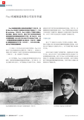 %u65b0%u95fb%u62a5%u90538 CPI %u2013 %u56fd%u9645%u6df7%u51dd%u571f%u751f%u4ea7%u5382 %u2013 6 | 2025 www.cpi-worldwide.com%u4ece%u5145%u6ee1%u6fc0%u60c5%u7684%u521b%u65b0%u8005%u5230%u9884%u5e94%u529b%u6280%u672f%u7684%u5f15%u9886%u529b%u91cfPaul %u673a%u68b0%u5236%u9020%u6709%u9650%u516c%u53f8%u767e%u5e74%u534e%u8bdePaul %u673a%u68b0%u5236%u9020%u6709%u9650%u516c%u53f8%u5728%u8fea%u5c14%u95e8%u5ef7%u6839%u7684%u8d77%u6e90%uff081925 %u5e74%uff09 %u516c%u53f8%u521b%u59cb%u4eba Max Paul %u9a6c%u514b%u65af%u00b7%u4fdd%u7f57Paul %u673a%u68b0%u5236%u9020%u6709%u9650%u516c%u53f8%u7684%u6210%u529f%u6545%u4e8b%u59cb%u4e8e 1925 %u5e74%uff0c%u5f53%u65f6 Max%u00b7Paul %u5728%u8fea%u5c14%u95e8%u5ef7%u6839%u4ed6%u7236%u4eb2%u7684%u623f%u5b50%u91cc%u5efa%u7acb%u4e86%u4e00%u4e2a%u673a%u68b0 workshop%u30021953 %u5e74%uff0cPaul %u516c%u53f8%u8fdb%u5165%u4e86%u9884%u5e94%u529b%u6df7%u51dd%u571f%u6280%u672f%u9886%u57df%u3002%u968f%u540e%u5728 1959 %u5e74%uff0c%u63a8%u51fa%u4e86%u9996%u4e2a%u91c7%u7528%u5f53%u65f6%u9769%u547d%u6027%u53cc%u6309%u94ae%u64cd%u4f5c%u7684%u5355%u6839%u94a2%u7ede%u7ebf%u5f20%u62c9%u5343%u65a4%u9876%u3002%u5230 1965 %u5e74%uff0c%u516c%u53f8%u5df2%u53d1%u5c55%u5230%u62e5%u6709 120 %u540d%u5458%u5de5%u548c 4500 %u5e73%u65b9%u7c73%u7684%u751f%u4ea7%u7a7a%u95f4%u3002%u8fd9%u4e00%u65f6%u671f%u7684%u91cd%u8981%u521b%u65b0%u5305%u62ec%u817e%u8428 SM %u5f20%u62c9%u6cd5%uff081960 %u5e74%uff09%u548c%u817e%u8428M %u591a%u6839%u94a2%u7ede%u7ebf%u5f20%u62c9%u5343%u65a4%u9876%uff081970 %u5e74%uff09%u30021970 %u5e74%u4ee3%u4e2d%u671f%uff0c%u90e8%u5206%u751f%u4ea7%u8f6c%u79fb%u81f3%u91cc%u5fb7%u6797%u6839%u3002%u4e8c%u5341%u4e16%u7eaa%u516b%u5341%u5e74%u4ee3%u4ee5%u81ea%u52a8%u5316%u4e3a%u6807%u5fd7%u6027%u7279%u5f81%u3002Paul %u516c%u53f8%u7814%u53d1%u4e86%u9996%u53f0%u94c1%u8def%u8f68%u6795%u81ea%u52a8%u94c6%u9489%u673a%uff081989 %u5e74%uff09%uff0c%u5176%u9884%u5e94%u529b%u6df7%u51dd%u571f%u90e8%u95e8%u8fd8%u63a8%u51fa%u4e86%u9002%u7528%u4e8e%u659c%u62c9%u6865%u7684%u591a%u675f%u94a2%u7ede%u7ebf%u5f20%u62c9%u8bbe%u5907%uff081982 %u5e74%uff09%uff0c%u8fdb%u4e00%u6b65%u62d3%u5c55%u4e86%u4ea7%u54c1%u4f53%u7cfb%u3002%u4e5d%u5341%u5e74%u4ee3%u671f%u95f4%uff0cPaul %u516c%u53f8%u901a%u8fc7%u591a%u9879%u521b%u65b0%u6280%u672f%u6811%u7acb%u884c%u4e1a%u6807%u6746%uff0c%u5305%u62ec%u9996%u521b%u94c1%u8def%u8f68%u6795%u667a%u80fd%u5f20%u62c9%u673a%u5668%u4eba%u3002%u81f3 1995 %u5e74%uff0c%u4f01%u4e1a%u5df2%u62e5%u6709 245 %u540d%u5458%u5de5%uff0c%u751f%u4ea7%u57fa%u5730%u8fbe 21,000 %u5e73%u65b9%u7c73%uff0c%u5e76%u6210%u529f%u7814%u5236%u51fa%u4e13%u7528%u4e8e%u592f%u6269%u6869%u7684%u591a%u675f%u94a2%u7ede%u7ebf%u5f20%u62c9%u7cfb%u7edf%u30021997 %u5e74%uff0c%u5728%u5fb7%u7d2f%u65af%u987f%u5723%u6bcd%u6559%u5802%u91cd%u5efa%u5de5%u7a0b%u4e2d%uff0cPaul %u51ed%u501f%u7279%u522b%u7814%u53d1%u7684%u9884%u5e94%u529b%u6280%u672f%u53d1%u6325%u4e86%u5173%u952e%u4f5c%u7528%u3002%u968f%u7740%u8fea%u5c14%u95e8%u5ef7%u6839%u603b%u90e8%u7684%u4ea7%u80fd%u8fbe%u5230%u9971%u548c%uff0c%u516c%u53f8%u4e8e 1999 %u5e74%u542f%u52a8%u81ea%u6709%u5de5%u4e1a%u56ed%u65b0%u5382%u533a%u5efa%u8bbe%u8ba1%u5212%u3002%u5343%u79a7%u5e74%u4e4b%u9645%u65b0%u5de5%u5382%u4e8e 2000 %u5e74%u516c%u53f8%u6210%u7acb 75 %u5468%u5e74%u4e4b%u9645%u843d%u6210%u3002%u540c%u671f%uff0c%u9884%u5e94%u529b%u6df7%u51dd%u571f%u90e8%u95e8%u6210%u529f%u7814%u53d1%u51fa%u817e%u8428%u63a7%u5236%u6d4b%u91cf%u8bb0%u5f55%u7cfb%u7edf%u3002%u6b64%u65f6%u4e24%u5927%u751f%u4ea7%u57fa%u5730%u5458%u5de5%u603b%u6570%u7ea6 270 %u4eba%uff0c%u751f%u4ea7%u533a%u57df%u6269%u5c55%u81f3 30,000%u5e73%u65b9%u7c73%u30022010 %u5e74%u8fea%u5c14%u95e8%u5ef7%u6839%u5382%u533a%u518d%u5ea6%u6269%u5efa%uff0c%u603b%u9762%u79ef%u8fbe%u5230 37,000%u5e73%u65b9%u7c73%u30022016 %u5e74%u4ea4%u4ed8%u4e86%u5f53%u65f6%u5168%u7403%u6700%u5927%u5428%u4f4d%u7684 22,000 %u5343%u725b%u591a%u675f%u94a2%u7ede%u7ebf%u5f20%u62c9%u8bbe%u5907%u30022017 %u5e74 Paul %u516c%u53f8%u5f00%u53d1%u7684%u94c6%u9489%u5934%u81ea%u52a8%u63a7%u5236%u5de5%u827a%u5165%u56f4%u6df7%u51dd%u571f%u6784%u4ef6%u4f9b%u5e94%u5546%u884c%u4e1a%u521b%u65b0%u5956%u30022019 %u5e74%u63a8%u51fa%u57fa%u4e8e%u5e73%u677f%u7535%u8111%u7684%u5fae%u578b%u817e%u8428%u63a7%u5236%u7cfb%u7edf%uff0c%u4e13%u7528%u4e8e%u9884%u5e94%u529b%u6df7%u51dd%u571f%u9884%u5236%u6784%u4ef6%u751f%u4ea7%u6570%u636e%u8bb0%u5f55%u3002