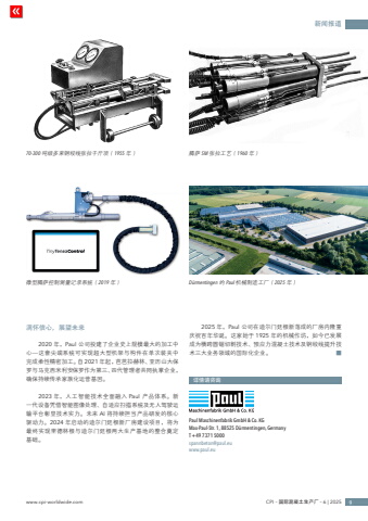 Paul Maschinenfabrik GmbH & Co. KG Max-Paul-Str. 1, 88525 D%u00fcrmentingen, Germany T +49 7371 5000spannbeton@paul.euwww.paul.eu%u65b0%u95fb%u62a5%u9053www.cpi-worldwide.com CPI %u2013 %u56fd%u9645%u6df7%u51dd%u571f%u751f%u4ea7%u5382 %u2013 6 | 2025 970-300 %u5428%u7ea7%u591a%u675f%u94a2%u7ede%u7ebf%u5f20%u62c9%u5343%u65a4%u9876%uff081955 %u5e74%uff09%u5fae%u578b%u817e%u8428%u63a7%u5236%u6d4b%u91cf%u8bb0%u5f55%u7cfb%u7edf%uff082019 %u5e74%uff09%u817e%u8428 SM %u5f20%u62c9%u5de5%u827a%uff081960 %u5e74%uff09D%u00fcrmentingen %u7684 Paul %u673a%u68b0%u5236%u9020%u5de5%u5382%uff082025 %u5e74%uff09%u6ee1%u6000%u4fe1%u5fc3%uff0c%u5c55%u671b%u672a%u67652020 %u5e74%uff0cPaul %u516c%u53f8%u6295%u5efa%u4e86%u4f01%u4e1a%u53f2%u4e0a%u89c4%u6a21%u6700%u5927%u7684%u52a0%u5de5%u4e2d%u5fc3%u2014%u8fd9%u5957%u5c16%u7aef%u7cfb%u7edf%u53ef%u5b9e%u73b0%u8d85%u5927%u578b%u673a%u67b6%u4e0e%u6784%u4ef6%u5728%u5355%u6b21%u88c5%u5939%u4e2d%u5b8c%u6210%u67d4%u6027%u7cbe%u5bc6%u52a0%u5de5%u3002%u81ea 2021 %u5e74%u8d77%uff0c%u82ad%u82ad%u62c9%u00b7%u8d6b%u6797%u3001%u4e9a%u5386%u5c71%u5927%u00b7%u4fdd%u7f57%u4e0e%u9a6c%u514b%u897f%u7c73%u5229%u5b89%u00b7%u4fdd%u7f57%u4f5c%u4e3a%u7b2c%u4e09%u3001%u56db%u4ee3%u7ba1%u7406%u8005%u5171%u540c%u6267%u638c%u4f01%u4e1a%uff0c%u786e%u4fdd%u6301%u7eed%u4f20%u627f%u5bb6%u65cf%u5316%u8fd0%u8425%u57fa%u56e0%u30022023 %u5e74%uff0c%u4eba%u5de5%u667a%u80fd%u6280%u672f%u5168%u9762%u878d%u5165 Paul %u4ea7%u54c1%u4f53%u7cfb%u3002%u65b0%u4e00%u4ee3%u8bbe%u5907%u51ed%u501f%u667a%u80fd%u56fe%u50cf%u5904%u7406%u3001%u81ea%u9002%u5e94%u626b%u63cf%u7cfb%u7edf%u53ca%u65e0%u4eba%u9a7e%u9a76%u8fd0%u8f93%u5e73%u53f0%u5f70%u663e%u6280%u672f%u5b9e%u529b%u3002%u672a%u6765 AI %u5c06%u6301%u7eed%u62c5%u5f53%u4ea7%u54c1%u7814%u53d1%u7684%u6838%u5fc3%u9a71%u52a8%u529b%u30022024 %u5e74%u542f%u52a8%u7684%u8fea%u5c14%u95e8%u5ef7%u6839%u65b0%u5382%u623f%u5efa%u8bbe%u9879%u76ee%uff0c%u5c06%u4e3a%u6700%u7ec8%u5b9e%u73b0%u91cc%u5fb7%u6797%u6839%u4e0e%u8fea%u5c14%u95e8%u5ef7%u6839%u4e24%u5927%u751f%u4ea7%u57fa%u5730%u7684%u6574%u5408%u5960%u5b9a%u57fa%u7840%u30022025 %u5e74%uff0cPaul %u516c%u53f8%u5728%u8fea%u5c14%u95e8%u5ef7%u6839%u65b0%u843d%u6210%u7684%u5382%u623f%u5185%u9686%u91cd%u5e86%u795d%u767e%u5e74%u534e%u8bde%u3002%u8fd9%u5bb6%u59cb%u4e8e 1925 %u5e74%u7684%u673a%u68b0%u4f5c%u574a%uff0c%u5982%u4eca%u5df2%u53d1%u5c55%u6210%u4e3a%u6a2a%u8de8%u5706%u952f%u5207%u5272%u6280%u672f%u3001%u9884%u5e94%u529b%u6df7%u51dd%u571f%u6280%u672f%u53ca%u94a2%u7ede%u7ebf%u63d0%u5347%u6280%u672f%u4e09%u5927%u4e1a%u52a1%u9886%u57df%u7684%u56fd%u9645%u5316%u4f01%u4e1a%u3002 %u25a0%u8be6%u60c5%u8bf7%u54a8%u8be2