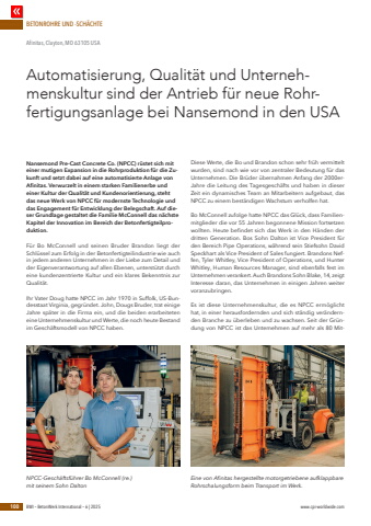 BETONROHRE UND -SCH%u00c4CHTE100 BWI %u2013 BetonWerk International %u2013 6 | 2025 www.cpi-worldwide.comNansemond Pre-Cast Concrete Co. (NPCC) r%u00fcstet sich mit einer mutigen Expansion in die Rohrproduktion f%u00fcr die Zukunft und setzt dabei auf eine automatisierte Anlage von Afinitas. Verwurzelt in einem starken Familienerbe und einer Kultur der Qualit%u00e4t und Kundenorientierung, steht das neue Werk von NPCC f%u00fcr modernste Technologie und das Engagement f%u00fcr Entwicklung der Belegschaft. Auf dieser Grundlage gestaltet die Familie McConnell das n%u00e4chste Kapitel der Innovation im Bereich der Betonfertigteilproduktion.F%u00fcr Bo McConnell und seinen Bruder Brandon liegt der Schl%u00fcssel zum Erfolg in der Betonfertigteilindustrie wie auch in jedem anderen Unternehmen in der Liebe zum Detail und der Eigenverantwortung auf allen Ebenen, unterst%u00fctzt durch eine kundenzentrierte Kultur und ein klares Bekenntnis zur Qualit%u00e4t.Ihr Vater Doug hatte NPCC im Jahr 1970 in Suffolk, US-Bundesstaat Virginia, gegr%u00fcndet. John, Dougs Bruder, trat einige Jahre sp%u00e4ter in die Firma ein, und die beiden erarbeiteten eine Unternehmenskultur und Werte, die noch heute Bestand im Gesch%u00e4ftsmodell von NPCC haben.Diese Werte, die Bo und Brandon schon sehr fr%u00fch vermittelt wurden, sind nach wie vor von zentraler Bedeutung f%u00fcr das Unternehmen. Die Br%u00fcder %u00fcbernahmen Anfang der 2000erJahre die Leitung des Tagesgesch%u00e4fts und haben in dieser Zeit ein dynamisches Team an Mitarbeitern aufgebaut, das NPCC zu einem best%u00e4ndigen Wachstum verholfen hat.Bo McConnell zufolge hatte NPCC das Gl%u00fcck, dass Familienmitglieder die vor 55 Jahren begonnene Mission fortsetzen wollten. Heute befindet sich das Werk in den H%u00e4nden der dritten Generation. Bos Sohn Dalton ist Vice President f%u00fcr den Bereich Pipe Operations, w%u00e4hrend sein Stiefsohn David Speckhart als Vice President of Sales fungiert. Brandons Neffen, Tyler Whitley, Vice President of Operations, und Hunter Whitley, Human Resources Manager, sind ebenfalls fest im Unternehmen verankert. Auch Brandons Sohn Blake, 14, zeigt Interesse daran, das Unternehmen in einigen Jahren weiter voranzubringen.Es ist diese Unternehmenskultur, die es NPCC erm%u00f6glicht hat, in einer herausfordernden und sich st%u00e4ndig ver%u00e4ndernden Branche zu %u00fcberleben und zu wachsen. Seit der Gr%u00fcndung von NPCC ist das Unternehmen auf mehr als 80 MitAutomatisierung, Qualit%u00e4t und Unternehmenskultur sind der Antrieb f%u00fcr neue Rohrfertigungsanlage bei Nansemond in den USAAfinitas, Clayton, MO 63105 USANPCC-Gesch%u00e4ftsf%u00fchrer Bo McConnell (re.) mit seinem Sohn DaltonEine von Afinitas hergestellte motorgetriebene aufklappbare Rohrschalungsform beim Transport im Werk.