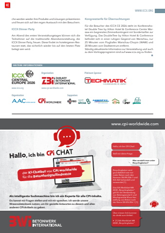 WWW.ICCX.ORGwww.cpi-worldwide.com BWI %u2013 BetonWerk International %u2013 6 | 2025 11WEITERE INFORMATIONENwww.iccx.org www.cpi-worldwide.comOrganisationCENTRALEUROPE 2026Organisation SupportersPlatinum Sponsorche werden wieder ihre Produkte und L%u00f6sungen pr%u00e4sentieren und freuen sich auf den regen Austausch mit den Besuchern. ICCX Dinner PartyAm Abend des ersten Veranstaltungstages k%u00f6nnen sich die Teilnehmer auf die traditionelle Abendveranstaltung, die ICCX Dinner Party, freuen. Diese findet im hoteleigenen Restaurant statt, das sicherlich wieder bis auf den letzten Platz belegt sein wird.Kongresstarife f%u00fcr %u00dcbernachtungenF%u00fcr die Besucher des ICCX CE 2026 steht im Konferenzhotel Double Tree by Hilton Hotel & Conference Centre Warsaw ein begrenztes Zimmerkontingent mit Sondertarifen zur Verf%u00fcgung. Das DoubleTree by Hilton Hotel & Conference befindet sich in einer ruhigen Gegend von Warschau, nur 25 Minuten vom Flughafen Warschau-Chopin (WAW) und 20 Minuten vom Stadtzentrum entfernt. St%u00e4ndig aktualisierte Information zur Veranstaltung und auch zu dem Vortragsprogramm sind auf www.iccx.org zu finden.nwww.cpi-worldwide.comHallo, ich binAls intelligente Suchmaschine bin ich ein Experte f%u00fcr alle CPI-Inhalte.Du kannst mir Fragen stellen und mit mir sprechen. Ich werde unsere Wissensdatenbank nutzen, um Dir gezielte Antworten zu diesem und allen anderen CPI-Artikeln zu geben. der KI-Chatbot von CPI worldwide f%u00fcr die BetonfertigteilindustrieStell mir deine Frage.Hallo, ich bin CPi Chat!Was versteht man unter Recyclingbeton?Recyclingbeton wird grunds%u00e4tzlich wie normaler Beton nach den Normen SN EN 206-1 und SIA 262 behandelt und verwendet [1]. Das SIA-Merkblatt MB 2030 %u201eRecyclingbeton%u201c gilt f%u00fcr die Verwendung von Betongranulat C und Mischgranulat M zur Herstellung von Beton nach der Norm SN EN 206-1 [1].%u00dcber diesen link kommst du direkt zum Artikel:%u2022 [1] SIA-Merkblatt MB 2030 %u201eRecyclingbeton%u201c