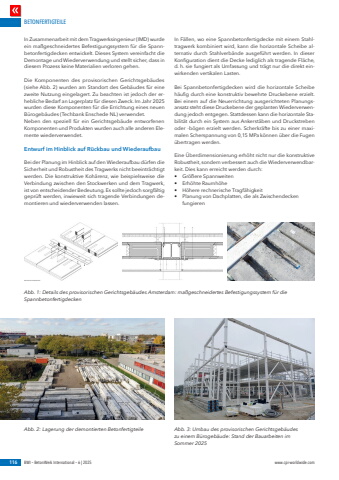 BETONFERTIGTEILE116 BWI %u2013 BetonWerk International %u2013 6 | 2025 www.cpi-worldwide.comIn Zusammenarbeit mit dem Tragwerksingenieur (IMD) wurde ein ma%u00dfgeschneidertes Befestigungssystem f%u00fcr die Spannbetonfertigdecken entwickelt. Dieses System vereinfacht die Demontage und Wiederverwendung und stellt sicher, dass in diesem Prozess keine Materialien verloren gehen.Die Komponenten des provisorischen Gerichtsgeb%u00e4udes (siehe Abb. 2) wurden am Standort des Geb%u00e4udes f%u00fcr eine zweite Nutzung eingelagert. Zu beachten ist jedoch der erhebliche Bedarf an Lagerplatz f%u00fcr diesen Zweck. Im Jahr 2025 wurden diese Komponenten f%u00fcr die Errichtung eines neuen B%u00fcrogeb%u00e4udes (Techbank Enschede NL) verwendet.Neben den speziell f%u00fcr ein Gerichtsgeb%u00e4ude entworfenen Komponenten und Produkten wurden auch alle anderen Elemente wiederverwendet.Entwurf im Hinblick auf R%u00fcckbau und WiederaufbauBei der Planung im Hinblick auf den Wiederaufbau d%u00fcrfen die Sicherheit und Robustheit des Tragwerks nicht beeintr%u00e4chtigt werden. Die konstruktive Koh%u00e4renz, wie beispielsweise die Verbindung zwischen den Stockwerken und dem Tragwerk, ist von entscheidender Bedeutung. Es sollte jedoch sorgf%u00e4ltig gepr%u00fcft werden, inwieweit sich tragende Verbindungen demontieren und wiederverwenden lassen.In F%u00e4llen, wo eine Spannbetonfertigdecke mit einem Stahltragwerk kombiniert wird, kann die horizontale Scheibe alternativ durch Stahlverb%u00e4nde ausgef%u00fchrt werden. In dieser Konfiguration dient die Decke lediglich als tragende Fl%u00e4che, d. h. sie fungiert als Umfassung und tr%u00e4gt nur die direkt einwirkenden vertikalen Lasten.Bei Spannbetonfertigdecken wird die horizontale Scheibe h%u00e4ufig durch eine konstruktiv bewehrte Druckebene erzielt. Bei einem auf die Neuerrichtung ausgerichteten Planungsansatz steht diese Druckebene der geplanten Wiederverwendung jedoch entgegen. Stattdessen kann die horizontale Stabilit%u00e4t durch ein System aus Ankerst%u00e4ben und Druckstreben oder -b%u00f6gen erzielt werden. Scherkr%u00e4fte bis zu einer maximalen Scherspannung von 0,15 MPa k%u00f6nnen %u00fcber die Fugen %u00fcbertragen werden.Eine %u00dcberdimensionierung erh%u00f6ht nicht nur die konstruktive Robustheit, sondern verbessert auch die Wiederverwendbarkeit. Dies kann erreicht werden durch:%u2022 Gr%u00f6%u00dfere Spannweiten%u2022 Erh%u00f6hte Raumh%u00f6he%u2022 H%u00f6here rechnerische Tragf%u00e4higkeit%u2022 Planung von Dachplatten, die als Zwischendecken fungierenAbb. 2: Lagerung der demontierten Betonfertigteile Abb. 3: Umbau des provisorischen Gerichtsgeb%u00e4udes zu einem B%u00fcrogeb%u00e4ude: Stand der Bauarbeiten im Sommer 2025Abb. 1: Details des provisorischen Gerichtsgeb%u00e4udes Amsterdam: ma%u00dfgeschneidertes Befestigungssystem f%u00fcr die Spannbetonfertigdecken