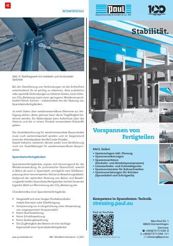 BETONFERTIGTEILEwww.cpi-worldwide.com BWI %u2013 BetonWerk International %u2013 6 | 2025Bei der Detaillierung von Verbindungen ist die Einfachheit entscheidend. Es ist wichtig zu erkennen, dass zus%u00e4tzliche oder spezielle Verbindungen zu h%u00f6heren Kosten, einer h%u00f6heren CO2-Belastung sowie einer geringeren Wiederverwendbarkeit f%u00fchren k%u00f6nnen %u2013 insbesondere bei der Nutzung von Spannbetonfertigdecken.Je mehr Daten %u00fcber wiederverwendbare Elemente zur Verf%u00fcgung stehen, desto genauer kann deren Tragf%u00e4higkeit bestimmt werden. Ein Materialpass kann Aufschluss %u00fcber die Historie und die in einem Produkt verwendeten Rohstoffe geben.Die Qualit%u00e4tssicherung f%u00fcr wiederverwendete Bauprodukte muss noch weiterentwickelt werden und ist Gegenstand eines der Arbeitspakete des ReCreate-Projekts.Soweit bekannt, existieren derzeit weder eine Zertifizierung noch ein Qualit%u00e4tssiegel f%u00fcr wiederverwendbare Bauprodukte.SpannbetonfertigdeckenSpannbetonfertigdecken eignen sich hervorragend f%u00fcr die Wiederverwendung. Ihr prismatischer Querschnitt, sowohl in Beton als auch in Spannstahl, erm%u00f6glicht eine Gr%u00f6%u00dfenanpassung ohne nennenswerten Verlust an Bewehrungsdetails. Aufgrund der optimalen Nutzung von Beton und Bewehrungsstahl stellen Spannbetonfertigdecken bereits heute die logische Wahl zur Minimierung der CO2-Belastung dar.Charakteristika einer Spannbetonfertigdecke%u2022 Hergestellt auf einer langen Produktionsbahn mittels Extrusion oder Gleitfertigung%u2022 Vorspannung nur in L%u00e4ngsrichtung unter Verwendung von vorgespanntem Vorspannstahl%u2022 Keine Querbewehrung%u2022 Keine Schubbewehrung%u2022 Keine Spaltzugbewehrung%u2022 Die Zugfestigkeit des Betons ist eine wichtige Eigenschaft einer Spannbetonfertigdecke!Abb. 4: Stahltragwerk mit vertikaler und horizontaler Stabilit%u00e4tstressing.paul.euMax-Paul-Str. 188525 D%u00fcrmentingenGermany%uf028 +49(0)7371 / 5 00 - 0%uf036 +49(0)7371 / 5 00 - 111%uf02a stressing@paul.euPaul at YouTubestressing-channel.paul.euPAUL liefert%u2022 Spannanlagen inkl. Planung%u2022 Spannverankerungen%u2022 Spannmaschinen (Eindraht- und B%u00fcndelspannpressen)%u2022 Litzenschiebe- und Schneideger%u00e4te%u2022 Spannautomaten f%u00fcr Bahnschwellen%u2022 Spannausr%u00fcstungen f%u00fcr Br%u00fccken(Spannkabel und Schr%u00e4gseile)Kompetenz in Spannbeton-Technik.Stabilit%u00e4t.Vorspannen von Fertigteilen