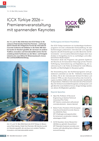 ICCX SPECIAL12 BWI %u2013 BetonWerk International %u2013 6 | 2025 www.cpi-worldwide.comAm 13. und 14. Mai 2026 feiert die ICCX T%u00fcrkiye im Renaissance Polat Istanbul Hotel ihre Premiere %u2013 und bringt damit erstmals das erfolgreiche Format der International Concrete Conference & Exhibition in die T%u00fcrkei. Mit Istanbul wurde ein Standort gew%u00e4hlt, der wie kaum ein anderer Tradition, Innovation und Internationalit%u00e4t vereint. Die Veranstaltung bietet Fachleuten aus der Beton- und Fertigteilindustrie eine neue B%u00fchne f%u00fcr Wissensaustausch, Innovation und Gesch%u00e4ftsentwicklung.Fachkongress mit klarem PraxisfokusDie ICCX T%u00fcrkiye kombiniert ein hochkar%u00e4tiges Konferenzprogramm mit einer umfassenden Fachausstellung. An zwei Konferenztagen pr%u00e4sentieren internationale und regionale Experten aktuelle Entwicklungen aus allen Bereichen der Betonindustrie %u2013 von innovativen Betontechnologien %u00fcber neue Ans%u00e4tze im Fertigteilbau bis hin zu nachhaltigen und erdbebensicheren Baukonzepten.Thematisch deckt das Programm das gesamte Spektrum der Branche ab. Ein besonderer Fokus liegt auf den Themen Vorfertigung, Automatisierung und Digitalisierung, die zunehmend auch in der T%u00fcrkei als Schl%u00fcssel f%u00fcr mehr Effizienz, Qualit%u00e4t und Nachhaltigkeit im Bauwesen gelten. Die Veranstaltung bzw. das Konferenzprogramm wird gestalterisch unterst%u00fctzt von der fib %u2013 F%u00e9d%u00e9ration International du B%u00e9ton. fib ist der internationale Verband f%u00fcr Beton und entstand 1998 aus dem Zusammenschluss des Comit%u00e9 Europ%u00e9en du B%u00e9ton (CEB) und der internationalen Gesellschaft f%u00fcr Spannbeton, F%u00e9d%u00e9ration Internationale de la Pr%u00e9contrainte (fip). Der Verband veranstaltet Kongresse und Symposien und gibt Berichte sowie Bulletins heraus. Einige Vortr%u00e4ge werden von aktiven fib-Mitgliedern gehalten.Keynote Speeches%u2022 Alper Ilki, Professor of Structural Engineering at Istanbul Technical University (ITU), T%u00fcrkei WT: Seismic construction with precast concrete elements %u2013 lessons learned%u2022 Robert Turksi, President of the European Autoclaved Aerated Concrete Association (EAACA), PolenWT: Challenges and opportunities for tomorrow%u2018s construction industry %u2013 advantages of AAC%u2022 Arif Al-Swaidani, Senior Researcher %u2013 IAB Weimar gGmbH, Deutschland WT: Potential of precast concrete construction with rebuilding Syria infrastructure and housingICCX T%u00fcrkiye 2026 %u2013 Premierenveranstaltung mit spannenden Keynotes13.%u201314. Mai 2026, Istanbul, T%u00fcrkeiT%u00dcRKIYE2026Am 13. und 14. Mai 2026 feiert die ICCX T%u00fcrkiye im Renaissance Polat Istanbul Hotel ihre Premiere. Mit Istanbul wurde ein Standort gew%u00e4hlt, der wie kaum ein anderer Tradition, Innovation und Internationalit%u00e4t vereint.