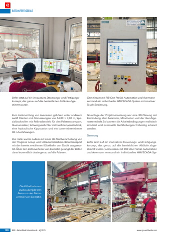 BETONFERTIGTEILE128 BWI %u2013 BetonWerk International %u2013 6 | 2025 www.cpi-worldwide.comZum Lieferumfang von Avermann geh%u00f6ren unter anderem zw%u00f6lf Paletten mit Abmessungen von 14,00 %u00d7 4,00 m, Spezialbockrollen mit Reibradantrieb f%u00fcr den Palettentransport, Querumsetzer, Schwingverdichter mit Hochfrequenztechnik, eine hydraulische Kippstation und ein batteriebetriebener 40-t-Ausfahrwagen.Die Halle wurde zudem mit einer 3D-Stahlverarbeitung von der Progress Group und vollautomatischem Betontransport mit der bereits erw%u00e4hnten K%u00fcbelbahn von Dudik ausgestattet. %u00dcber den Betonverteiler von Elematic gelangt der Beton dann letztendlich dosiergenau auf die Paletten.Grundlage der Projektumsetzung war eine 3D-Planung mit Einbindung aller Zulieferer, Mitarbeiter und der Berufsgenossenschaft. So konnten die Arbeitsbedingungen realistisch simuliert und eventuelle Gef%u00e4hrdungen fr%u00fchzeitig erkannt werden.SteuerungBefer setzt auf ein innovatives Steuerungs- und Fertigungskonzept, das genau auf die betrieblichen Abl%u00e4ufe abgestimmt wurde. Gemeinsam mit RIB One Prefab Automation und Avermann entstand ein individuelles HMI/SCADA-SysBefer setzt auf ein innovatives Steuerungs- und Fertigungskonzept, das genau auf die betrieblichen Abl%u00e4ufe abgestimmt wurde. Gemeinsam mit RIB One Prefab Automation und Avermann entstand ein individuelles HMI/SCADA-System mit intuitiver Touch-Bedienung.Die K%u00fcbelbahn von Dudik %u00fcbergibt den Beton an den Betonverteiler von Elematic.