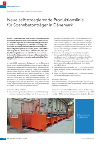 BETONFERTIGTEILE138 BWI %u2013 BetonWerk International %u2013 6 | 2025 www.cpi-worldwide.comBianchi Casseforme st%u00e4rkt seine Pr%u00e4senz in Nordeuropa mit einer neuen, technologisch fortschrittlichen Lieferung, um die Anforderungen der d%u00e4nischen Betonfertigteilindustrie zu erf%u00fcllen. A/S Boligbeton ist seit 1961 ein wichtiger Akteur in der d%u00e4nischen Betonfertigteilindustrie und liefert hochwertige Fertigteile f%u00fcr Gewerbe-, Wohn- und institutionelle Projekte. Das Unternehmen mit Sitz in der N%u00e4he der Stadt L%u00f8sning im Herzen von J%u00fctland und einer zweiten, kleineren Produktionsst%u00e4tte in Kors%u00f8r auf Seeland zeichnet sich durch die Nutzung innovativer und nachhaltiger Technologien aus.Im Jahr 2007 kontaktierte Boligbeton ein (in D%u00e4nemark) wenig bekanntes italienisches Unternehmen namens Bianchi Casseforme in Bezug auf die Lieferung einer selbstreagierenden/selbstspannenden Tr%u00e4gerlinie. Diese Produktionslinie ist noch heute t%u00e4glich in Betrieb. Angesichts der best%u00e4ndig wachsenden Nachfrage nach Spannbetontr%u00e4gern in D%u00e4nemark musste Boligbeton seine Produktion erweitern. Und nat%u00fcrlich fiel die Wahl auf Bianchi Casseforme. Bianchi Casseforme s.r.l. ist ein italienisches Familienunternehmen, das 1964 gegr%u00fcndet wurde. Es ist weltweit t%u00e4tig und bietet eine breite Palette an Dienstleistungen und ma%u00dfgeschneiderten Produkten f%u00fcr die Betonfertigteilindustrie an.Der Lieferumfang umfasste:1. Eine selbstreagierende/selbstspannende Stahlschalung mit einer nutzbaren Innenl%u00e4nge von 30 m und einer maximalen Tragf%u00e4higkeit von 600 Tonnen. Bestehend aus lasttragenden L%u00e4ngstr%u00e4gern, einem festen Quertr%u00e4ger und einem zus%u00e4tzlichen Quertr%u00e4ger, der beim Entspannen und Vorspannen der Litzen verschiebbar ist. Alle Quertr%u00e4ger wurden f%u00fcr die Verankerung der Litzen mit einem vom Kunden gew%u00fcnschten Standardraster von 40 x 40 mm geliefert.2. Das in der selbstreagierenden/selbstspannenden Schalung befindliche hydraulische Betonierchassis von Bianchi von 29 m L%u00e4nge. Es erm%u00f6glicht das %u00d6ffnen und Schlie%u00dfen der Seitenschalungen w%u00e4hrend des Produktionszyklus sowie die Verwendung von austauschbaren Untersichten/Betonierb%u00f6den mit einer Breite von 40 bis 80 cm.3. Untersichten/Betonierb%u00f6den von 29 m L%u00e4nge und 50 cm Breite, komplett mit PVC-Dichtungen mit einer Fase von 15 x 15 mm.4. Einen Satz Seitenschalungen von 29 m L%u00e4nge und einer maximalen Betonierh%u00f6he von 100 cm.Besondere Merkmale:Zwei vollautomatische, SPS-gesteuerte Hydraulikpumpenaggregate mit einem einzigen Hydrauliktank steuern das komplette Hydrauliksystem.Eine Einheit steuert das Mehrlitzenvorspann-/entspannsystem mit vier doppeltwirkenden Hydraulikzylindern (2 x 300 t und 2 x 100 t) und vier Linearcodern, die jeden Zylinder Neue selbstreagierende Produktionslinie f%u00fcr Spannbetontr%u00e4ger in D%u00e4nemarkBianchi Precast Group, 43045 Fornovo di Taro (PR), ItalienSelbstreagierende Produktionslinie
