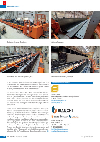 BETONFERTIGTEILE140 BWI %u2013 BetonWerk International %u2013 6 | 2025 www.cpi-worldwide.comin den kritischen Produktionsphasen vollst%u00e4ndig steuern und %u00fcberwachen. Das System senkt und hebt auch automatisch die Manschetten. Auf Knopfdruck f%u00fchrt das System diesen Vorgang ohne Eingreifen eines Bedieners aus.Die zweite Einheit steuert das %u00d6ffnen und Schlie%u00dfen der beiden Seitenschalungen und verriegelt diese, wenn sie vollst%u00e4ndig geschlossen und f%u00fcr den Betoniervorgang bereit sind. Dieses System %u00fcberwacht den Druck im Hydraulikkreislauf und erh%u00f6ht ihn, wenn ein Druckabfall festgestellt wird. Ein mechanisches Verriegeln der Seitenschalungen ist nicht erforderlich.Dank seiner fortschrittlichen technologischen L%u00f6sungen, hohen Qualit%u00e4tsstandards und ma%u00dfgeschneiderten Kundenbetreuung ist Bianchi Casseforme weiterhin der bevorzugte Partner f%u00fcr Betonfertigteilhersteller weltweit. Das Know-how und das Engagement des Unternehmens f%u00fcr Innovation erm%u00f6glichen es ihm, zuverl%u00e4ssige, effiziente und anpassbare Schalungssysteme zu liefern, die den unterschiedlichen Anforderungen der globalen Betonfertigteilindustrie gerecht werden. Dieses neue Projekt mit Boligbeton st%u00e4rkt die Pr%u00e4senz von Bianchi Casseforme in Nordeuropa weiter und best%u00e4tigt seine F%u00fchrungsrolle bei der Lieferung modernster L%u00f6sungen f%u00fcr die Produktion von Spannbetonelementen. nWEITERE INFORMATIONENA/S BOLIGBETON Gl. Pr%u00e6steg%u00e5rdsvej 19 DK-8723 L%u00f8sning, D%u00e4nemarkT +45 75 65 12 55boligbeton@boligbeton.dkwww.boligbeton.dkBianchi Precast Group Via G. di Vittorio, 42 43045 Fornovo di Taro (PR), Italien T +39 0525 400511 info@bianchiprecastgroup.com www.bianchiprecastgroup.com Selbstreagierende SchalungProduktion von Betonfertigteiltr%u00e4gernSeitenschalungenBetonierter Betonfertigteiltr%u00e4ger