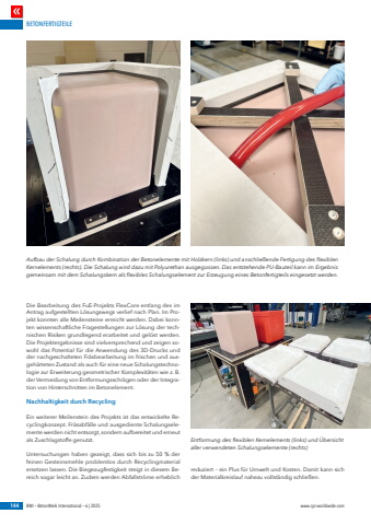 BETONFERTIGTEILE144 BWI %u2013 BetonWerk International %u2013 6 | 2025 www.cpi-worldwide.comDie Bearbeitung des FuE-Projekts FlexCore entlang des im Antrag aufgestellten L%u00f6sungswegs verlief nach Plan. Im Projekt konnten alle Meilensteine erreicht werden. Dabei konnten wissenschaftliche Fragestellungen zur L%u00f6sung der technischen Risiken grundlegend erarbeitet und gel%u00f6st werden. Die Projektergebnisse sind vielversprechend und zeigen sowohl das Potential f%u00fcr die Anwendung des 3D-Drucks und der nachgeschalteten Fr%u00e4sbearbeitung im frischen und ausgeh%u00e4rteten Zustand als auch f%u00fcr eine neue Schalungstechnologie zur Erweiterung geometrischer Komplexit%u00e4ten wie z. B. der Vermeidung von Entformungsschr%u00e4gen oder der Integration von Hinterschnitten im Betonelement.Nachhaltigkeit durch RecyclingEin weiterer Meilenstein des Projekts ist das entwickelte Recyclingkonzept. Fr%u00e4sabf%u00e4lle und ausgediente Schalungselemente werden nicht entsorgt, sondern aufbereitet und erneut als Zuschlagstoffe genutzt.Untersuchungen haben gezeigt, dass sich bis zu 50 % der feinen Gesteinsmehle problemlos durch Recyclingmaterial ersetzen lassen. Die Biegezugfestigkeit steigt in diesem Bereich sogar leicht an. Zudem werden Abfallstr%u00f6me erheblich reduziert %u2013 ein Plus f%u00fcr Umwelt und Kosten. Damit kann sich der Materialkreislauf nahezu vollst%u00e4ndig schlie%u00dfen.Aufbau der Schalung durch Kombination der Betonelemente mit Holzkern (links) und anschlie%u00dfende Fertigung des flexiblen Kernelements (rechts). Die Schalung wird dazu mit Polyurethan ausgegossen. Das entstehende PU-Bauteil kann im Ergebnis gemeinsam mit dem Schalungskern als flexibles Schalungselement zur Erzeugung eines Betonfertigteils eingesetzt werden. Entformung des flexiblen Kernelements (links) und %u00dcbersicht aller verwendeten Schalungselemente (rechts)