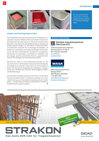 BETONFERTIGTEILEwww.cpi-worldwide.com BWI %u2013 BetonWerk International %u2013 6 | 2025 145Industrie und Forschung Hand in HandDas Projekt FlexCore zeigt eindrucksvoll, wie erfolgreiche Kooperation zwischen Wissenschaft und Industrie funktioniert. Das Steinbeis-Innovationszentrum FiberCrete brachte seine Expertise in den Bereichen Baustoffentwicklung, Robotik und Fertigungstechnologien ein. Die Wasa Compound GmbH, internationaler Spezialist f%u00fcr hochwertige Kunststoffe und Elastomere, entwickelte und testete die flexiblen PU-Kernelemente, die den entscheidenden Durchbruch erm%u00f6glichten. Gemeinsam ist es gelungen, ein Verfahren zu etablieren, das den Spagat zwischen technischer Pr%u00e4zision, gestalterischer Freiheit und %u00f6kologischer Verantwortung meistert.Mit FlexCore liegt nun eine Schl%u00fcsseltechnologie vor, die das Potenzial hat, die Produktion komplexer Betonfertigteile grundlegend zu ver%u00e4ndern. Damit kann die Technologie ein echter Durchbruch f%u00fcr Fertigteilwerke, Architekten und Bauherren sein, die Wert auf Innovation, Nachhaltigkeit und Wirtschaftlichkeit legen.Das Steinbeis-Innovationszentrum FiberCrete und die Wasa Compound GmbH haben mit FlexCore gezeigt, wie praxisnahe Forschung und industrielle Umsetzung Hand in Hand gehen %u2013 und wie dadurch v%u00f6llig neue Standards in der Betonfertigteilindustrie gesetzt werden. nWEITERE INFORMATIONENSteinbeis-Innovationszentrum FiberCreteOtto-Schmerbach-Str. 19, Halle 1209117 Chemnitz, Deutschlandsu1612@stw.dewww.fibercrete.deWASA Compound GmbH & Co. KG Meininger Stra%u00dfe 9 98617 Neubrunn, Deutschland T +49 36947 5670 wetcast@wasa-technologies.com www.wasa-technologies.comEin anschauliches Beispiel ist der im Projekt gefertigte Demonstrator in Form eines Pflanzgef%u00e4%u00dfes.