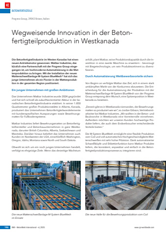 BETONFERTIGTEILE146 BWI %u2013 BetonWerk International %u2013 6 | 2025 www.cpi-worldwide.comDie Betonfertigteilindustrie im Westen Kanadas hat einen neuen Antriebsmotor gewonnen: Matbar Industries, das k%u00fcrzlich eine Partnerschaft mit der Progress Group eingegangen ist, um hochmoderne Automatisierung in die Mattenproduktion zu bringen. Mit der Installation der neuen Mattenschwei%u00dfanlage M-System BlueMesh%u00ae hat sich das junge Unternehmen als ein Pionier in der Mattenproduktion in der gesamten Region positioniert.Ein junges Unternehmen mit gro%u00dfen AmbitionenDas Unternehmen Matbar Industries wurde 2024 gegr%u00fcndet und hat sich schnell als zukunftsorientierter Akteur in der kanadischen Betonfertigteilindustrie etabliert. In seiner 1.850 Quadratmeter gro%u00dfen Produktionsst%u00e4tte in Alberta, Kanada, produziert das Unternehmen Betonfertigteilwandelemente mit kundenspezifischen Aussparungen sowie Bewehrungsmatten f%u00fcr Fu%u00dfbodensysteme.Matbar Industries liefert Bewehrungsmatten an Betonfertigteilhersteller und Betonbauunternehmen in ganz Westkanada, darunter British Columbia, Alberta, Saskatchewan und Manitoba. Dar%u00fcber hinaus beliefert das Unternehmen auch Kunden im Nordwesten der USA, einschlie%u00dflich Washington, Oregon, Idaho, Montana sowie North und South Dakota.Obwohl es sich um ein noch junges Unternehmen handelt, verfolgt es ehrgeizige Ziele. Wenn das derzeitige Wachstum anh%u00e4lt, plant Matbar, seine Produktionskapazit%u00e4t durch die Investition in eine zweite Maschine zu erweitern %u2013 bevorzugt mit Biegetechnologie, um sein Produktsortiment zu diversifizieren.Durch Automatisierung Wettbewerbsvorteile sichernVon Beginn an verfolgte Matbar das Ziel, sich in einem stark umk%u00e4mpften Markt von der Konkurrenz abzusetzen. Die Entscheidung f%u00fcr die Automatisierung der Produktion mit der Mattenschwei%u00dfanlage M-System BlueMesh von der Progress Group entsprang dem Wunsch, eine Spitzenposition in Westkanada zu besetzen.%u201eDerzeit gibt es in Westkanada niemanden, der Bewehrungsmatten so produziert wie wir%u201d, so Jordan Gibson, Vertriebsmitarbeiter bei Matbar Industries. %u201eWir wollten in der Beton- und Baubranche in Westkanada eine Vorreiterrolle einnehmen. Au%u00dferdem m%u00f6chten wir unseren Kunden hochwertige Produkte liefern, die auch dem Endverbraucher entscheidende Vorteile bieten.%u201dDie M-System BlueMesh erm%u00f6glicht eine flexible Produktion vom Coil und voll automatisches Hochgeschwindigkeits-Mattenschwei%u00dfen mit sehr hoher Pr%u00e4zision. Dank automatisierter Schwei%u00dfk%u00f6pfe und Etikettierfunktion kann Matbar Produkte liefern, die konsistent, anpassbar und einfach in die Betonfertigteilproduktionsprozesse zu integrieren sind.Wegweisende Innovation in der Betonfertigteilproduktion in WestkanadaProgress Group, 39042 Brixen, ItalienDie neue Mattenschwei%u00dfanlage M-System BlueMesh im EinsatzDie neue Halle f%u00fcr die Bewehrungsproduktion vom Coil