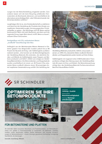 NACHRICHTENwww.cpi-worldwide.com BWI %u2013 BetonWerk International %u2013 6 | 2025 15nungen bei der Betonherstellung eingesetzt werden. Zum anderen lassen sich die beim Recycling anfallenden Feinmaterialien als Brechsande abtrennen und anschlie%u00dfend als alternatives zementhaltiges Roh- oder F%u00fcllmaterial wieder der Zementproduktion zuf%u00fchren.%u201cLangfristiges Ziel ist es, eine Kreislaufwirtschaft zu etablieren und damit bei der Herstellung der Produkte dem Einsatz von rezyklierten Gesteinsk%u00f6rnungen Vorrang gegen%u00fcber Prim%u00e4rrohstoffen zu geben. %u201eDie Nachfrage nach RC-Beton w%u00e4chst kontinuierlich. Mehr und mehr Bauherren, wie eben auch die Lagrande Group, legen Wert darauf, mit RC-Beton zu bauen%u201c, erl%u00e4utert Oliver Schumacher.Fertigteilbau mit CO2-reduziertem Beton %u201eevoBuild%u201c beschleunigt den BauAnf%u00e4nglich war der Wohnkomplex Maison Westend in Ortbeton geplant. Aus Zeitgr%u00fcnden mussten jedoch bis zu 80 Prozent der Bauteile als Fertig- oder Halbfertigteile aus Beton realisiert werden. %u201eHier konnten wir die Betonfertigteilsparte der Heidelberg Materials AG einbinden, die s%u00e4mtliche Decken und W%u00e4nde als Halbfertigteile sowie Treppen und Balkone produziert und liefert%u201c, erkl%u00e4rt Lars L%u00f6wigt von Heidelberg Materials Beton. Die Elementdecken und Doppelw%u00e4nde wurden anschlie%u00dfend mit einem um 30 Prozent CO2-reduzierten Beton evoBuild inklusive einem 30-prozentigen Anteil rezyklierter Gesteinsk%u00f6rnung verf%u00fcllt. Die Verf%u00fcllung der Halbfertigteile mit insgesamt zirka 3.500 Kubikmetern Transportbeton erfolgte %u00fcber Betonpumpen der Heidelberg Materials AG sowie mit Kran und K%u00fcbeln. Die Beton%u00fcberwachung erfolgt %u00fcber das Heidelberg-Materials-Tochterunternehmen BetoTech Baustofflabor GmbH.Heidelberg Materials produzierte, lieferte und pumpte u.a. seinen um 30% CO2-reduzierten Beton evoBuild. Elementdecken und Doppelw%u00e4nde warten bereits auf ihren Einbau. %u00a9Heidelberg Materials AG I Linus Lintnerwww.sr-schindler.comH%u00f6chsteLeistung & Qualit%u00e4tMaximierteMaschinenverf%u00fcgbarkeitGeringe WartungsanforderungenOPTIMIEREN SIE IHREBETONPRODUKTE DownloadBrosch%u00fcrenSR Schindler liefert innovative Maschinen und Produktionslinien, um Betonpflastersteine und -platten in Premiumprodukte zu verwandeln. Ob kalibrieren, schleifen,strahlen, curlen, beschichten, spalten, Kanten bearbeiten oder sonstige Sonderl%u00f6sungen im Betonsteinbereich %u2013 unsere L%u00f6sungen garantieren hochwertige, einzigartige Oberfl%u00e4chen, die %u00fcberzeugen.Innovativ. Zuverl%u00e4ssig. Effi zient.F%u00dcR BETONSTEINE UND PLATTEN