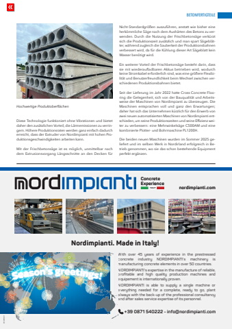 BETONFERTIGTEILEwww.cpi-worldwide.com BWI %u2013 BetonWerk International %u2013 6 | 2025 155Diese Technologie funktioniert ohne Vibrationen und bietet daher den zus%u00e4tzlichen Vorteil, die L%u00e4rmemissionen zu verringern. H%u00f6here Produktionsraten werden ganz einfach dadurch erreicht, dass der Extruder von Nordimpianti mit hohen Produktionsgeschwindigkeiten arbeiten kann.Mit der Frischbetons%u00e4ge ist es m%u00f6glich, unmittelbar nach dem Extrusionsvorgang L%u00e4ngsschnitte an den Decken f%u00fcr Nicht-Standardgr%u00f6%u00dfen auszuf%u00fchren, anstatt wie bisher eine herk%u00f6mmliche S%u00e4ge nach dem Aush%u00e4rten des Betons zu verwenden. Durch die Nutzung der Frischbetons%u00e4ge verk%u00fcrzt sich die Produktionszeit zus%u00e4tzlich und man spart S%u00e4gebl%u00e4tter, w%u00e4hrend zugleich die Sauberkeit der Produktionsbahnen verbessert wird, da f%u00fcr die K%u00fchlung dieser Art S%u00e4geblatt kein Wasser ben%u00f6tigt wird.Ein weiterer Vorteil der Frischbetons%u00e4ge besteht darin, dass sie mit wiederaufladbaren Akkus betrieben wird, wodurch keine Stromkabel erforderlich sind, was eine gr%u00f6%u00dfere Flexibilit%u00e4t und Benutzerfreundlichkeit beim Wechsel zwischen verschiedenen Produktionsbahnen bietet.Seit der Lieferung im Jahr 2022 hatte Cross Concrete Flooring die Gelegenheit, sich von der Bauqualit%u00e4t und Arbeitsweise der Maschinen von Nordimpianti zu %u00fcberzeugen. Die Maschinen entsprachen voll und ganz den Erwartungen; daher hat sich das Unternehmen k%u00fcrzlich f%u00fcr den Erwerb von zwei neuen automatisierten Maschinen von Nordimpianti entschieden, um seine Produktionszeiten und seine Effizienz weiter zu verbessern: eine Mehrwinkels%u00e4ge C500AM und eine kombinierte Plotter- und Bohrmaschine PL1200H.Die beiden neuen Maschinen wurden im Sommer 2025 geliefert und im selben Werk in Nordirland erfolgreich in Betrieb genommen, wo sie das schon bestehende Equipment perfekt erg%u00e4nzen.Hochwertige Produktoberfl%u00e4chenWith over 45 years of experience in the prestressed concrete industry NORDIMPIANTI%u2019s machinery is manufacturing concrete elements in over 50 countries.NORDIMPIANTI%u2019s expertise in the manufacture of reliable, profitable and high quality production machines and equipement is internationally proven.NORDIMPIANTI is able to supply a single machine or everything needed for a complete, ready to go, plant always with the back-up of the professional consultancy and after sales service expertise of its personnel.adv | webnue.itConcreteExperience ITA LY nordimpianti.comNordimpianti. Made in Italy!%ue138+39 0871 540222 - info@nordimpianti.com