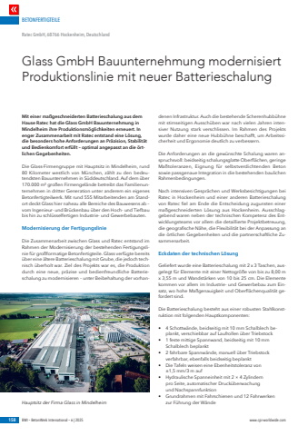 BETONFERTIGTEILE158 BWI %u2013 BetonWerk International %u2013 6 | 2025 www.cpi-worldwide.comMit einer ma%u00dfgeschneiderten Batterieschalung aus dem Hause Ratec hat die Glass GmbH Bauunternehmung in Mindelheim ihre Produktionsm%u00f6glichkeiten erneuert. In enger Zusammenarbeit mit Ratec entstand eine L%u00f6sung, die besonders hohe Anforderungen an Pr%u00e4zision, Stabilit%u00e4t und Bedienkomfort erf%u00fcllt %u2013 optimal angepasst an die %u00f6rtlichen Gegebenheiten.Die Glass-Firmengruppe mit Hauptsitz in Mindelheim, rund 80 Kilometer westlich von M%u00fcnchen, z%u00e4hlt zu den bedeutendsten Bauunternehmen in S%u00fcddeutschland. Auf dem %u00fcber 170.000 m%u00b2 gro%u00dfen Firmengel%u00e4nde betreibt das Familienunternehmen in dritter Generation unter anderem ein eigenes Betonfertigteilwerk. Mit rund 555 Mitarbeitenden am Standort deckt Glass hier nahezu alle Bereiche des Bauwesens ab %u2013 vom Ingenieur- und Br%u00fcckenbau %u00fcber den Hoch- und Tiefbau bis hin zu schl%u00fcsselfertigen Industrie- und Gewerbebauten.Modernisierung der FertigungslinieDie Zusammenarbeit zwischen Glass und Ratec entstand im Rahmen der Modernisierung der bestehenden Fertigungslinie f%u00fcr gro%u00dfformatige Betonfertigteile. Glass verf%u00fcgte bereits %u00fcber eine %u00e4ltere Batterieschalung mit Grube, die jedoch technisch %u00fcberholt war. Ziel des Projekts war es, die Produktion durch eine neue, pr%u00e4zise und bedienfreundliche Batterieschalung zu modernisieren %u2013 unter Beibehaltung der vorhandenen Infrastruktur. Auch die bestehende Scherenhubb%u00fchne mit stirnseitigen Aussch%u00fcben war nach vielen Jahren intensiver Nutzung stark verschlissen. Im Rahmen des Projekts wurde daher eine neue Hubb%u00fchne beschafft, um Arbeitssicherheit und Ergonomie deutlich zu verbessern.Die Anforderungen an die gew%u00fcnschte Schalung waren anspruchsvoll: beidseitig schalungsglatte Oberfl%u00e4chen, geringe Ma%u00dftoleranzen, Eignung f%u00fcr selbstverdichtenden Beton sowie passgenaue Integration in die bestehenden baulichen Rahmenbedingungen.Nach intensiven Gespr%u00e4chen und Werksbesichtigungen bei Ratec in Hockenheim und einer anderen Batterieschalung von Ratec fiel am Ende die Entscheidung zugunsten einer ma%u00dfgeschneiderten L%u00f6sung aus Hockenheim. Ausschlaggebend waren neben der technischen Kompetenz des Entwicklungsteams vor allem die detaillierte Projektbetreuung, die geografische N%u00e4he, die Flexibilit%u00e4t bei der Anpassung an die %u00f6rtlichen Gegebenheiten und die partnerschaftliche Zusammenarbeit.Eckdaten der technischen L%u00f6sung Geliefert wurde eine Batterieschalung mit 2 x 3 Taschen, ausgelegt f%u00fcr Elemente mit einer Nettogr%u00f6%u00dfe von bis zu 8,00 m x 3,55 m und Wandst%u00e4rken von 10 bis 25 cm. Die Elemente kommen vor allem im Industrie- und Gewerbebau zum Einsatz, wo hohe Ma%u00dfgenauigkeit und Oberfl%u00e4chenqualit%u00e4t gefordert sind. Die Batterieschalung besteht aus einer robusten Stahlkonstruktion mit folgenden Hauptkomponenten:%u2022 4 Schottw%u00e4nde, beidseitig mit 10 mm Schalblech beplankt, verschiebbar auf Laufrollen %u00fcber Triebstock%u2022 1 feste mittige Spannwand, beidseitig mit 10 mm Schalblech beplankt%u2022 2 fahrbare Spannw%u00e4nde, manuell %u00fcber Triebstock verfahrbar, ebenfalls beidseitig beplankt%u2022 Die Tafeln weisen eine Ebenheitstoleranz von %u00b11,5 mm/3 m auf%u2022 Hydraulische Spanneinheit mit 2 %u00d7 4 Zylindern pro Seite, automatischer Druck%u00fcberwachung und Nachspannfunktion%u2022 Grundrahmen mit Fahrschienen und 12 Fahrwerken zur F%u00fchrung der W%u00e4ndeGlass GmbH Bauunternehmung modernisiert Produktionslinie mit neuer Batterieschalung Ratec GmbH, 68766 Hockenheim, Deutschland Hauptsitz der Firma Glass in Mindelheim