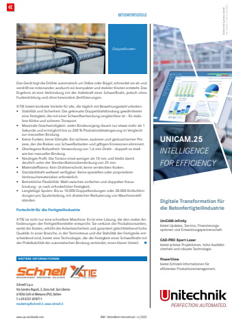 BETONFERTIGTEILEwww.cpi-worldwide.com BWI %u2013 BetonWerk International %u2013 6 | 2025Das Ger%u00e4t legt die Dr%u00e4hte automatisch um St%u00e4be oder B%u00fcgel, schneidet sie ab und verdrillt sie miteinander, wodurch ein kompakter und stabiler Knoten entsteht. Das Ergebnis ist eine Verbindung mit der Haltekraft einer Schwei%u00dfnaht, jedoch ohne Funkenbildung und ohne besondere Zertifizierungen.X-TIE bietet konkrete Vorteile f%u00fcr alle, die t%u00e4glich mit Bewehrungsstahl arbeiten:%u2022 Stabilit%u00e4t und Sicherheit: Die gekreuzte Doppeldrahtbindung gew%u00e4hrleistet eine Festigkeit, die mit einer Schwei%u00dfverbindung vergleichbar ist %u2013 f%u00fcr stabilere K%u00f6rbe und sicheren Transport.%u2022 Maximale Geschwindigkeit: Jeder Bindevorgang dauert nur etwas mehr als 1 Sekunde und erm%u00f6glicht bis zu 200 % Produktivit%u00e4tssteigerung im Vergleich zur manuellen Bindung.%u2022 Keine Funken, keine D%u00e4mpfe: Ein sicherer, sauberer und ger%u00e4uscharmer Prozess, der die Risiken von Schwei%u00dfarbeiten und giftigen Emissionen eliminiert.%u2022 %u00dcberlegene Robustheit: Verwendung von 1,6-mm-Draht %u2013 doppelt so stark wie bei manueller Bindung.%u2022 Niedriges Profil: Die Torsion misst weniger als 10 mm und bleibt damit deutlich unter der Standardbeton%u00fcberdeckung von 25 mm.%u2022 Materialeffizienz: Kein Drahtverschnitt, keine versteckten Kosten.%u2022 Standarddraht weltweit verf%u00fcgbar: Keine speziellen oder propriet%u00e4ren Verbrauchsmaterialien erforderlich.%u2022 Betriebliche Flexibilit%u00e4t: Wahl zwischen einfacher und doppelter Kreuzbindung %u2013 je nach erforderlicher Festigkeit.%u2022 Langlebige Spulen: Bis zu 10.000 Doppelbindungen oder 20.000 Einfachbindungen pro Spulenladung, mit drastischer Reduzierung von Maschinenstillst%u00e4nden.Fortschritt f%u00fcr die FertigteilindustrieX-TIE ist nicht nur eine schnellere Maschine: Es ist eine L%u00f6sung, die den realen Anforderungen der Fertigteilhersteller entspricht. Sie verk%u00fcrzt die Produktionszeiten, senkt die Kosten, erh%u00f6ht die Arbeitssicherheit und garantiert gleichbleibend hohe Qualit%u00e4t. In einer Branche, in der Termintreue und die Stabilit%u00e4t der Fertigteile entscheidend sind, bietet eine Technologie, die die Festigkeit einer Schwei%u00dfnaht mit der Praktikabilit%u00e4t der automatischen Bindung verbindet, einen klaren Vorteil. nDoppelknotenWEITERE INFORMATIONENSchnell S.p.a.Via Sandro Rupoli, 2, Zona Ind. San Liberio61036 Colli al Metauro (PU), ItalienT +39 0721 878711marketing@schnell.it, www.schnell.itDigitale Transformation f%u00fcr die Betonfertigteilindustrie UniCAM.infinitybietet Updates, Service, Finanzierungsoptionen und Entwicklungspartnerschaft.CAD-PRO Xpert Laserbietet pr%u00e4zise Projektionen, hohe Ausfallsicherheit und robuste Technologie.PowerViewbietet Echtzeit-Informationen f%u00fcr effizientes Produktionsmanagement.UNICAM.25INTELLIGENCEFOR EFFICIENCYUnitechnik Systems GmbH Fritz-Kotz-Str. 14, D-51674 Wiehl