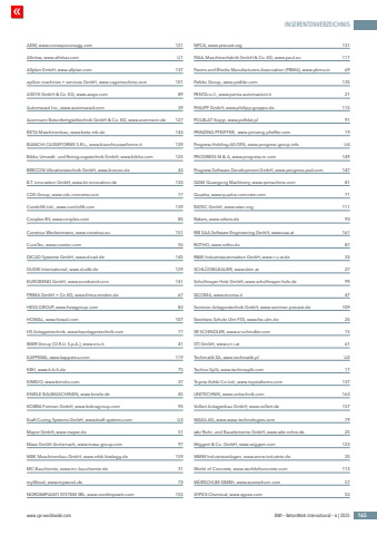 INSERENTENVERZEICHNISwww.cpi-worldwide.com BWI %u2013 BetonWerk International %u2013 6 | 2025 165AEM, www.conexpoconagg.com 121Afinitas, www.afinitas.com U1Allplan GmbH, www.allplan.com 137apilion machines + services GmbH, www.cagemachine.com 101ASSYX GmbH & Co. KG, www.assyx.com 89Automacad Inc., www.automacad.com 39Avermann Betonfertigteiltechnik GmbH & Co. KG, www.avermann.de 127BETA Maschinenbau, www.beta-mb.de 143BIANCHI CASSEFORME S.R.L., www.bianchicasseforme.it 139Bibko Umwelt- und Reinigungstechnik GmbH, www.bibko.com 125BRECON Vibrationstechnik GmbH, www.brecon.de 43B.T. innovation GmbH, www.bt-innovation.de 133CDS Group, www.cds-concrete.com 77Combilift Ltd., www.combilift.com 139Conplex BV, www.conplex.com 85Construx Weckenmann, www.construx.eu 151CureTec, www.curetec.com 55DICAD Systeme GmbH, www.dicad.de 145DUDIK International, www.dudik.de 129EUROBEND GmbH, www.eurobend.com 141FRIMA GmbH + Co KG, www.frima-emden.de 67HESS GROUP, www.hessgroup.com 83HOWAL, www.howal.com 107HS Anlagentechnik, www.hsanlagentechnik.com 77IMER Group (O.R.U. S.p.A.), www.oru.it 41KAPPEMA, www.kappema.com 119KBH, www.k-b-h.de 75KIMIDO, www.kimido.com 37KNIELE BAUMASCHINEN, www.kniele.de 45KOBRA Formen GmbH, www.kobragroup.com 95Kraft Curing Systems GmbH, www.kraft-systems.com U3Mapei GmbH, www.mapei.de 51Masa GmbH Andernach, www.masa-group.com 97MBK Maschinenbau GmbH, www.mbk-kisslegg.de 159MC-Bauchemie, www.mc-bauchemie.de 31myWood, www.mywood.de 73NORDIMPIANTI SYSTEM SRL, www.nordimpianti.com 155NPCA, www.precast.org 131PAUL Maschinenfabrik GmbH & Co. KG, www.paul.eu 117Pavers and Blocks Manufacturers Association (PBMA), www.pbma.in 69Peikko Group, www.peikko.com 135PENTA s.r.l., www.penta-automazioni.it 21PHILIPP GmbH, www.philipp-gruppe.de 115POLBLAT Kopyt, www.polblat.pl 91PRINZING PFEIFFER, www.prinzing-pfeiffer.com 19Progress Holding AG/SPA, www.progress-group.info U4PROGRESS M & A, www.progress-m.com 149Progress Software Development GmbH, www.progress-psd.com 147QGM Quangong Machinery, www.qzmachine.com 81Quadra, www.quadra-concrete.com 71RATEC GmbH, www.ratec.org 111Rekers, www.rekers.de 93RIB SAA Software Engineering GmbH, www.saa.at 161ROTHO, www.rotho.de 87R&W Industrieautomation GmbH, www.r-u-w.de 33SCHL%u00dcSSELBAUER, www.sbm.at 27Schollmayer Holz GmbH, www.schollmayer-holz.de 99SICOMA, www.sicoma.it 47Sommer Anlagentechnik GmbH, www.sommer-precast.de 109Steinbeis Schule Ulm FSS, www.fss-ulm.de 25SR SCHINDLER, www.sr-schindler.com 15STI GmbH, www.s-t-i.at 61Techmatik SA, www.techmatik.pl U2Techno Split, www.technosplit.com 17Toyota Kohki Co Ltd., www.toyotaforms.com 137UNITECHNIK, www.unitechnik.com 163Vollert Anlagenbau GmbH, www.vollert.de 157WASA AG, www.wasa-technologies.com 79wbr Rohr- und Bauelemente GmbH, www.wbr-rohre.de 25Wiggert & Co. GmbH, www.wiggert.com 123WMW Industrieanlagen, www.wmw-industrie.de 35World of Concrete, www.worldofconcrete.com 113W%u00dcRSCHUM GMBH, www.wuerschum.com 57XYPEX Chemical, www.xypex.com 53