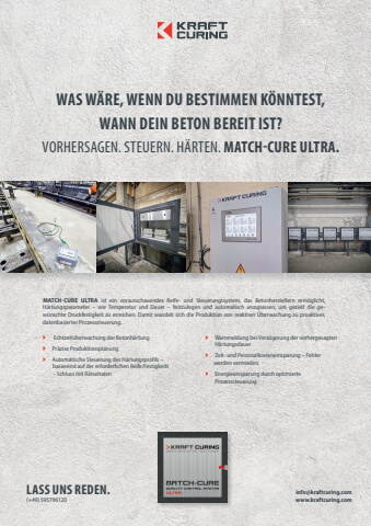 info@kraftcuring.com www.kraftcuring.comWAS W%u00c4RE, WENN DU BESTIMMEN K%u00d6NNTEST, WANN DEIN BETON BEREIT IST?VORHERSAGEN. STEUERN. H%u00c4RTEN. MATCH-CURE ULTRA.MATCH-CURE ULTRA ist ein vorausschauendes Reife- und Steuerungssystem, das Betonherstellern erm%u00f6glicht, H%u00e4rtungsparameter %u2013 wie Temperatur und Dauer %u2013 festzulegen und automatisch anzupassen, um gezielt die gew%u00fcnschte Druckfestigkeit zu erreichen. Damit wandelt sich die Produktion von reaktiver %u00dcberwachung zu proaktiver, datenbasierter Prozesssteuerung. %uf07d Echtzeit%u00fcberwachung der Betonh%u00e4rtung%uf07d Pr%u00e4zise Produktionsplanung%uf07d Automatische Steuerung des H%u00e4rtungsprofils %u2013 basierend auf der erforderlichen Reife/Festigkeitt %u2013 Schluss mit R%u00e4tselraten%uf07d Warnmeldung bei Verz%u00f6gerung der vorhergesagten H%u00e4rtungsdauer%uf07d Zeit- und Personalkosteneinsparung %u2013 Fehler werden vermieden%uf07d Energieeinsparung durch optimierte ProzesssteuerungLASS UNS REDEN.(+49) 595796120