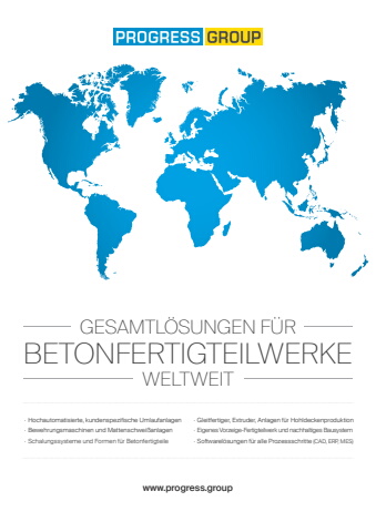 www.progress.groupBETONFERTIGTEILWERKEGESAMTL%u00d6SUNGEN F%u00dcRWELTWEIT%u00b7 Hochautomatisierte, kundenspezifische Umlaufanlagen%u00b7 Bewehrungsmaschinen und Mattenschwei%u00dfanlagen%u00b7 Schalungssysteme und Formen f%u00fcr Betonfertigteile %u00b7 Gleitfertiger, Extruder, Anlagen f%u00fcr Hohldeckenproduktion %u00b7 Eigenes Vorzeige-Fertigteilwerk und nachhaltiges Bausystem%u00b7 Softwarel%u00f6sungen f%u00fcr alle Prozessschritte (CAD, ERP, MES)