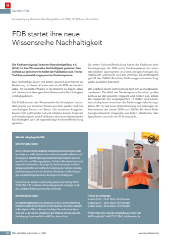 NACHRICHTEN22 BWI %u2013 BetonWerk International %u2013 6 | 2025 www.cpi-worldwide.comDie Fachvereinigung Deutscher Betonfertigteilbau e.V. (FDB) hat ihre Wissensreihe Nachhaltigkeit gestartet. Den Auftakt zur Wissensreihe bildet die Publikation zum Thema Treibhauspotenzial vorgespannter Deckensysteme.Das nachhaltige Bauen mit Beton gewinnt zunehmend an Bedeutung. In diesem Kontext sieht es die FDB als ihre Aufgabe, ihr fundiertes Wissen in die Branche zu tragen. Dazu soll die neu ins Leben gerufene Wissensreihe Nachhaltigkeit vorrangig dienen.Die Publikationen der Wissensreihe Nachhaltigkeit behandeln jeweils ein einzelnes Thema aus dem weiten Feld des nachhaltigen Bauens mit Beton. Die einzelnen Ausgaben bauen nicht aufeinander auf und erheben keinen Anspruch auf Vollst%u00e4ndigkeit. Jede Publikation der neuen Wissensreihe Nachhaltigkeit wird als eigenst%u00e4ndige Fachver%u00f6ffentlichung gesehen.Zur ersten Fachver%u00f6ffentlichung haben die Fachleute einer Arbeitsgruppe der FDB sechs Deckensysteme mit unterschiedlichen Spannweiten an einem dreigeschossigen B%u00fcrogeb%u00e4ude untersucht und das jeweilige Gesamttragwerk gem%u00e4%u00df der DAfStb-Richtlinie Treibhausgasreduzierte Tragwerke aus Beton bilanziert.Das Ergebnis dieser Untersuchung l%u00e4sst sich wie folgt zusammenfassen: Die Wahl des Deckensystems hat einen gro%u00dfen Einfluss auf das gesamte Tragwerk und dessen CO2-Bilanz. Die Tragwerke mit vorgespannten TT-Platten und Spannbetonhohlplatten erreichen die Treibhausgas-Minderungsklasse TM-70, was einer Unterschreitung des zul%u00e4ssigen Referenzwertes des Jahres 2020 nach DAfStb-Richtlinie Treibhausgasreduzierte Tragwerke aus Beton, Stahlbeton oder Spannbeton um mehr als 70 % entspricht.FDB startet ihre neue Wissensreihe NachhaltigkeitFachvereinigung Deutscher Betonfertigteilbau e.V. (FDB), 53179 Bonn, DeutschlandAktuelle Lehrg%u00e4nge der FDBBertonfertigteilexperteDieser in Deutschland einzigartige Lehrgang zum Betonfertigteilexperten richtet sich an Mitarbeiter/innen im Betonfertigteilbau (Betrieb und Montage). Als Betonfertigteilexperte/Betonfertigteilexpertin %u00fcbernehmen Sie Fach- und F%u00fchrungsaufgaben. Sie f%u00fchren Mitarbeiter/innen und %u00fcberwachen Bauarbeiten. Sie sorgen f%u00fcr die Beachtung der Unfallverh%u00fctungsvorschriften und sind f%u00fcr die Einhaltung der Termine zust%u00e4ndig. Der Praxisbezug steht mit verschiedenen Workshops und Besichtigungen von Betonfertigteilwerken in der Region im Vordergrund.Im Anschluss an die Teile I und II erfolgt jeweils eine Pr%u00fcfung. 09.02. - 20.02.2026 // 90 U-Stunden. Veranstaltungsort des Lehrgangs ist das Aus- und Weiterbildungszentrum Bau in Kreuztal. BetonfertigteilmonteurAls Betonfertigteilmonteur/in montieren Sie die in einem Betonfertigteilwerk hergestellten Fertigteile auf der Baustelle. Um diese anspruchsvolle Aufgabe erf%u00fcllen zu k%u00f6nnen, ben%u00f6tigen Sie umfassende Kenntnisse, die Sie bei diesem Lehrgang in drei Modulen erwerben k%u00f6nnen. Der Lehrgang findet ebenfalls im AWZ Bau, Kreuztal statt. Termine des Lehrgangs: Modul A 19.01. - 23.01.2026 // 40 U-StundenModul B 26.01. - 30.01.2026 // 40 U-StundenModul C 02.02. - 06.02.2026 // 40 U-StundenWeitere Infos unter www.fdb-fertigteilbau.de und bei der AWZ Bau gGmbH, T +49 2732 2794-3, info@awz-bau.de