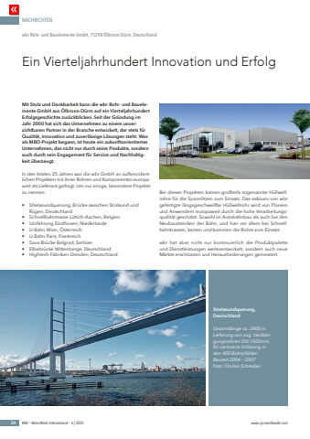 NACHRICHTEN24 BWI %u2013 BetonWerk International %u2013 6 | 2025 www.cpi-worldwide.comMit Stolz und Dankbarkeit kann die wbr Rohr- und Bauelemente GmbH aus %u00d6lbronn-D%u00fcrrn auf ein Vierteljahrhundert Erfolgsgeschichte zur%u00fcckblicken. Seit der Gr%u00fcndung im Jahr 2000 hat sich das Unternehmen zu einem unverzichtbaren Partner in der Branche entwickelt, der stets f%u00fcr Qualit%u00e4t, Innovation und zuverl%u00e4ssige L%u00f6sungen steht. Was als MBO-Projekt begann, ist heute ein zukunftsorientiertes Unternehmen, das nicht nur durch seine Produkte, sondern auch durch sein Engagement f%u00fcr Service und Nachhaltigkeit %u00fcberzeugt.In den letzten 25 Jahren war die wbr GmbH an au%u00dferordentlichen Projekten mit ihren Rohren und Komponenten europaweit als Lieferant gefragt. Um nur einige, besondere Projekte zu nennen:%u2022 Strelasundquerung, Br%u00fccke zwischen Stralsund und R%u00fcgen, Deutschland%u2022 Schnellbahntrasse L%u00fcttich-Aachen, Belgien%u2022 Umfahrung Eindhoven, Niederlande%u2022 U-Bahn Wien, %u00d6sterreich%u2022 U-Bahn Paris, Frankreich%u2022 Sava-Br%u00fccke Belgrad, Serbien%u2022 Elbebr%u00fccke Wittenberge, Deutschland%u2022 Hightech-Fabriken Dresden, DeutschlandBei diesen Projekten kamen gro%u00dfteils sogenannte H%u00fcllwellrohre f%u00fcr die Spannlitzen zum Einsatz. Das exklusiv von wbr gefertigte l%u00e4ngsgeschwei%u00dfte H%u00fcllwellrohr wird von Planern und Anwendern europaweit durch die hohe Verarbeitungsqualit%u00e4t gesch%u00e4tzt. Sowohl im Autobahnbau als auch bei den Neubaustrecken der Bahn, und hier vor allem bei Schnellbahntrassen, kamen und kommen die Rohre zum Einsatz.wbr hat aber nicht nur kontinuierlich die Produktpalette und Dienstleistungen weiterentwickelt, sondern auch neue M%u00e4rkte erschlossen und Herausforderungen gemeistert. Ein Vierteljahrhundert Innovation und Erfolgwbr Rohr- und Bauelemente GmbH, 75248 %u00d6lbronn-D%u00fcrrn, DeutschlandStrelasundquerung, DeutschlandGesamtl%u00e4nge ca. 2800 mLieferung von sog. Verdr%u00e4ngungsrohren DN 1500mm, f%u00fcr verlorene Schalung in den 400 Bohrpf%u00e4hlenBauzeit 2004 %u2013 2007Foto: Florian Schreiber