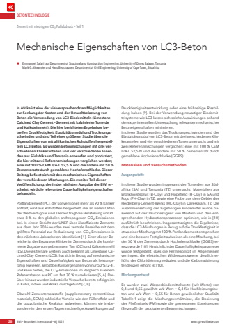 BETONTECHNOLOGIE28 BWI %u2013 BetonWerk International %u2013 6 | 2025 www.cpi-worldwide.comIn Afrika ist eine der vielversprechendsten M%u00f6glichkeiten zur Senkung der Kosten und der Umweltbelastung von Beton die Verwendung von LC3-Bindemitteln (Limestone Calcined Clay Cement %u2013 Zement mit kalzinierter Tonerde und Kalksteinmehl). Die hier berichteten Ergebnisse betreffen Druckfestigkeit, Elastizit%u00e4tsmodul und Trocknungsschwinden und sind Teil einer gr%u00f6%u00dferen Studie %u00fcber die Eigenschaften von mit afrikanischen Rohstoffen hergestelltem LC3-Beton. Es wurden Betonmischungen mit drei verschiedenen Klinkeranteilen und vier verschiedenen Tonerden aus S%u00fcdafrika und Tansania entworfen und produziert, die hier mit zwei Referenzmischungen verglichen werden; eine mit 100 % CEM II/A-L 52,5 N und die andere mit 50 % Zementersatz durch gemahlene Hochofenschlacke. Dieser Beitrag befasst sich mit den mechanischen Eigenschaften der verschiedenen Mischungen. Ein zweiter Teil dieser Ver%u00f6ffentlichung, der in der n%u00e4chsten Ausgabe der BWI erscheint, wird die relevanten Dauerhaftigkeitseigenschaften behandeln.Portlandzement (PC), der konventionell mehr als 90 % Klinker enth%u00e4lt, wird aus Rohstoffen hergestellt, die an vielen Orten der Welt verf%u00fcgbar sind. Derzeit tr%u00e4gt die Herstellung von PC etwa 8 % zu den globalen anthropogenen CO2-Emissionen bei. In einem Bericht der UNEP %u00fcber %u00f6koeffiziente Zemente aus dem Jahr 2016 wurden zwei zentrale Bereiche mit dem gr%u00f6%u00dften Potenzial zur Reduzierung von CO2-Emissionen in den n%u00e4chsten Jahrzehnten identifiziert [1]. Einer dieser Bereiche ist der Ersatz von Klinker im Zement durch die kombinierte Zugabe von gebranntem Ton (CC) und Kalksteinmehl (LS). Dieses tern%u00e4re System, auch bekannt als Limestone Calcined Clay Cement (LC3), hat sich in Bezug auf mechanische Eigenschaften und Dauerhaftigkeit von Beton als leistungsf%u00e4hig erwiesen, selbst bei Klinkergehalten von nur 50 % [2-4],und kann helfen, die CO2-Emissionen im Vergleich zu einem Referenzbeton aus PC um fast 30 % zu reduzieren [5, 6]. Dar%u00fcber hinaus wurden industrielle Versuche bereits erfolgreich in Kuba, Indien und Afrika durchgef%u00fchrt [7, 8].Obwohl Zementersatzstoffe (supplementary cementitious materials, SCMs) zahlreiche Vorteile wie den F%u00fcllereffekt und die pozzolanische Reaktion aufweisen, k%u00f6nnen sie insbesondere in den ersten Tagen nachteilige Auswirkungen auf Druckfestigkeitsentwicklung oder eine fr%u00fchzeitige Rissbildung haben [9]. Bei der Verwendung neuartiger Bindemittelsysteme wie LC3 lassen sich solche Auswirkungen anhand der experimentellen Untersuchung relevanter mechanischer Betoneigenschaften minimieren. In dieser Studie wurden das Trocknungsschwinden und der Elastizit%u00e4tsmodul von LC3-Beton mit drei verschiedenen Klinkeranteilen und vier verschiedenen Tonen untersucht und mit zwei Referenzmischungen verglichen; eine mit 100 % CEMII/A-L 52,5 N und die andere mit 50 % Zementersatz durch gemahlene Hochofenschlacke (GGBS).Materialien und VersuchsmethodenAusgangsstoffeIn dieser Studie wurden insgesamt vier Tonerden aus S%u00fcdafrika (SA) und Tansania (TZ) untersucht: Materialien aus Bronkhorstspruit (B-Clay) und Hopefield (H-Clay) in SA und Pugu (PH-Clay) in TZ, sowie eine Probe aus dem Gebiet des Heidelberg-Cement-Werks (HC-Clay) in Daressalam, TZ. Die Zusammensetzung der zugeh%u00f6rigen Bindemittel wurde basierend auf der Druckfestigkeit von M%u00f6rteln und den entsprechenden Hydratationsprozessen optimiert, wie in [10] ausf%u00fchrlich beschrieben. Insgesamt zeigten die Ergebnisse, dass die LC3-Mischungen in Bezug auf die Druckfestigkeit in etwa einer Mischung mit 100 % Portlandzement entsprechen und eine bessere Festigkeit aufweisen als eine Mischung, bei der 50 % des Zements durch Hochofenschlacke (GGBS) ersetzt wurde [10]. Hinsichtlich der Dauerhaftigkeitsparameter wurde festgestellt, dass die Permeabilit%u00e4t im Allgemeinen verringert, die elektrischen Widerstandswerte deutlich erh%u00f6ht, der Chlorideintrag reduziert und die Karbonatisierung tendenziell erh%u00f6ht ist [10].MischungsentwurfEs wurden zwei Wasserbindemittelwerte (w/z-Werte) von 0,4 und 0,55 gew%u00e4hlt: w/z-Wert = 0,4 f%u00fcr Hochleistungsbeton und w/z-Wert = 0,55 f%u00fcr Beton gew%u00f6hnlicher Qualit%u00e4t. Tabelle 1 zeigt die Mischungsverh%u00e4ltnisse, die Dosierung des Flie%u00dfmittels (FM) sowie die gemessenen Konsistenzen (Setzma%u00df) der produzierten Betonmischungen.Mechanische Eigenschaften von LC3-BetonZement mit niedrigem CO2-Fu%u00dfabdruck %u2013 Teil 1n Emmanuel Safari Leo, Department of Structural and Construction Engineering, University of Dar es Salaam, TansaniaMark G. Alexander und Hans Beushausen, Department of Civil Engineering, University of Cape Town, S%u00fcdafrika
