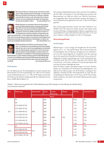 BETONTECHNOLOGIEwww.cpi-worldwide.com BWI %u2013 BetonWerk International %u2013 6 | 2025 29Pr%u00fcfmethodenF%u00fcr die Messung der Druckfestigkeiten wurden jeweils drei Betonw%u00fcrfel mit einer Kantenl%u00e4nge von 100 mm bei Aush%u00e4rtung im Wasserbad nach 1, 3, 7, 28 und 90 Tagen verwendet. Die Pr%u00fcfung der W%u00fcrfel erfolgte gem%u00e4%u00df der s%u00fcdafrikanischen Norm SANS 5863 (2006) [11].Der statische Elastizit%u00e4tsmodul wurde nach den Grunds%u00e4tzen der BS 1881 [12] bestimmt. F%u00fcr jede Mischung wurden drei Betonzylinder mit 200 mm H%u00f6he und 100 mm Durchmesser hergestellt. Nach dem Herstellen wurden alle Proben in einem Wasserbad ausgeh%u00e4rtet und nach 7, 28 und 90 Tagen gepr%u00fcft.Das Trocknungsschwinden wurde nach dem Verfahren von ASTM C157 [13] untersucht. Dabei wurden die Proben stets zun%u00e4chst 28 Tage in kalkges%u00e4ttigtem Wasser ausgeh%u00e4rtet und anschlie%u00dfend in einem klimatisierten Raum bei 23 %u00b1 2 %u00b0C undeiner relativen Luftfeuchtigkeit von 50 %u00b1 4 % gelagert.Versuchsergebnisse DruckfestigkeitAbbildungen 1 und 2 zeigen die Ergebnisse der Druckfestigkeit nach 1, 3, 7, 28 und 90 Tagen. Wie erwartet h%u00e4ngt die Druckfestigkeit der LC3-Betone weitgehend vom Klinkeranteil und dem Kaolinitgehalt ab. Zus%u00e4tzlich wird die Leistung durch die spezifische Oberfl%u00e4che (SSA) des Tons und den Alkaligehalt im System beeinflusst, wie in [14] ausf%u00fchrlicher beschrieben wird. Der PH-Ton (PH-Clay) wies eine h%u00f6here SSA auf als die B- und H-Tone, w%u00e4hrend H-Clay die geringste SSA und den h%u00f6chsten Alkaligehalt hatte.Nach 90 Tagen zeigten alle Mischungen mit einem Klinkergehalt von mindestens 55 % %u00e4hnliche Druckfestigkeiten auf, w%u00e4hrend bei Mischungen mit 45 % Klinker niedrigere Festigkeiten ermittelt wurden. Bemerkenswert ist, dass die leistungsf%u00e4higeren Mischungen mit B-Clay und PH-Clay Festigkeiten aufwiesen, die denen der beiden Referenzmischungen entsprachen. n Emmanuel Safari Leo ist Dozent an der Universit%u00e4t von Daressalam, College of Engineering and Technology. Er erwarb seinen MSc (Eng.) und PhD an der University of Cape Town, S%u00fcdafrika, und seinen BSc (Civil Eng.) an der University of Dar es Salaam, Tansania. Seine Forschungsinteressen gelten der Anwendung von Zementersatzstoffen in Beton. leo.emanuel@udsm.ac.tz n Mark Alexander ist emeritierter Professor f%u00fcr Bauingenieurwesen und Senior Research Scholar an der University of Cape Town (UCT). Er hat an der University of the Witwatersrand, Johannesburg, promoviert und ist Ehrenmitglied verschiedener Institutionen, einschl. UCT, RILEM, South African Institution of Civil Engineering, South African Academy of Engineering und Indian Concrete Institute. Er ist ein registrierter Professional Engineer in S%u00fcdafrika. Seine Forschungsinteressen liegen in den Bereichen Dauerhaftigkeit und Lebensdauervorhersage von Betonbauwerken, Nachhaltigkeit von Beton und Sanierung besch%u00e4digter Betonkonstruktionen. mark.alexander@uct.ac.zan Hans Beushausen ist Professor an der University of Cape Town. Er ist Direktor der Concrete Materials & Structural Integrity Research Unit, die sich auf die Leistungsf%u00e4higkeit und Instandsetzung von Betonbauwerken spezialisiert. Zu seinen Forschungsgebieten geh%u00f6ren die Dauerhaftigkeit von Beton, Betone mit verringertem CO2-Fu%u00dfabdruck und Instandsetzungssysteme f%u00fcr Betonbauwerke. Zu seinen weiteren Interessen geh%u00f6rt die Betonfertigteiltechnik und er ist ein Redakteur der Fachzeitschrift Betonwerk International, BWI. Er ist in zahlreichen internationalen Gremien aktiv und derzeit Vizepr%u00e4sident von RILEM. hans.beushausen@uct.ac.zaTabelle 1: Betonmischungsentw%u00fcrfe, Flie%u00dfmitteldosierung (FM, bezogen auf die Menge des Bindemittels) und erhaltenes Setzma%u00dfw/z Mischung Bindemittel Sand Grobe K%u00f6rnungWasser FM (%) Setzma%u00df (mm)kg/m%u00b30,4R14008661000 1600,60 80R2 863 0,55 120LC3-65(B:25/10) 852 1,15 110LC3-55(B:35/10) 847 1,20 100LC3-45(B:40/15) 842 1,25 95LC3-65(H:25/10) 852 1,10 120LC3-55(H:35/10) 846 1,20 105LC3-45(H:40/15) 842 1,25 110LC3-55(PH:35/10) 849 1,50 900,55R1291964 0,80 115LC3-55(B:35/10) 950 1,20 90LC3-55(H:35/10) 949 1,15 95LC3-55(HC:35/10) 954 2,00 45