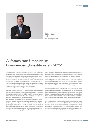 www.cpi-worldwide.com BWI %u2013 BetonWerk International %u2013 6 | 2025 3EDITORIALDas Jahr 2025 hat viele Ver%u00e4nderungen mit sich gebracht, und wie immer bei Ver%u00e4nderungen kommt es darauf an, wie man damit umgeht. Gerade bei Ver%u00e4nderungen in der Belegschaft m%u00fcssen wir stets im Hinterkopf haben, dass es unser Ziel sein muss, ein Team so zu formen, das es vollumf%u00e4nglich f%u00fcreinander da ist. Wo zwar jeder seinen eigenen Bereich abdeckt, aber dennoch auch jeder %u00fcber den Tellerrand gucken kann und darf und soll, um dann auch dort %u00c4nderungen und Verbesserungen vorzuschlagen und anzusto%u00dfen.Bei einer Reise k%u00fcrzlich traf ich einen Kunden, der mir nebenbei berichtete, dass die Personalplanung f%u00fcr 2028 (!) bei ihm jetzt abgeschlossen sei. Ich habe es nicht ausgesprochen, aber innerlich doch sehr den Hut gezogen und mir gew%u00fcnscht, dass ich auch schon so weit w%u00e4re. Um so weit in die Zukunft sehen zu k%u00f6nnen, bedarf es gr%u00fcndlichster Planung und Vorbereitung, und zwar ohne auf Ver%u00e4nderungen von au%u00dfen zu warten. Die deutsche Bundesregierung hat inzwischen (%u2026) wohl ebenfalls erkannt, dass es Ver%u00e4nderungen geben muss, damit solch eine Planungssicherheit, die die Grundlage ist f%u00fcr Zuversicht und aktives Unternehmertum, wieder gegeben ist. So soll in Deutschland in 2026 insbesondere investiert werden in Bildung, Infrastruktur, Digitalisierung und Sicherheit. Sch%u00f6ne Begriffe; alles richtig, aber wer darauf wartet, bis er handelt, der kommt zu sp%u00e4t.Viele Fertigteilwerke haben mir bereits auf der bauma erz%u00e4hlt, dass sie bereit sind, zu investieren, aber es fehlt ihnen an den Zukunftsperspektiven, und aus meiner Sicht dauert das Warten auf bessere Zeiten einfach schon viel zu lange. Wenn Ver%u00e4nderungen erforderlich sind, dann muss man aber im Kleinen anfangen, und dies sobald als m%u00f6glich. Das kann zu schwierigen Entscheidungen f%u00fchren, aber man muss immer vor Augen haben, was ich eingangs geschrieben habe. Wer im Gro%u00dfen oder auch im Kleinen ein Team hat, auf das er sich verlassen kann, der ist auf einem guten Weg. Ich w%u00fcnsche allen Unternehmern in diesem Sinne viel Kraft f%u00fcr eine Zeit, in der man sein Schicksal selbst in die Hand nehmen muss. Wenn dann tats%u00e4chlich noch positive %u00e4u%u00dfere Einfl%u00fcsse im Investitionsjahr 2026 dazukommen werden, bin ich zuversichtlich, dass Ende 2026 von besseren Zahlen gesprochen werden kann, als dies heute der Fall ist.Aufbruch zum Umbruch im kommenden %u201eInvestitionsjahr 2026%u201cDr.-Ing. Holger Karutz