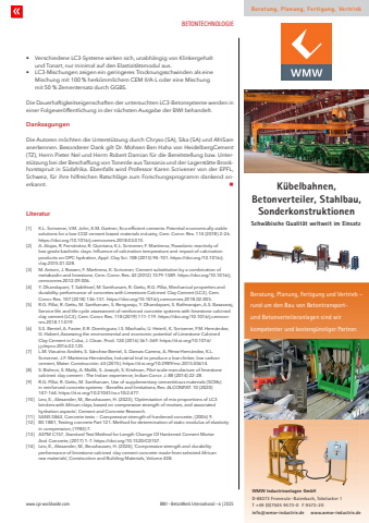 BETONTECHNOLOGIEwww.cpi-worldwide.com BWI %u2013 BetonWerk International %u2013 6 | 2025%u2022 Verschiedene LC3-Systeme wirken sich, unabh%u00e4ngig von Klinkergehalt und Tonart, nur minimal auf den Elastizit%u00e4tsmodul aus.%u2022 LC3-Mischungen zeigen ein geringeres Trocknungsschwinden als eine Mischung mit 100 % herk%u00f6mmlichem CEM II/A-L oder eine Mischung mit 50 % Zementersatz durch GGBS.Die Dauerhaftigkeitseigenschaften der untersuchten LC3-Betonsysteme werden in einer Folgever%u00f6ffentlichung in der n%u00e4chsten Ausgabe der BWI behandelt.Danksagungen Die Autoren m%u00f6chten die Unterst%u00fctzung durch Chryso (SA), Sika (SA) und AfriSam anerkennen. Besonderer Dank gilt Dr. Mohsen Ben Haha von HeidelbergCement (TZ), Herrn Pieter Nel und Herrn Robert Damian f%u00fcr die Bereitstellung bzw. Unterst%u00fctzung bei der Beschaffung von Tonerde aus Tansania und der Lagerst%u00e4tte Bronkhorstspruit in S%u00fcdafrika. Ebenfalls wird Professor Karen Scrivener von der EPFL, Schweiz, f%u00fcr ihre hilfreichen Ratschl%u00e4ge zum Forschungsprogramm dankend anerkannt. nLiteratur[1] K.L. Scrivener, V.M. John, E.M. Gartner, Eco-efficient cements: Potential economically viable solutions for a low-CO2 cement-based materials industry, Cem. Concr. Res. 114 (2018) 2%u201326. https://doi.org/10.1016/j.cemconres.2018.03.015.[2] A. Alujas, R. Fern%u00e1ndez, R. Quintana, K.L. Scrivener, F. Martirena, Pozzolanic reactivity of low grade kaolinitic clays: Influence of calcination temperature and impact of calcination products on OPC hydration, Appl. Clay Sci. 108 (2015) 94%u2013101. https://doi.org/10.1016/j.clay.2015.01.028.[3] M. Antoni, J. Rossen, F. Martirena, K. Scrivener, Cement substitution by a combination of metakaolin and limestone, Cem. Concr. Res. 42 (2012) 1579%u20131589. https://doi.org/10.1016/j.cemconres.2012.09.006.[4] Y. Dhandapani, T. Sakthivel, M. Santhanam, R. Gettu, R.G. Pillai, Mechanical properties and durability performance of concretes with Limestone Calcined Clay Cement (LC3), Cem. Concr. Res. 107 (2018) 136%u2013151. https://doi.org/10.1016/j.cemconres.2018.02.005.[5] R.G. Pillai, R. Gettu, M. Santhanam, S. Rengaraju, Y. Dhandapani, S. Rathnarajan, A.S. Basavaraj, Service life and life cycle assessment of reinforced concrete systems with limestone calcined clay cement (LC3), Cem. Concr. Res. 118 (2019) 111%u2013119. https://doi.org/10.1016/j.cemconres.2018.11.019.[6] S.S. Berriel, A. Favier, E.R. Dom%u00ednguez, I.S. Machado, U. Heierli, K. Scrivener, F.M. Hern%u00e1ndez, G. Habert, Assessing the environmental and economic potential of Limestone Calcined Clay Cement in Cuba, J. Clean. Prod. 124 (2016) 361%u2013369. https://doi.org/10.1016/j.jclepro.2016.02.125.[7] L.M. Vizca%u00edno-Andr%u00e9s, S. S%u00e1nchez-Berriel, S. Damas-Carrera, A. P%u00e9rez-Hern%u00e1ndez, K.L. Scrivener, J.F. Martirena-Hern%u00e1ndez, Industrial trial to produce a low clinker, low carbon cement, Mater. Construcci%u00f3n. 65 (2015). https://doi.org/10.3989/mc.2015.00614.[8] S. Bishnoi, S. Maity, A. Mallik, S. Joseph, S. Krishnan, Pilot scale manufacture of limestone calcined clay cement : The Indian experience, Indian Concr. J. 88 (2014) 22%u201328.[9] R.G. Pillai, R. Gettu, M. Santhanam, Use of supplementary cementitious materials (SCMs) in reinforced concrete systems %u2013 Benefits and limitations, Rev. ALCONPAT. 10 (2020) 147%u2013164. https://doi.org/10.21041/ra.v10i2.477.[10] Leo, E., Alexander, M., Beushausen, H. (2023), %u2018Optimisation of mix proportions of LC3 binders with African clays, based on compressive strength of mortars, and associated hydration aspects%u2019, Cement and Concrete Research.[11] SANS 5863, Concrete tests %u2014 Compressive strength of hardened concrete, (2006) 9.[12] BS 1881, Testing concrete Part 121. Method for determination of static modulus of elasticity in compression, (1983) 7.[13] ASTM C157, Standard Test Method for Length Change Of Hardened Cement Mortar And Concrete, (2017) 1%u20137. https://doi.org/10.1520/C0157.[14] Leo, E., Alexander, M., Beushausen, H. (2024), %u2018Compressive strength and durability performance of limestone calcined clay cement concrete made from selected African raw materials%u2019, Construction and Building Materials, Volume 438.Beratung, Planung, Fertigung und Vertrieb %u2013rund um den Bau von Betontransportund Betonverteileranlagen sind wirkompetenter und kosteng%u00fcnstiger Partner.Schw%u00e4bische Qualit%u00e4t weltweit im EinsatzWMW Industrieanlagen GmbHD-88273 Fronreute-Baienbach, Tobelacker 1T +49 (0)7505 9573-0 F 9573-20info@wmw-industrie.de www.wmw-industrie.deK%u00fcbelbahnen,Betonverteiler, Stahlbau,SonderkonstruktionenBeratung, Planung, Fertigung, VertriebCMYCMMYCYCMYK