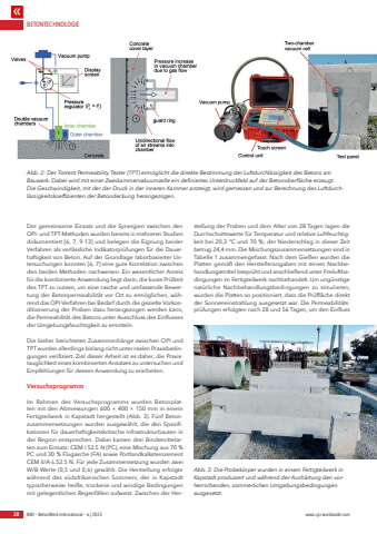 BETONTECHNOLOGIE38 BWI %u2013 BetonWerk International %u2013 6 | 2025 www.cpi-worldwide.comDer gemeinsame Einsatz und die Synergien zwischen den OPI- und TPT-Methoden wurden bereits in mehreren Studien dokumentiert [6, 7, 9-13] und belegen die Eignung beider Verfahren als verl%u00e4ssliche Indikatorpr%u00fcfungen f%u00fcr die Dauerhaftigkeit von Beton. Auf der Grundlage laborbasierter Untersuchungen konnten [6, 7] eine gute Korrelation zwischen den beiden Methoden nachweisen. Ein wesentlicher Anreiz f%u00fcr die kombinierte Anwendung liegt darin, die kurze Pr%u00fcfzeit des TPT zu nutzen, um eine rasche und umfassende Bewertung der Betonpermeabilit%u00e4t vor Ort zu erm%u00f6glichen, w%u00e4hrend das OPI-Verfahren bei Bedarf durch die gezielte Vorkonditionierung der Proben dazu herangezogen werden kann, die Permeabilit%u00e4t des Betons unter Ausschluss des Einflusses der Umgebungsfeuchtigkeit zu ermitteln.Die bisher berichteten Zusammenh%u00e4nge zwischen OPI und TPT wurden allerdings bislang nicht unter realen Praxisbedingungen verifiziert. Ziel dieser Arbeit ist es daher, die Praxistauglichkeit eines kombinierten Ansatzes zu untersuchen und Empfehlungen f%u00fcr dessen Anwendung zu erarbeiten.VersuchsprogrammIm Rahmen des Versuchsprogramms wurden Betonplatten mit den Abmessungen 600 %u00d7 400 %u00d7 150 mm in einem Fertigteilwerk in Kapstadt hergestellt (Abb. 3). F%u00fcnf Betonzusammensetzungen wurden ausgew%u00e4hlt, die den Spezifikationen f%u00fcr dauerhaftigkeitskritische Infrastrukturbauten in der Region entsprechen. Dabei kamen drei Bindemittelarten zum Einsatz: CEM I 52.5 N (PC), eine Mischung aus 70 % PC und 30 % Flugasche (FA) sowie Portlandkalksteinzement CEM II/A-L 52.5 N. F%u00fcr jede Zusammensetzung wurden zwei W/B-Werte (0,5 und 0,6) gew%u00e4hlt. Die Herstellung erfolgte w%u00e4hrend des s%u00fcdafrikanischen Sommers, der in Kapstadt typischerweise hei%u00dfe, trockene und windige Bedingungen mit gelegentlichen Regenf%u00e4llen aufweist. Zwischen der Herstellung der Proben und dem Alter von 28 Tagen lagen die Durchschnittswerte f%u00fcr Temperatur und relative Luftfeuchtigkeit bei 20,3 %u00b0C und 70 %; der Niederschlag in dieser Zeit betrug 24,4 mm. Die Mischungszusammensetzungen sind in Tabelle 1 zusammengefasst. Nach dem Gie%u00dfen wurden die Platten gem%u00e4%u00df den Herstellerangaben mit einem Nachbehandlungsmittel bespr%u00fcht und anschlie%u00dfend unter Freiluftbedingungen im Fertigteilwerk nachbehandelt. Um ung%u00fcnstige nat%u00fcrliche Nachbehandlungsbedingungen zu simulieren, wurden die Platten so positioniert, dass die Pr%u00fcffl%u00e4che direkt der Sonneneinstrahlung ausgesetzt war. Die Permeabilit%u00e4tspr%u00fcfungen erfolgten nach 28 und 56 Tagen, um den Einfluss Abb. 2: Der Torrent Permeability Tester (TPT) erm%u00f6glicht die direkte Bestimmung der Luftdurchl%u00e4ssigkeit des Betons am Bauwerk. Dabei wird mit einer Zweikammervakuumzelle ein definiertes Unterdruckfeld auf der Betonoberfl%u00e4che erzeugt. Die Geschwindigkeit, mit der der Druck in der inneren Kammer ansteigt, wird gemessen und zur Berechnung des Luftdurchl%u00e4ssigkeitskoeffizienten der Betondeckung herangezogen.Abb. 3: Die Probek%u00f6rper wurden in einem Fertigteilwerk in Kapstadt produziert und w%u00e4hrend der Aush%u00e4rtung den vorherrschenden, sommerlichen Umgebungsbedingungen ausgesetzt.