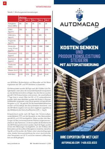 BETONTECHNOLOGIEwww.cpi-worldwide.com BWI %u2013 BetonWerk International %u2013 6 | 2025von W/B-Wert, Bindemittelart und Betonalter auf die Messergebnisse der OPI- und TPT-Verfahren zu bewerten.Die Betonplatten wurden 28 Tage nach dem Gie%u00dfen vom Fertigteilwerk in das Labor der Universit%u00e4t Kapstadt transportiert, wo die Bohrkernentnahme erfolgte. Aus den Kernen wurden gem%u00e4%u00df [14] Probescheiben entnommen, die anschlie%u00dfend 7 Tage lang in einem Ofen bei 50 %u00b1 2 %u00b0C vorkonditioniert wurden. Nach dem Abk%u00fchlen wurden die Proben in Permeabilit%u00e4tszellen eingesetzt, unter Druck gesetzt und gem%u00e4%u00df den Vorgaben in [13, 14] gepr%u00fcft. Die Permeabilit%u00e4tskoeffizienten wurden auf Grundlage des Darcy-Gesetzes berechnet, und die OPI-Werte ergaben sich aus dem negativen Logarithmus des Mittelwerts der Darcy-Koeffizienten (OPI = %u2212log K).Entsprechend wurde nach 28 Tagen der Torrent-Luftpermeabilit%u00e4tstest (TPT) auf der Baustelle an den Betonplatten gem%u00e4%u00df [5] und [15] durchgef%u00fchrt. Dabei wurden drei Messungen auf den sonnenexponierten Fl%u00e4chen vorgenommen %u2013 jeweils an den Positionen, an denen sp%u00e4ter die Bohrkerne f%u00fcr die OPI-Pr%u00fcfung entnommen wurden. Nach 56 Tagen wurden erneut drei Messungen durchgef%u00fchrt, um den Einfluss des Betonalters auf die Luftdurchl%u00e4ssigkeit zu bewerten. Zwischen Tag 28 und 56 wurden die Platten unter Laborbedingungen ohne direkte Sonneneinstrahlung bei einer durchschnittlichen Temperatur von 22 %u00b0C und einer relativen Luftfeuchtigkeit von 60 % gelagert.Tabelle 1: MischungszusammensetzungenMischungMix 1 Mix 2 Mix 3 Mix 4 Mix 5Festigkeitsklasse (MPa)40 40 30 30 30CEM I (kg/m%u00b3)355 0 285 0 210CEM II/A-L (kg/m%u00b3)0 355 0 285 0Flugasche (kg/m%u00b3)0 0 0 0 90Grobe K%u00f6rnung, 19 mm (kg/m%u00b3)1100 1100 1080 1080 1080D%u00fcnensand (kg/m%u00b3)515 515 570 570 615Brechsand (kg/m%u00b3)220 220 245 245 215Flie%u00dfmittel (%-B.)0,60 0,60 0,65 0,65 0,60Wasser (l/m%u00b3) 175 175 175 175 175W/B-Wert 0,50 0,50 0,60 0,60 0,60IHRE EXPERTEN F%u00dcR WET CAST AUTOMACAD.COM 1 450.632.6323KOSTEN SENKENUNDPRODUKTIONSLEISTUNG STEIGERNMIT AUTOMATISIERUNG