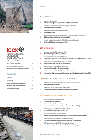 BWI %u2013 BetonWerk International %u2013 6 | 2025INHALTNACHRICHTENRessourcen clever genutzt14 Abbruch, Recycling und CO2-reduzierte Baustoffe aus einer HandVom T%u00fcftler zu einem f%u00fchrenden Hersteller f%u00fcr Spannbetontechnik18 100 Jahre Paul MaschinenfabrikInternational Prestressed Hollowcore Association21 Neuer IPHA-Pr%u00e4sidentFachvereinigung Deutscher Betonfertigteilbau e.V. (FDB), 53179 Bonn, Deutschland22 FDB startet ihre neue Wissensreihe Nachhaltigkeitwbr Rohr- und Bauelemente GmbH, 75248 %u00d6lbronn-D%u00fcrrn, Deutschland24 Ein Vierteljahrhundert Innovation und ErfolgBETONTECHNIKZement mit niedrigem CO2-Fu%u00dfabdruck %u2013 Teil 128 Mechanische Eigenschaften von LC3-BetonDauerhaftigkeitspr%u00fcfung von Betonfertigteilen36 Kombinierter Einsatz verschiedener Permeabilit%u00e4tstests zur Qualit%u00e4tskontrolle von BetonKraft Curing Systems GmbH, 49699 Lindern, Deutschland 44 Pr%u00e4diktive Reife %u2013 Eine neue %u00c4ra der Betonh%u00e4rtungMapei GmbH, 63762 Gro%u00dfostheim, Deutschland49 Neue Dienstleistung: EPD f%u00fcr BetonmischungenTeka Maschinenbau GmbH, 67480 Edenkoben, Deutschland 52 Umfangreiche Modernisierung der Mischanlage von Heidelberg Materials in AhrensfeldeInstalliertes Drucksystem auf der Digitalen Baustelle der TU Braunschweig60 Multifunktionaler Bauroboter Progress 3D Concrete Printing, 39042 Brixen, Italien62 3D-Betondruck bietet ganz neue M%u00f6glichkeiten im FertigteilbauBETONWAREN / BETONWERKSTEINPeri SE, 89264 Wei%u00dfenhorn, Deutschland 66 Unterlagsplatte im FaktencheckOnline-Anmeldung f%u00fcr Besucher ab sofort m%u00f6glich70%u0009 13. Internationale Konferenz zum Thema Betonsteinpflaster (ICCBP)Polblat Kopyt Sp. J., 26-640 Skaryszew, Mak%u00f3w, Polen74 %u00dcber 100.000 Unterlagsplatten in einem JahrCDS Curing, Staffordshire, ST3 5JU, England78 Moderne Nachbehandlungstechnologien f%u00fcr dauerhaften und nachhaltigen BetonHess Group GmbH, 57299 Burbach-Wahlbach, Deutschland82 Von Familienwurzeln zu Zukunftsvisionen: Micheletto PavimentazioniC&G Pigment Europe GmbH, 51377 Leverkusen, Deutschland88 Neues Sortiment granulierter Pigmente f%u00fcr die Betoneinf%u00e4rbung4414ICCX Central Europe 2026 8ICCX T%u00fcrkiye 2026 %u2013 Premierenveranstaltung mit spannenden Keynotes 12RUBRIKENEditorial 3Impressum 6Internationale Veranstaltungen f%u00fcr die Beton- und Fertigteilindustrie 23Inserentenverzeichnis 165INTERNATIONAL CONCRETECONFERENCE & EXHIBITION
