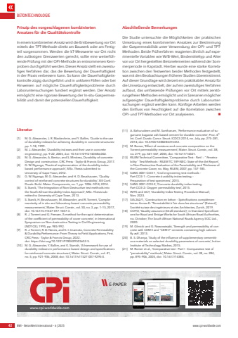BETONTECHNOLOGIE42 BWI %u2013 BetonWerk International %u2013 6 | 2025 www.cpi-worldwide.comPrinzip des vorgeschlagenen kombinierten Ansatzes f%u00fcr die Qualit%u00e4tskontrolleIn einem kombinierten Ansatz wird die Erstbewertung vor Ort mittels der TPT-Methode direkt am Bauwerk oder am Fertigteil vorgenommen. Werden die kT-Messwerte vor Ort nicht den zul%u00e4ssigen Grenzwerten gerecht, sollte eine weiterf%u00fchrende Pr%u00fcfung mit der OPI-Methode an entnommenen Kernproben durchgef%u00fchrt werden. Dieser Ansatz stellt ein zweistufiges Verfahren dar, das die Bewertung der Dauerhaftigkeit in der Praxis verbessern kann. So kann die Dauerhaftigkeitskontrolle z%u00fcgig durchgef%u00fchrt und in unklaren F%u00e4llen oder bei Hinweisen auf m%u00f6gliche Dauerhaftigkeitsprobleme durch Laboruntersuchungen fundiert erg%u00e4nzt werden. Der Ansatz erm%u00f6glicht eine rigorose Bewertung der In-situ-Gaspermeabilit%u00e4t und damit der potenziellen Dauerhaftigkeit.Abschlie%u00dfende BemerkungenDie Studie untersuchte die M%u00f6glichkeiten der praktischen Umsetzung eines kombinierten Ansatzes zur Bestimmung der Gaspermeabilit%u00e4t unter Verwendung der OPI- und TPTMethoden. Beide Pr%u00fcfverfahren reagierten %u00e4hnlich auf experimentelle Variablen wie W/B-Wert, Bindemitteltyp und Alter von vor Ort hergestellten Betonelementen w%u00e4hrend der Sommerperiode in Kapstadt. Hierbei wurde eine starke Korrelation zwischen den Testwerten beider Methoden festgestellt, was mit den Beobachtungen fr%u00fcherer Studien %u00fcbereinstimmt. Auf dieser Grundlage wird derzeit ein praktikabler Ansatz f%u00fcr die Umsetzung entwickelt, der auf ein zweistufiges Verfahren aufbaut, das umfassende Pr%u00fcfungen vor Ort mittels zerst%u00f6rungsfreier Methoden erm%u00f6glicht und in Szenarien m%u00f6glicher aufgezeigter Dauerhaftigkeitsprobleme durch Laboruntersuchungen erg%u00e4nzt werden kann. K%u00fcnftige Arbeiten werden den Einfluss von Feuchtigkeit auf die Korrelation zwischen OPI- und TPT-Methoden vor Ort analysieren. nLiteratur[1] M. G. Alexander, J. R. Mackechnie, and Y. Ballim, %u2018Guide to the use of durability indexes for achieving durability in concrete structures%u2019. pp. 1%u201318, 1999.[2] M. J. Alexander, %u2018Durability indexes and their use in concrete engineering%u2019, pp. 9%u201322, 2005, doi: 10.1617/2912143586.002.[3] M. G. Alexander, A. Bentur, and S. Mindess, Durability of concrete: Design and construction. CRC Press - Taylor & Francis Group, 2017.[4] G. W. Nganga, %u2018Practical implemenation of the durability indexbased performance approach%u2019, MSc. Thesis submitted to University of Cape Town, 2012.[5] G. W. Nganga, M. G. Alexander, and H. D. Beushausen, %u2018Quality control of reinforced concrete structures for durability%u2019, XIII Conf. Durab. Build. Mater. Components, no. 1, pp. 1006%u20131014, 2014.[6] S. Starck, %u2018The Integration of Non-Destructive test methods into the South African Durability Index Approach%u2019, MSc. Thesis submitted to University of Cape Town, 2013.[7] S. Starck, H. Beushausen, M. Alexander, and R. Torrent, %u2018Complementarity of in situ and laboratory-based concrete permeability measurements%u2019, Mater. Struct. Constr., vol. 50, no. 3, pp. 1%u201315, 2017, doi: 10.1617/s11527-017-1037-3.[8] R. J. Torrent and G. Frenzer, %u2018A method for the rapid determination of the coefficient of permeability of cover concrete%u2019, in International Symposium on Non-destructive Testing in Civil Engineering (NDT-CE), 1995, pp. 985%u2013992.[9] R. J. Torrent, R. D. Neves, and K.-I. Imamoto, Concrete Permeability & Durability Performance: From Theory to Field Applications, First. CRC Press - Taylor & Francis Group, 2022. doi: https://doi.org/10.1201/9780429505652-5.[10] M. G. Alexander, Y. Ballim, and K. Stanish, %u2018A framework for use of durability indexes in performance-based design and specifications for reinforced concrete structures%u2019, Mater. Struct. Constr., vol. 41, no. 5, pp. 921%u2013936, 2008, doi: 10.1617/s11527-007-9295-0.[11] A. Bahurudeen and M. Santhanam, %u2018Performance evaluation of sugarcane bagasse ash-based cement for durable concrete%u2019, Proc. 4thInt. Conf. Durab. Concr. Struct. ICDCS 2014, no. July, pp. 275%u2013281, 2014, doi: 10.5703/1288284315412.[12] M. Romer, %u2018Effect of moisture and concrete composition on the Torrent permeability measurement%u2019, Mater. Struct. Constr., vol. 38, no. 279, pp. 541%u2013547, 2005, doi: 10.1617/14321.[13] RILEM Technical Committee, %u2018Comparative Test - Part I : \bility \in Non-Destructive Evaluation of the Penetrability and Thickness of the Concrete Cover, no. May, RILEM, 2007, pp. 157%u2013185.[14] SANS 3001-CO3-1, %u2018Civil engineering test methods %u2013 Part CO3-1 : Concrete durability index testing %u2013Preparation of test specimens%u2019, 2015.[15] SANS 3001-CO3-2, %u2018Concrete durability index testing. Part CO3-2: Oxygen permeability test%u2019, 2015.[16] WITS and UCT, %u2018Durability Index Testing Procedure Manual%u2019, Nov. 2023.[17] SIA 262/1, %u2018Construction en b%u00e9ton %u2013 Sp%u00e9cifications compl%u00e9mentaires. Annex E: %u201cPerm%u00e9abilit%u00e9 %u00e0 l%u2019air dans les structures%u201d (Extract)%u2019, Soci%u00e9t%u00e9 suisse des ing%u00e9nieurs et des Architectes, Zurich, 2019.[18] COTO, %u2018Quality assurance (Draft standard)%u2019, in Standard Specifications for Road and Bridge Works for South African Road Authorities, no. October, The South African National Roads Agency SOC Ltd., 2020.[19] M. Glinicki and G. Nowowiejski, %u2018Strength and permeability of concrete with CEM II and %u201cCEM V%u201d cements containing high calcium fly ash%u2019. 2013.[20] B. S. Dhanya, %u2018Study of the influence of supplementary cementitious materials on selected durability parameters of concrete%u2019, Indian Institute of Technology Madras, 2015.[21] M. Romer et al., %u2018Comparative test - Part I - Comparative test of %u201cpenetrability%u201d method