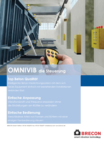 BRECON GmbH%u00b7 Telefon +49 221 9544270%u00b7 Fax +49 221 9544277%u00b7 info@brecon.de%u00b7 www.brecon.deOMNIVIB die SteuerungTop Beton Qualit%u00e4tIntelligentes Beton-Verdichtungssystem mit dem sichneues Equipment einfach mit bestehenden Installationen verbinden l%u00e4sstEinfache AnpassungVibrationskraft und Frequenz anpassen ohne die Einstellungen am R%u00fcttler zu ver%u00e4ndernEinfache BedienungVerschiedene Arten von Formen und R%u00fcttlern mit einereinzigen Fernbedienung steuern