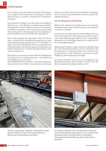 BETONTECHNOLOGIE46 BWI %u2013 BetonWerk International %u2013 6 | 2025 www.cpi-worldwide.comkeit zu erreichen, die das sichere Ausschalen oder Entspannen erm%u00f6glicht. Dies bedeutet den %u00dcbergang von reaktiver %u00dcberwachung zu proaktiver, datenbasierter Produktionssteuerung!Das Fundament von Match-Cure Ultra liegt in der pr%u00e4diktiven Reifemessung %u2013 einer Methode zur Bewertung des Hydratationsfortschritts im Beton. W%u00e4hrend der Zement hydratisiert, wird W%u00e4rme freigesetzt. Durch Temperaturmessung mittels Thermoelementen im Betonelement wird der Hydratationsgrad quantifiziert und in einen Reifeindex umgerechnet.Dieser Index spiegelt das %u201e%u00e4quivalente Alter%u201c des Betons wider %u2013 also die Zeit, die das Material ben%u00f6tigt h%u00e4tte, um unter Standardbedingungen (typischerweise 20 %u00b0C) dieselbe Festigkeit zu erreichen. Mit Hilfe des Arrhenius-Gesetzes ber%u00fccksichtigt das System die Beschleunigung der Hydratation bei h%u00f6heren Temperaturen und deren Verlangsamung bei niedrigeren Temperaturen.Das Ergebnis ist ein kontinuierliches Bild der Festigkeitsentwicklung im Inneren des Betonelements %u2013 ohne Zerst%u00f6rung eines Pr%u00fcfk%u00f6rpers in jeder Phase.Die pr%u00e4diktive Reife ist besonders in der fr%u00fchen Erh%u00e4rtungsphase wertvoll und erfordert eine bestimmte Ausr%u00fcstung: Sensoren zur Erfassung der Temperaturdaten, Speicherger%u00e4te zur Aufzeichnung und Software zur Berechnung der Festigkeitsentwicklung.Von der Messung zur VorhersageW%u00e4hrend die herk%u00f6mmliche Reifemessung den aktuellen Festigkeitszustand zeigt, hat Kraft Curing sie in ein Prognoseinstrument verwandelt.Zun%u00e4chst wird eine Kalibrierkurve erstellt: Pr%u00fcfw%u00fcrfel oder -zylinder einer bestimmten Betonmischung werden bei 20 %u00b0C unter Standardbedingungen geh%u00e4rtet und in regelm%u00e4%u00dfigen Abst%u00e4nden auf Druckfestigkeit gepr%u00fcft. Die Ergebnisse bilden ein Festigkeitszeitprofil.W%u00e4hrend der Produktion messen Sensoren im Betonelement die reale Temperaturentwicklung. Durch Umrechnung der H%u00e4rtungshistorie in %u00e4quivalente Alter kann das System die aktuelle Position auf der Kalibrierkurve bestimmen und die Festigkeit zu jedem Zeitpunkt vorhersagen.So m%u00fcssen Hersteller nicht mehr auf die Ergebnisse der Betonpr%u00fcfung warten, sondern wissen im Voraus, wann der Beton die gew%u00fcnschten Eigenschaften erreicht.Robuster, magnetischer, drahtloser Temperaturtransmitter (graues Geh%u00e4use) mit Typ-K-Thermoelementkabel zur Messung der Innentemperatur des BetonsEin drahtloser Repeater, der in der gesamten Anlage oder auf dem Werksgel%u00e4nde platziert wird, um eine ausreichende Signalst%u00e4rke auf einer gro%u00dfen Fl%u00e4che sicherzustellen. Thermoelementkabel zur Messung der Innentemperatur des Betons
