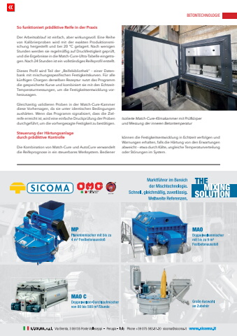 BETONTECHNOLOGIEwww.cpi-worldwide.com BWI %u2013 BetonWerk International %u2013 6 | 2025 47So funktioniert pr%u00e4diktive Reife in der PraxisDer Arbeitsablauf ist einfach, aber wirkungsvoll. Eine Reihe von Kalibrierproben wird mit der exakten Produktionsmischung hergestellt und bei 20 %u00b0C gelagert. Nach wenigen Stunden werden sie regelm%u00e4%u00dfig auf Druckfestigkeit gepr%u00fcft, und die Ergebnisse in die Match-Cure-Ultra-Tabelle eingetragen. Nach 24 Stunden ist ein vollst%u00e4ndiges Reifeprofil erstellt.Dieses Profil wird Teil der %u201eReifebibliothek%u201c %u2013 einer Datenbank mit mischungsspezifischen Festigkeitskurven. F%u00fcr alle k%u00fcnftigen Chargen derselben Rezeptur nutzt das Programm die gespeicherte Kurve und kombiniert sie mit den EchtzeitTemperaturmessungen, um die Festigkeitsentwicklung vorherzusagen.Gleichzeitig validieren Proben in der Match-Cure-Kammer diese Vorhersagen, da sie unter identischen Bedingungen aush%u00e4rten. Wenn das Programm signalisiert, dass die Zielreife erreicht ist, wird eine einfache Druckpr%u00fcfung der Proben durchgef%u00fchrt, um die vorhergesagte Festigkeit zu best%u00e4tigen.Steuerung der H%u00e4rtungsanlage durch pr%u00e4diktive KontrolleDie Kombination von Match-Cure und AutoCure verwandelt die Reifeprognose in ein steuerbares Werksystem. Bediener k%u00f6nnen die Festigkeitsentwicklung in Echtzeit verfolgen und Warnungen erhalten, falls die H%u00e4rtung von den Erwartungen abweicht %u2013 etwa durch K%u00e4lte, ungleiche Temperaturverteilung oder St%u00f6rungen im System.Isolierte Match-Cure-Klimakammer mit Pr%u00fcfk%u00f6rper und Messung der inneren Betontemperatur