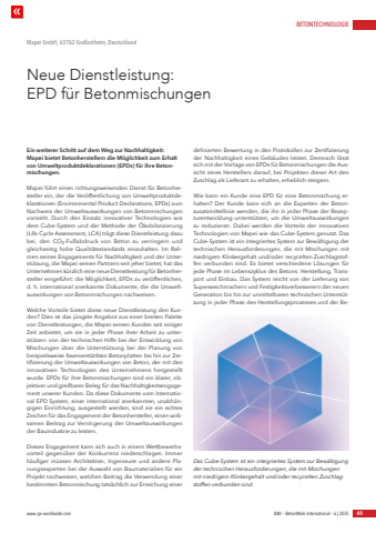 BETONTECHNOLOGIEwww.cpi-worldwide.com BWI %u2013 BetonWerk International %u2013 6 | 2025 49Ein weiterer Schritt auf dem Weg zur Nachhaltigkeit: Mapei bietet Betonherstellern die M%u00f6glichkeit zum Erhalt von Umweltproduktdeklarationen (EPDs) f%u00fcr ihre Betonmischungen.Mapei f%u00fchrt einen richtungsweisenden Dienst f%u00fcr Betonhersteller ein, der die Ver%u00f6ffentlichung von Umweltproduktdeklarationen (Environmental Product Declarations, EPDs) zum Nachweis der Umweltauswirkungen von Betonmischungen vorsieht. Durch den Einsatz innovativer Technologien wie dem Cube-System und der Methode der %u00d6kobilanzierung (Life Cycle Assessment, LCA) tr%u00e4gt diese Dienstleistung dazu bei, den CO2-Fu%u00dfabdruck von Beton zu verringern und gleichzeitig hohe Qualit%u00e4tsstandards einzuhalten. Im Rahmen seines Engagements f%u00fcr Nachhaltigkeit und der Unterst%u00fctzung, die Mapei seinen Partnern seit jeher bietet, hat das Unternehmen k%u00fcrzlich eine neue Dienstleistung f%u00fcr Betonhersteller eingef%u00fchrt: die M%u00f6glichkeit, EPDs zu ver%u00f6ffentlichen, d. h. international anerkannte Dokumente, die die Umweltauswirkungen von Betonmischungen nachweisen.Welche Vorteile bietet diese neue Dienstleistung den Kunden? Dies ist das j%u00fcngste Angebot aus einer breiten Palette von Dienstleistungen, die Mapei seinen Kunden seit einiger Zeit anbietet, um sie in jeder Phase ihrer Arbeit zu unterst%u00fctzen: von der technischen Hilfe bei der Entwicklung von Mischungen %u00fcber die Unterst%u00fctzung bei der Planung von beispielsweise faserverst%u00e4rkten Betonplatten bis hin zur Zertifizierung der Umweltauswirkungen von Beton, der mit den innovativen Technologien des Unternehmens hergestellt wurde. EPDs f%u00fcr ihre Betonmischungen sind ein klarer, objektiver und greifbarer Beleg f%u00fcr das Nachhaltigkeitsengagement unserer Kunden. Da diese Dokumente vom International EPD System, einer international anerkannten, unabh%u00e4ngigen Einrichtung, ausgestellt werden, sind sie ein echtes Zeichen f%u00fcr das Engagement der Betonhersteller, einen wirksamen Beitrag zur Verringerung der Umweltauswirkungen der Bauindustrie zu leisten.Dieses Engagement kann sich auch in einem Wettbewerbsvorteil gegen%u00fcber der Konkurrenz niederschlagen. Immer h%u00e4ufiger m%u00fcssen Architekten, Ingenieure und andere Planungsexperten bei der Auswahl von Baumaterialien f%u00fcr ein Projekt nachweisen, welchen Beitrag die Verwendung einer bestimmten Betonmischung tats%u00e4chlich zur Erreichung einer definierten Bewertung in den Protokollen zur Zertifizierung der Nachhaltigkeit eines Geb%u00e4udes leistet. Demnach l%u00e4sst sich mit der Vorlage von EPDs f%u00fcr Betonmischungen die Aussicht eines Herstellers darauf, bei Projekten dieser Art den Zuschlag als Lieferant zu erhalten, erheblich steigern.Wie kann ein Kunde eine EPD f%u00fcr eine Betonmischung erhalten? Der Kunde kann sich an die Experten der Betonzusatzmittellinie wenden, die ihn in jeder Phase der Rezepturentwicklung unterst%u00fctzen, um die Umweltauswirkungen zu reduzieren. Dabei werden die Vorteile der innovativen Technologien von Mapei wie das Cube-System genutzt. Das Cube-System ist ein integriertes System zur Bew%u00e4ltigung der technischen Herausforderungen, die mit Mischungen mit niedrigem Klinkergehalt und/oder recycelten Zuschlagstoffen verbunden sind. Es bietet verschiedene L%u00f6sungen f%u00fcr jede Phase im Lebenszyklus des Betons: Herstellung, Transport und Einbau. Das System reicht von der Lieferung von Superweichmachern und Festigkeitsverbesserern der neuen Generation bis hin zur unmittelbaren technischen Unterst%u00fctzung in jeder Phase des Herstellungsprozesses und der BeNeue Dienstleistung: EPD f%u00fcr BetonmischungenMapei GmbH, 63762 Gro%u00dfostheim, DeutschlandDas Cube-System ist ein integriertes System zur Bew%u00e4ltigung der technischen Herausforderungen, die mit Mischungen mit niedrigem Klinkergehalt und/oder recycelten Zuschlagstoffen verbunden sind.