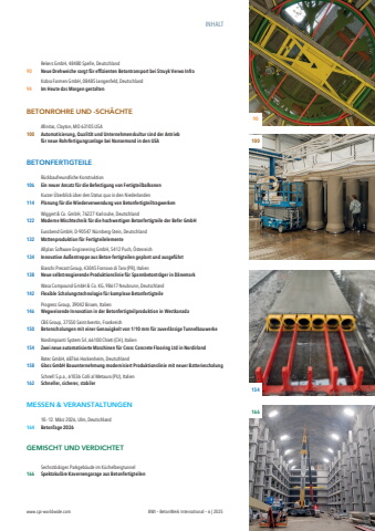 INHALTRekers GmbH, 48480 Spelle, Deutschland 90%u0009 Neue Drehweiche sorgt f%u00fcr effizienten Betontransport bei Struyk Verwo InfraKobra Formen GmbH, 08485 Lengenfeld, Deutschland 94 Im Heute das Morgen gestalten BETONROHRE UND -SCH%u00c4CHTEAfinitas, Clayton, MO 63105 USA100 Automatisierung, Qualit%u00e4t und Unternehmenskultur sind der Antrieb f%u00fcr neue Rohrfertigungsanlage bei Nansemond in den USABETONFERTIGTEILER%u00fcckbaufreundliche Konstruktion106 Ein neuer Ansatz f%u00fcr die Befestigung von FertigteilbalkonenKurzer %u00dcberblick %u00fcber den Status quo in den Niederlanden114 Planung f%u00fcr die Wiederverwendung von BetonfertigteiltragwerkenWiggert & Co. GmbH, 76227 Karlsruhe, Deutschland 122 Moderne Mischtechnik f%u00fcr die hochwertigen Betonfertigteile der Befer GmbHEurobend GmbH, D-90547 N%u00fcrnberg-Stein, Deutschland132 Mattenproduktion f%u00fcr FertigteilelementeAllplan Software Engineering GmbH, 5412 Puch, %u00d6sterreich134 Innovative Au%u00dfentreppe aus Beton-fertigteilen geplant und ausgef%u00fchrtBianchi Precast Group, 43045 Fornovo di Taro (PR), Italien138 Neue selbstreagierende Produktionslinie f%u00fcr Spannbetontr%u00e4ger in D%u00e4nemarkWasa Compound GmbH & Co. KG, 98617 Neubrunn, Deutschland 142 Flexible Schalungstechnologie f%u00fcr komplexe BetonfertigteileProgress Group, 39042 Brixen, Italien146 Wegweisende Innovation in der Betonfertigteilproduktion in WestkanadaCBE Group, 37550 Saint Avertin, Frankreich 150 Betonschalungen mit einer Genauigkeit von 1/10 mm f%u00fcr zuverl%u00e4ssige TunnelbauwerkeNordimpianti System Srl, 66100 Chieti (CH), Italien154 Zwei neue automatisierte Maschinen f%u00fcr Cross Concrete Flooring Ltd in NordirlandRatec GmbH, 68766 Hockenheim, Deutschland 158 Glass GmbH Bauunternehmung modernisiert Produktionslinie mit neuer Batterieschalung Schnell S.p.a., 61036 Colli al Metauro (PU), Italien162 Schneller, sicherer, stabiler MESSEN & VERANSTALTUNGEN10.-12. M%u00e4rz 2026, Ulm, Deutschland164 BetonTage 2026GEMISCHT UND VERDICHTETSechsst%u00f6ckiges Parkgeb%u00e4ude im K%u00fcchelbergtunnel 166 Spektakul%u00e4re Kavernengarage aus Betonfertigteilen90100www.cpi-worldwide.com BWI %u2013 BetonWerk International %u2013 6 | 2025154166