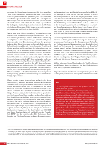 BETONTECHNOLOGIE50 BWI %u2013 BetonWerk International %u2013 6 | 2025 www.cpi-worldwide.comrechnung der Umweltauswirkungen mit Hilfe eines speziellen Tools. Das Cube-System erm%u00f6glicht es, hohe Qualit%u00e4tsstandards zu gew%u00e4hrleisten und gleichzeitig die CO2-Emissionen der Mischungen zu reduzieren. Sobald die Leistungen der Mischungen und ihre Konformit%u00e4t mit den Spezifikationen %u00fcberpr%u00fcft worden sind, untersucht das Mapei-Expertenteam f%u00fcr %u00f6kologische Nachhaltigkeit das Gemisch mit der Methode der Lebenszyklusanalyse (LCA), bewertet seine Umweltauswirkungen und ver%u00f6ffentlicht dann die EPD.Was ist unter einer %u201eLCA-Untersuchung%u201c zu verstehen und wie werden EPDs f%u00fcr Betonmischungen ver%u00f6ffentlicht? Die LCA bzw. Lebenszyklusanalyse ist eine Methode zur Bewertung der allgemeinen Umweltauswirkungen eines Produkts, eines Prozesses oder einer Dienstleistung w%u00e4hrend des gesamten Lebenszyklus. Diese Bewertung umfasst alle Stufen von der Rohstoffgewinnung %u00fcber die Herstellung, den Vertrieb und die Verwendung bis hin zum Ende der Lebensdauer und zur Entsorgung. Die LCA hilft bei der Ermittlung von Bereichen, in denen Emissionen, Ressourcenverbrauch und Abf%u00e4lle vermindert werden k%u00f6nnen. Sie bietet einen klaren und detaillierten %u00dcberblick %u00fcber die Umweltauswirkungen. Im Falle von Betonmischungen wird die LCA-Untersuchung bei konkreten Betonmischungen durchgef%u00fchrt, wobei Daten f%u00fcr jeden Prozessschritt gesammelt werden. Die LCA-Untersuchungen erm%u00f6glichen es uns, nicht nur den CO2-Fu%u00dfabdruck eines hergestellten Produkts (die sogenannten Treibhausgasemissionen, die f%u00fcr den Klimawandel verantwortlich sind) zu quantifizieren, sondern auch zahlreiche andere Auswirkungen wie Eutrophierung, photochemischen Smog und Rohstoffverknappung zu erfassen.Mapei ist das einzige Unternehmen weltweit, das diese Dienstleistung anbietet, was seine f%u00fchrende Rolle bei der Suche nach nachhaltigen Produkten f%u00fcr die Bauindustrie best%u00e4tigt. Seit vielen Jahren setzt sich Mapei daf%u00fcr ein, seine Produkte, Strukturen und Arbeitsabl%u00e4ufe nachhaltiger zu gestalten und dabei die Sicherheit sowohl der in der Branche t%u00e4tigen Personen als auch der Endverbraucher zu gew%u00e4hrleisten. Und zwar auf eine klare, messbare und zertifizierte Weise. Der Entwicklung nachhaltiger L%u00f6sungen widmet das Unternehmen einen betr%u00e4chtlichen Teil seiner Forschung und Entwicklung. Das hat im Laufe der Jahre zu wichtigen Ergebnissen gef%u00fchrt, wie z. B. zum Verzicht auf L%u00f6sungsmittel und zur Reduzierung fl%u00fcchtiger organischer Verbindungen (volatile organic compounds, VOCs) in den Rezepturen zahlreicher Produkte (ein Engagement, das durch Labels wie EMICODE und Blauer Engel zertifiziert ist); zur Einf%u00fchrung der Produktlinie ZERO*, die die verbleibenden CO2-Emissionen durch Projekte zur Wiederaufforstung und zum Schutz der Artenvielfalt ausgleicht; zur Ver%u00f6ffentlichung spezifischer EPDs f%u00fcr hochwertige Produkte (derzeit mehr als 300) und zu einem Nachhaltigkeitsbericht, der in den vergangenen zwei Jahren %u00fcber die weltweiten Aktivit%u00e4ten der Gruppe berichtet hat. Das Engagement von Mapei f%u00fcr Nachhaltigkeit zeigt sich auch in der Zertifizierung seiner Betriebsst%u00e4tten nach ISO 14001 und in der Verringerung der durch seine T%u00e4tigkeiten verursachten Umweltauswirkungen. So hat Mapei in den letzten Jahren stark in die Energieeffizienz seiner Produktionsanlagen investiert, indem es sie mit Photovoltaik- und Kraft-W%u00e4rme- sowie Kraft-W%u00e4rme-K%u00e4lte-Kopplungsanlagen ausstattete.Gleichzeitig liefert das Unternehmen der Bauindustrie innovative Technologien zur Optimierung der Herstellungsprozesse, zur Verringerung des Einsatzes neuer Rohstoffe, zur Verl%u00e4ngerung der Nutzungsdauer von Geb%u00e4uden (und damit zur Verringerung der Notwendigkeit, von Grund auf neu zu bauen) und zur Nutzung von Reststoffen aus verschiedenen Prozessen in neuen Herstellungszyklen. Das gilt nat%u00fcrlich auch f%u00fcr die Betonindustrie: Die M%u00f6glichkeit, EPDs f%u00fcr Mischungen zu erhalten, ist daher nur einer der j%u00fcngsten Schritte von Mapei auf dem Weg zur Nachhaltigkeit f%u00fcr Hersteller, die sich diesem Engagement anschlie%u00dfen.Welche L%u00f6sungen bietet Mapei neben der Ver%u00f6ffentlichung von EPDs den Betonherstellern an, die die CO2-Emissionen ihrer Mischungen reduzieren wollen?Mapei bietet den Herstellern ein integriertes System, das Cube-System, das es ihnen erm%u00f6glicht, die hohen Standards * Die CO2-Emissionen, die w%u00e4hrend des gesamten Lebenszyklus von Produkten aus der Zero-Linie im Jahr 2025 anhand der Lebenszyklusanalyse (LCA) gemessen und durch EPDs %u00fcberpr%u00fcft und zertifiziert wurden, konnten durch den Erwerb von Emissionszertifikaten zur Unterst%u00fctzung von Waldschutzprojekten kompensiert werden. Ein Engagement f%u00fcr den Planeten, f%u00fcr die Menschen und f%u00fcr die biologische Vielfalt. Weitere Informationen zur Berechnung von Emissionen und zu Klimaschutzprojekten, die %u00fcber Emissionszertifikate finanziert werden, finden man hier: www.mapei.com/de/de-de/ ueber-uns/nachhaltigkeit/nachhaltige-produkteEPDDie Umweltproduktdeklaration (EPD) ist eine Umweltdeklaration des Typs III:ein zertifiziertes Dokument, das transparente, vergleichbare und zuverl%u00e4ssige Informationen %u00fcber die Umweltauswirkungen eines Produkts w%u00e4hrend seines gesamten Lebenszyklus liefert. Eine nach internationalen Standards erstellte EPD ber%u00fccksichtigt eine Reihe von Faktoren wie z. B. den Energieverbrauch, die CO2-Emissionen, die Nutzung nat%u00fcrlicher Ressourcen und die Abfallerzeugung. Dies macht sie zu einem wichtigen Instrument f%u00fcr Unternehmen und Verbraucher, die die Umweltauswirkungen von Produkten bewerten, fundierte Entscheidungen treffen und nachhaltige Herstellungs- und Verbrauchspraktiken f%u00f6rdern wollen.