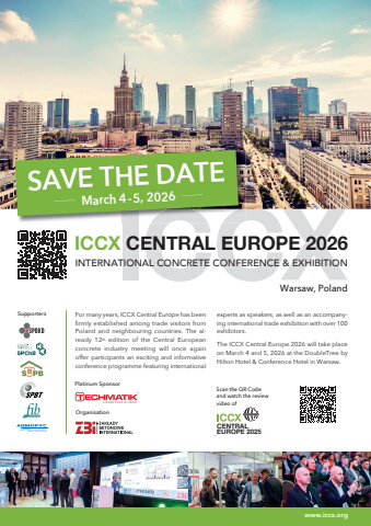 INTERNATIONAL CONCRETE CONFERENCE & EXHIBITIONICCX CENTRAL EUROPE 2026For many years, ICCX Central Europe has been firmly established among trade visitors from Poland and neighbouring countries. The already 12th edition of the Central European concrete industry meeting will once again offer participants an exciting and informative conference programme featuring international experts as speakers, as well as an accompanying international trade exhibition with over 100 exhibitors.The ICCX Central Europe 2026 will take place on March 4 and 5, 2026 at the DoubleTree by Hilton Hotel & Conference Hotel in Warsaw._ March 4 - 5, 2026SAVE THE DATE _Warsaw, PolandOrganisationScan the QR Codeand watch the reviewvideo ofCENTRALEUROPE 2025Platinum Sponsorwww.iccx.org Supporters
