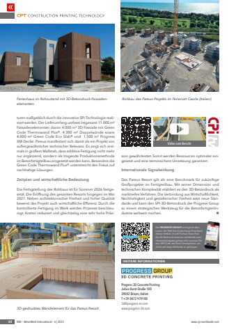 64 BWI %u2013 BetonWerk International %u2013 6 | 2025 www.cpi-worldwide.comWEITERE INFORMATIONENProgress 3D Concrete PrintingJulius-Durst-Stra%u00dfe 10039042 Brixen, ItalienT +39 0472 9791003d@progress-m.comwww.progress-3d.comDie PROGRESS GROUP erm%u00f6glicht allen Lesern der BWI den kostenlosen Download dieses Artikels im pdf-Format. Besuchen Sie die Webseite www.cpi-worldwide.com/channels/progress-group oder scannen Sie den QR-Code mit Ihrem Smartphone, um direkt auf diese Webseite zu gelangen.turen ma%u00dfgeblich durch die innovative SPI-Technologie realisiert werden. Der Lieferumfang umfasst insgesamt 11.000 m%u00b2 Fassadenelementen davon 4.000 m%u00b2 3D-Fassade mit Green Code Thermowand Plus%u00ae, 4.300 m%u00b2 Doppelw%u00e4nde sowie 4.000 m%u00b2 Green Code Eco Slab%u00ae und 1.500 m%u00b2 Progress XM-Decke. Pareus manifestiert sich damit als ein Projekt von au%u00dfergew%u00f6hnlicher technischer Relevanz. Es zeigt sich erstmals in gro%u00dfem Ma%u00dfstab, dass additive Fertigung nicht mehr nur erg%u00e4nzend, sondern als tragende Produktionsmethode im Betonfertigteilbau eingesetzt werden kann. Besonders die Green Code Thermowand Plus%u00ae unterstreicht den Fokus auf nachhaltige L%u00f6sungen.Zeitplan und wirtschaftliche BedeutungDie Fertigstellung des Rohbaus ist f%u00fcr Sommer 2026 festgesetzt. Die Er%u00f6ffnung des gesamten Resorts hingegen im Mai 2027. Neben architektonischer Freiheit und hoher Qualit%u00e4t beweist das Projekt auch wirtschaftliche Effizienz. Durch die kontrollierte Fertigung im Werk werden Prozesse beschleunigt, Kosten reduziert und gleichzeitig eine sehr hohe Pr%u00e4zision gew%u00e4hrleistet. Somit werden Ressourcen optimaler eingesetzt und eine terminsichere Umsetzung garantiert.Internationale SignalwirkungDas Pareus Resort gilt als eine Benchmark f%u00fcr zuk%u00fcnftige Gro%u00dfprojekte im Fertigteilbau. Mit seiner Dimension und technischen Komplexit%u00e4t etabliert es den 3D-Betondruck als marktreifes Verfahren. Die Verbindung aus Wirtschaftlichkeit, Nachhaltigkeit und gestalterischer Freiheit setzt neue Standards und kann den SPI-3D-Betondruck der Progress Group zu einem strategischen Werkzeug f%u00fcr die Betonfertigteilindustrie weltweit machen. nFerienhaus im Rohzustand mit 3D-Betondruck-Fassadenelementen Rohbau des Pareus-Projekts im Ferienort Caorle (Italien)3D-gedrucktes Wandelement f%u00fcr das Pareus ResortVideo zum Bericht