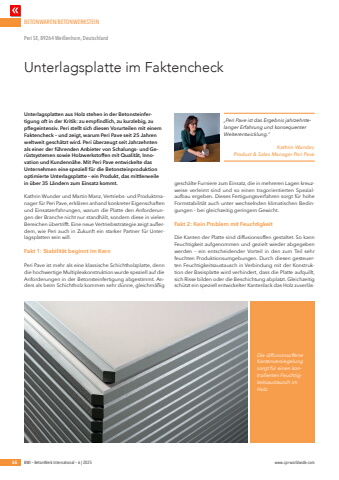 BETONWAREN/BETONWERKSTEIN66 BWI %u2013 BetonWerk International %u2013 6 | 2025 www.cpi-worldwide.comUnterlagsplatten aus Holz stehen in der Betonsteinfertigung oft in der Kritik: zu empfindlich, zu kurzlebig, zu pflegeintensiv. Peri stellt sich diesen Vorurteilen mit einem Faktencheck %u2013 und zeigt, warum Peri Pave seit 25 Jahren weltweit gesch%u00e4tzt wird. Peri %u00fcberzeugt seit Jahrzehnten als einer der f%u00fchrenden Anbieter von Schalungs- und Ger%u00fcstsystemen sowie Holzwerkstoffen mit Qualit%u00e4t, Innovation und Kundenn%u00e4he. Mit Peri Pave entwickelte das Unternehmen eine speziell f%u00fcr die Betonsteinproduktion optimierte Unterlagsplatte %u2013 ein Produkt, das mittlerweile in %u00fcber 35 L%u00e4ndern zum Einsatz kommt. Kathrin Wunder und Martin Manz, Vertriebs- und Produktmanager f%u00fcr Peri Pave, erkl%u00e4ren anhand konkreter Eigenschaften und Einsatzerfahrungen, warum die Platte den Anforderungen der Branche nicht nur standh%u00e4lt, sondern diese in vielen Bereichen %u00fcbertrifft. Eine neue Vertriebsstrategie zeigt au%u00dferdem, wie Peri auch in Zukunft ein starker Partner f%u00fcr Unterlagsplatten sein will. Fakt 1: Stabilit%u00e4t beginnt im Kern Peri Pave ist mehr als eine klassische Schichtholzplatte, denn die hochwertige Multiplexkonstruktion wurde speziell auf die Anforderungen in der Betonsteinfertigung abgestimmt. Anders als beim Schichtholz kommen sehr d%u00fcnne, gleichm%u00e4%u00dfig gesch%u00e4lte Furniere zum Einsatz, die in mehreren Lagen kreuzweise verleimt sind und so einen tragorientierten Spezialaufbau ergeben. Dieses Fertigungsverfahren sorgt f%u00fcr hohe Formstabilit%u00e4t auch unter wechselnden klimatischen Bedingungen %u2013 bei gleichzeitig geringem Gewicht. Fakt 2: Kein Problem mit Feuchtigkeit Die Kanten der Platte sind diffusionsoffen gestaltet. So kann Feuchtigkeit aufgenommen und gezielt wieder abgegeben werden %u2013 ein entscheidender Vorteil in den zum Teil sehr feuchten Produktionsumgebungen. Durch diesen gesteuerten Feuchtigkeitsaustausch in Verbindung mit der Konstruktion der Basisplatte wird verhindert, dass die Platte aufquillt, sich Risse bilden oder die Beschichtung abplatzt. Gleichzeitig sch%u00fctzt ein speziell entwickelter Kantenlack das Holz zuverl%u00e4sUnterlagsplatte im FaktencheckPeri SE, 89264 Wei%u00dfenhorn, Deutschland %u201ePeri Pave ist das Ergebnis jahrzehntelanger Erfahrung und konsequenter Weiterentwicklung.%u201c Kathrin Wunder, Product & Sales Manager Peri Pave Die diffusionsoffene Kantenversiegelung sorgt f%u00fcr einen kontrollierten Feuchtigkeitsaustausch im Holz.
