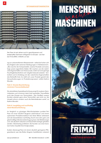 BETONWAREN/BETONWERKSTEINwww.cpi-worldwide.com BWI %u2013 BetonWerk International %u2013 6 | 2025sig vor unkontrolliertem Wassereintritt %u2013 selbst bei hoher Luftfeuchtigkeit oder extremen Bedingungen in H%u00e4rtekammern. %u201eWo manche die Schwachstelle unseres Produkts vermuten, liegt unsere eigentliche St%u00e4rke: Wir machen uns die nat%u00fcrlichen Eigenschaften von Holz zunutze, indem wir eine geringe Feuchtigkeitsaufnahme und -abgabe bewusst zulassen %u2013 kontrolliert und im Einklang mit den nat%u00fcrlichen Eigenschaften des Rohstoffs Holz. So stellt sich unser Produkt gezielt den Herausforderungen im Produktionsprozess%u201c, erkl%u00e4rt Kathrin Wunder. Fakt 3: Smarte Beschichtung minimiert Trennmittelbedarf Die abriebfeste Spezialbeschichtung sorgt f%u00fcr saubere Steinr%u00fcckseiten und minimiert dank ihres speziellen Trenneffekts auch den Einsatz von Trennmitteln. %u201eDer Gro%u00dfteil unserer Kunden arbeitet ganz ohne Trennmittel, was nicht nur die Umwelt schont, sondern auch die Betriebskosten senkt%u201c, so Kathrin Wunder. Fakt 4: Langlebig und nachhaltig dank Neubeschichtung Im Vergleich zu g%u00fcnstigen Weichholzplatten punktet Peri Pave mit einer deutlich l%u00e4ngeren Lebensdauer und einem optimierten Produktionsablauf. Auf diese Weise verbessert sich die Gesamtbilanz nachhaltig. Durch eine sehr gute und gleichm%u00e4%u00dfige Vibrations%u00fcbertragung kann die R%u00fcttelenergie und -zeit deutlich reduziert und dauerhaft niedriger gehalten werden. Gleichzeitig profitieren die Kunden von einer konstant hohen Qualit%u00e4t ihrer Endprodukte. Zudem %u00fcberzeugt Pave mit einem deutlich geringeren Pflegeaufwand, was das Risiko l%u00e4ngerer Ausfallzeiten reduziert Peri Pave ist seit Jahren auch in geschlossenen und bedampften Kammern erfolgreich im Einsatz %u2013 wie hier bei Firma BWL in W%u00f6rth a.d. Isar.MENSCHENMASCHINEN machenwww.frima-emden.de