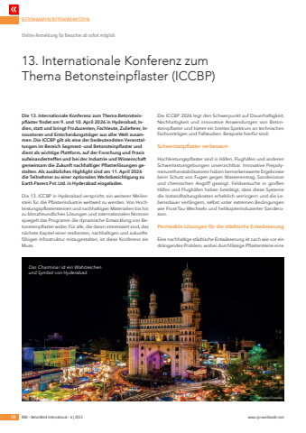 BETONWAREN/BETONWERKSTEIN70 BWI %u2013 BetonWerk International %u2013 6 | 2025 www.cpi-worldwide.comDie 13. Internationale Konferenz zum Thema Betonsteinpflaster findet am 9. und 10. April 2026 in Hyderabad, Indien, statt und bringt Produzenten, Fachleute, Zulieferer, Innovatoren und Entscheidungstr%u00e4ger aus aller Welt zusammen. Die ICCBP gilt als eine der bedeutendsten Veranstaltungen im Bereich Segment- und Betonsteinpflaster und dient als wichtige Plattform, auf der Forschung und Praxis aufeinandertreffen und bei der Industrie und Wissenschaft gemeinsam die Zukunft nachhaltiger Pflasterl%u00f6sungen gestalten. Als zus%u00e4tzliches Highlight sind am 11. April 2026 die Teilnehmer zu einer optionalen Werksbesichtigung zu Earth Pavers Pvt. Ltd. in Hyderabad eingeladen.Die 13. ICCBP in Hyderabad verspricht, ein weiterer Meilenstein f%u00fcr die Pflasterindustrie weltweit zu werden. Von Hochleistungspflastersteinen und nachhaltigen Materialien bis hin zu klimafreundlichen L%u00f6sungen und internationalen Normen spiegelt das Programm die dynamische Entwicklung von Betonsteinpflaster wider. F%u00fcr alle, die daran interessiert sind, das n%u00e4chste Kapitel einer resilienten, nachhaltigen und zukunftsf%u00e4higen Infrastruktur mitzugestalten, ist diese Konferenz ein Muss.Die ICCBP 2026 legt den Schwerpunkt auf Dauerhaftigkeit, Nachhaltigkeit und innovative Anwendungen von Betonsteinpflaster und bietet ein breites Spektrum an technischen Fachvortr%u00e4gen und Fallstudien. Beispiele hierf%u00fcr sind:Schwerlastpflaster verbessernHochleistungspflaster sind in H%u00e4fen, Flugh%u00e4fen und anderen Schwerlastumgebungen unverzichtbar. Innovative Prepolymerurethanstabilisatoren haben bemerkenswerte Ergebnisse beim Schutz von Fugen gegen Wassereintrag, Sanderosion und chemischen Angriff gezeigt. Feldversuche in gro%u00dfen H%u00e4fen und Flugh%u00e4fen haben best%u00e4tigt, dass diese Systeme die Instandhaltungskosten erheblich verringern und die Lebensdauer verl%u00e4ngern, selbst unter extremen Bedingungen wie Frost-Tau-Wechseln und helikopterinduzierter Sanderosion.Permeable L%u00f6sungen f%u00fcr die st%u00e4dtische Entw%u00e4sserungEine nachhaltige st%u00e4dtische Entw%u00e4sserung ist nach wie vor ein dr%u00e4ngendes Problem, wobei durchl%u00e4ssige Pflastersteine eine 13. Internationale Konferenz zum Thema Betonsteinpflaster (ICCBP)Online-Anmeldung f%u00fcr Besucher ab sofort m%u00f6glichDas Charminar ist ein Wahrzeichen und Symbol von Hyderabad.%u00a9Prudhvi Chowdary