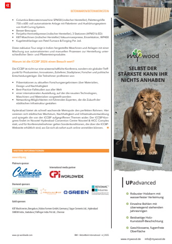 BETONWAREN/BETONWERKSTEINwww.cpi-worldwide.com BWI %u2013 BetonWerk International %u2013 6 | 2025WEITERE INFORMATIONENwww.iccbp.orgPlatinum sponsorDiamond sponsorsGold sponsorsKBT Machineries, Bengaluru | Kobra Formen GmbH, Germany | Sagar Cements Ltd., Hyderabad SIMEM India , Vadodara | Palfinger India Pvt Ltd., ChennaiInternational media partner%u2022 Columbia-Betonsteinmaschine SPM30 (indischer Hersteller), Palettengr%u00f6%u00dfe 750 x 600: voll automatisierte Anlage mit Paketierer und Aush%u00e4rtungssystem von Kraft Curing System.%u2022 Besser-Bescopac%u2022 Parijatha-Hermetikpresse (indischer Hersteller), 3 Stationen (APM316 ED)%u2022 KBT-Maschinen (indischer Hersteller) Vakuumnasspresse, Einzelstation, WP400%u2022 Kugelstrahlanlage von Patel Furnace & Forging Pvt. Ltd.Diese exklusive Tour zeigt in Indien hergestellte Maschinen und Anlagen mit einer Mischung aus automatisierten und manuellen Prozessen zur Herstellung unterschiedlicher Stein- und Pflastersteinprodukte.Warum ist die ICCBP 2026 einen Besuch wert?Die ICCBP ist nicht nur eine wissenschaftliche Konferenz, sondern ein globaler Treffpunkt f%u00fcr Produzenten, Innovatoren, Zulieferer, Stadtplaner, Forscher und politische Entscheidungstr%u00e4ger. Die Teilnehmer profitieren von:%u2022 Pr%u00e4sentationen zu aktuellen Forschungsergebnissen %u00fcber Materialien, Design und Nachhaltigkeit%u2022 Best-Practice-Fallstudien aus aller Welt%u2022 einer internationalen Ausstellung, auf der die neusten Technologien, Maschinen und Materialien vorgestellt werden%u2022 Networking-M%u00f6glichkeiten mit f%u00fchrenden Experten, die die Zukunft der st%u00e4dtischen Infrastruktur gestaltenHyderabad bietet als schnell wachsende Metropole den perfekten Rahmen. Hier vereinen sich st%u00e4dtisches Wachstum, Nachhaltigkeit und Infrastrukturentwicklung und spiegeln die von der ICCBP aufgegriffenen Themen wider. Der ICCBP-Kongress findet im Novotel Hyderabad Convention Centre Novotel & HICC Complex statt, und f%u00fcr Konferenzteilnehmer gelten Sonderkonditionen, die %u00fcber die ICCBPWebseite erh%u00e4ltlich sind, wo Sie sich ab sofort auch online anmelden k%u00f6nnen. nSELBST DER ST%u00c4RKSTE KANN IHR NICHTS%u00a0ANHABENwww.mywood.de info@mywood.deUPadvancedRobuster Holzkern mit wasserfester VerleimungEinzelne Bohlen mit %u00fcberwiegend stehenden JahresringenBeidseitige HolzKunststoff-BeschichtungGeschlossene, fugenfreie Oberfl%u00e4che